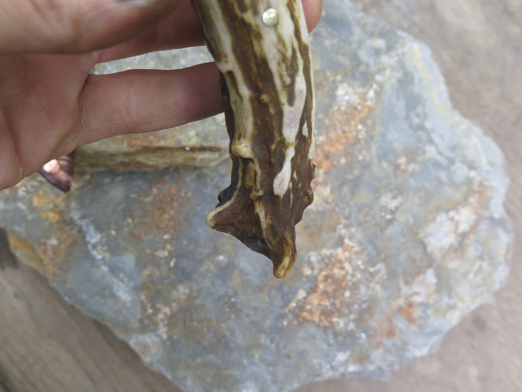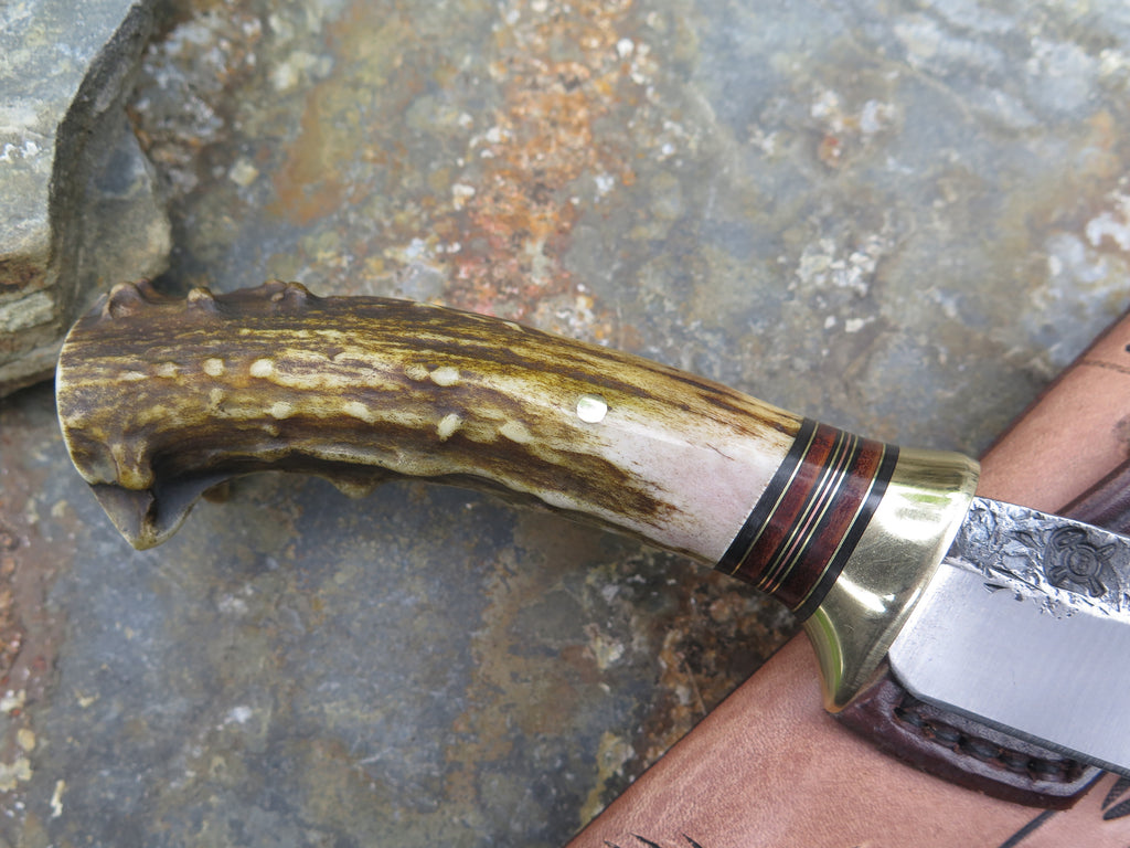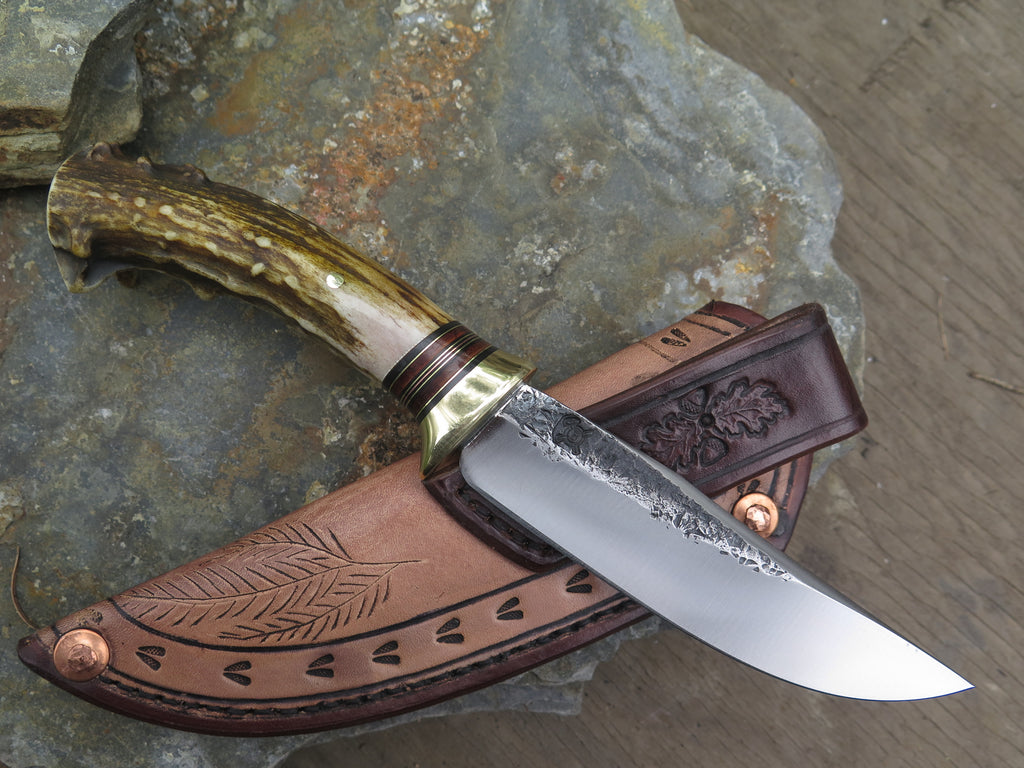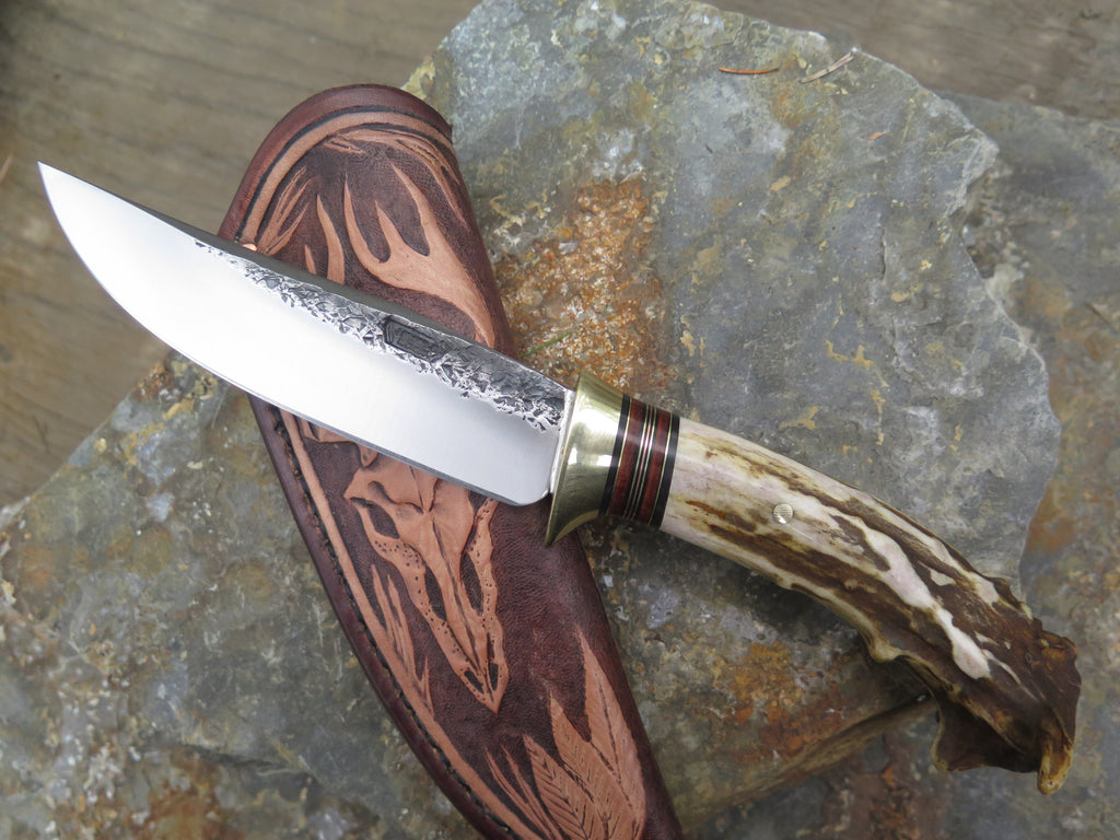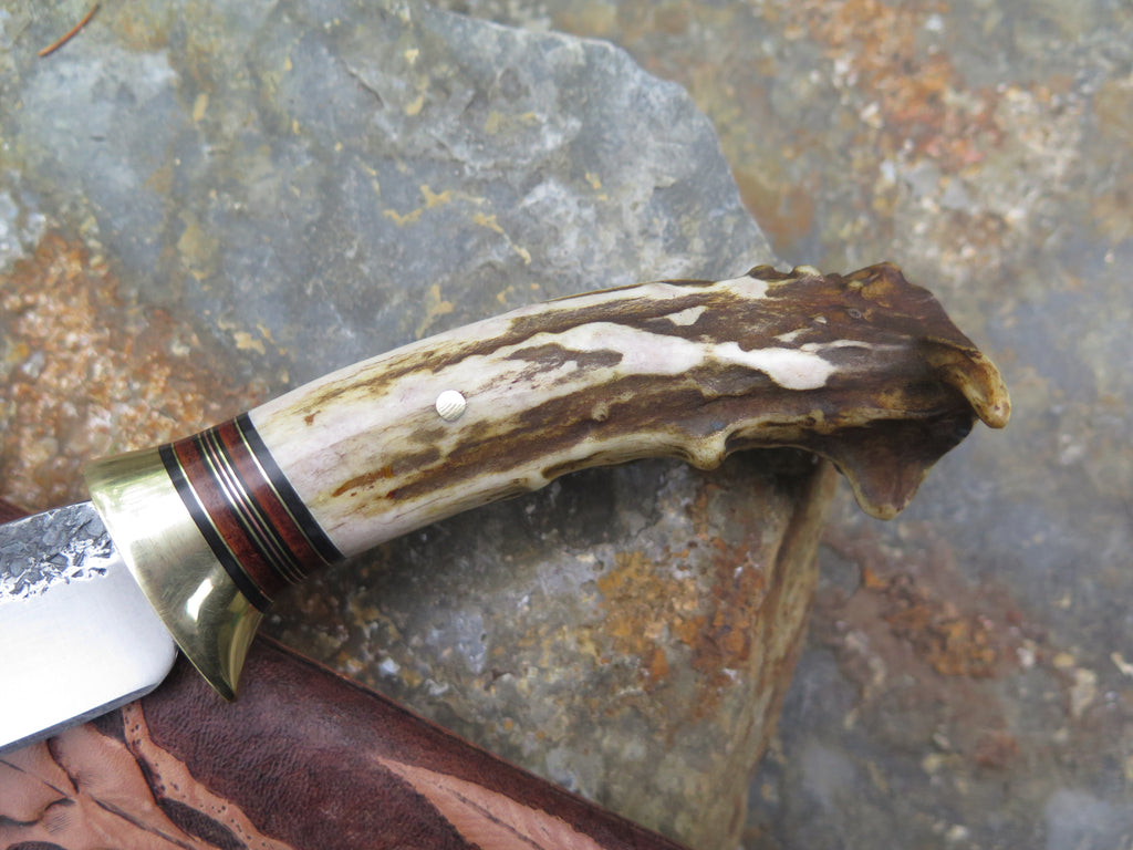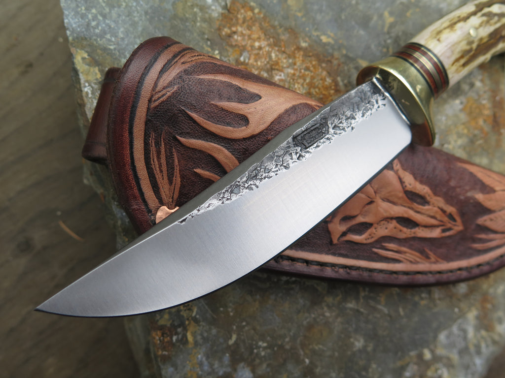 This bad ass new Hunter from Behring Made© is hand forged out of 3/16" thick high carbon 01 tool steel and it measures 5" from tip to guard with a razor sharp hollow grind and our hammermark finish. The brass guard is soldered in place above black fiber, brass, copper and horsehide leather spacers as well as a beautifully seasoned whitetail handle that's pinned through the tang with brass. The feel in hand is incredible too! The overall length measures 9 1/2" and it comes in a whitetail skull pouch from Mudbone Jones.