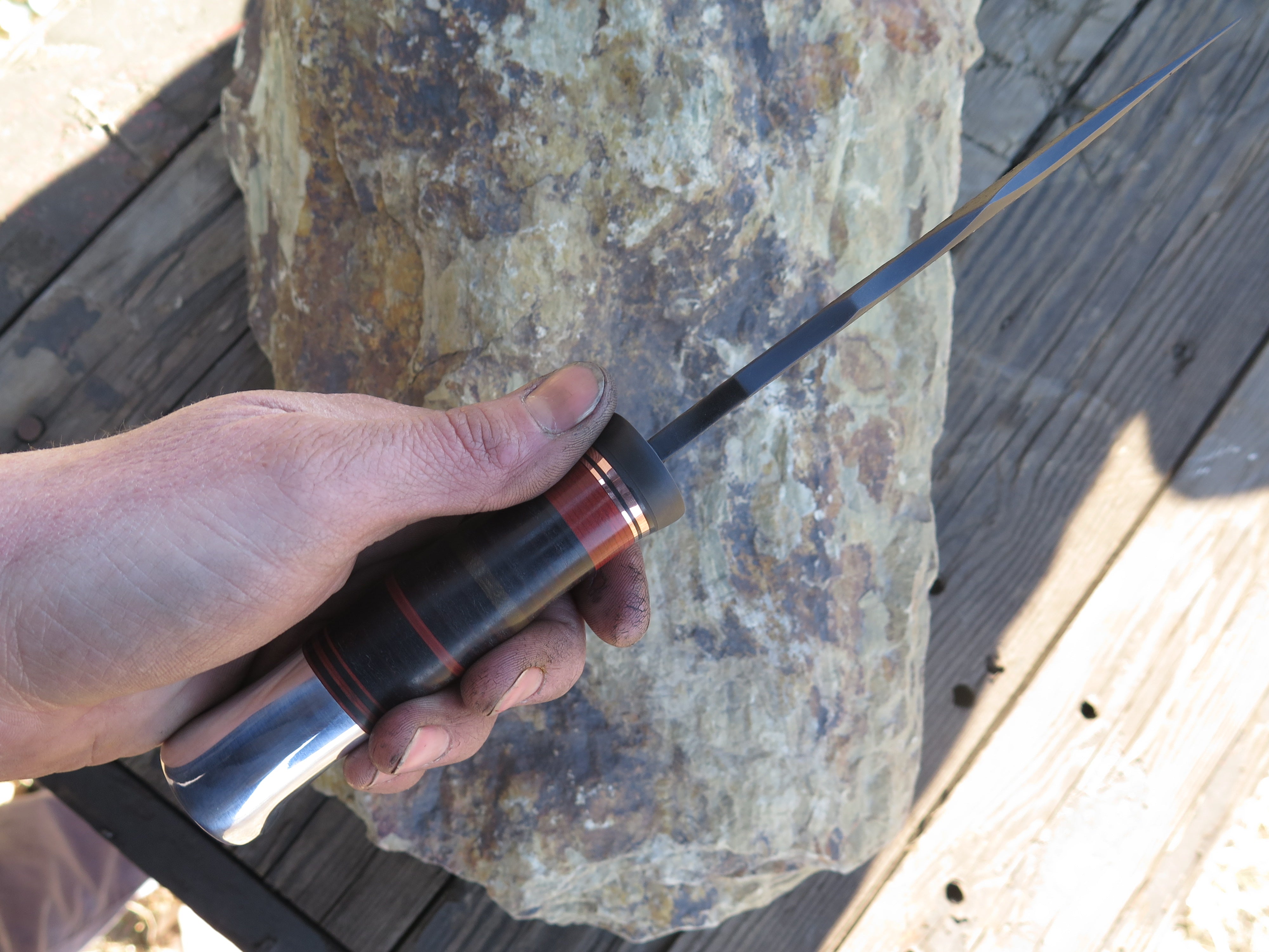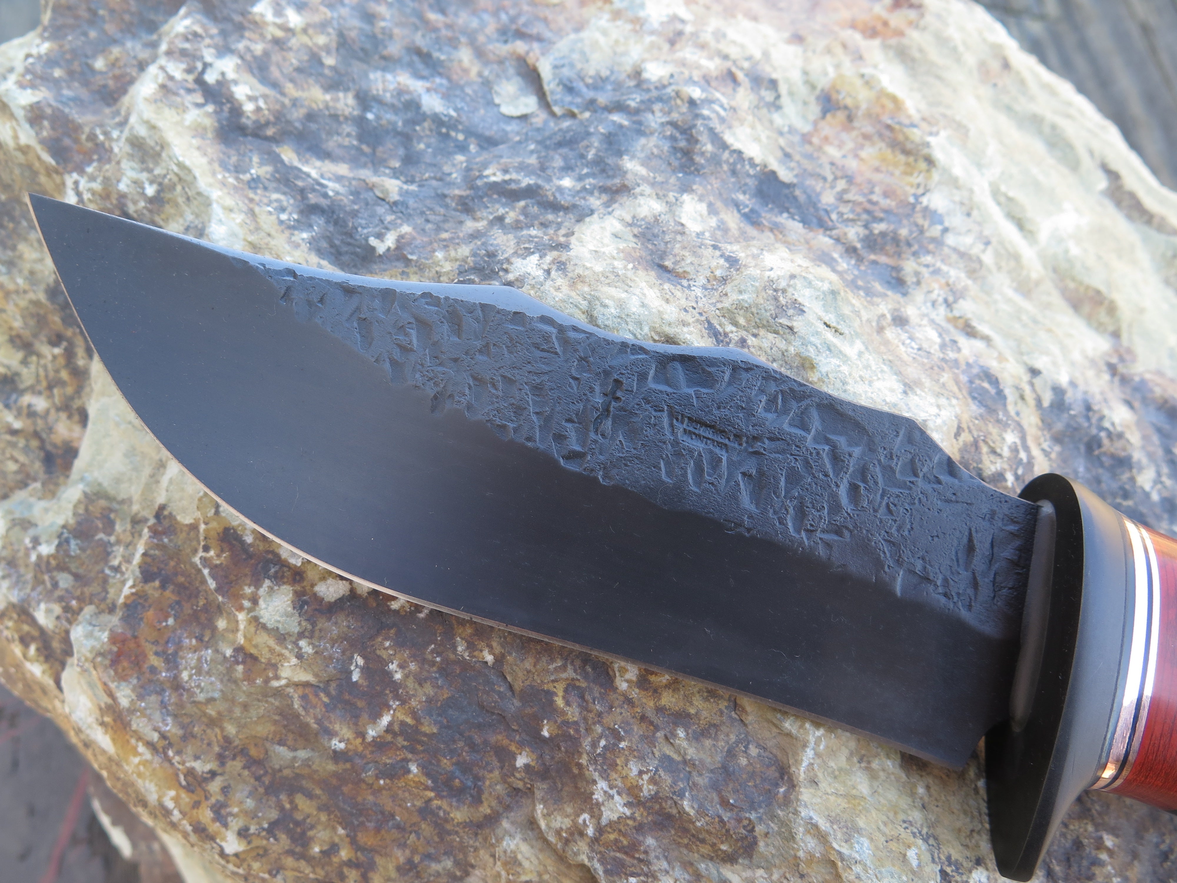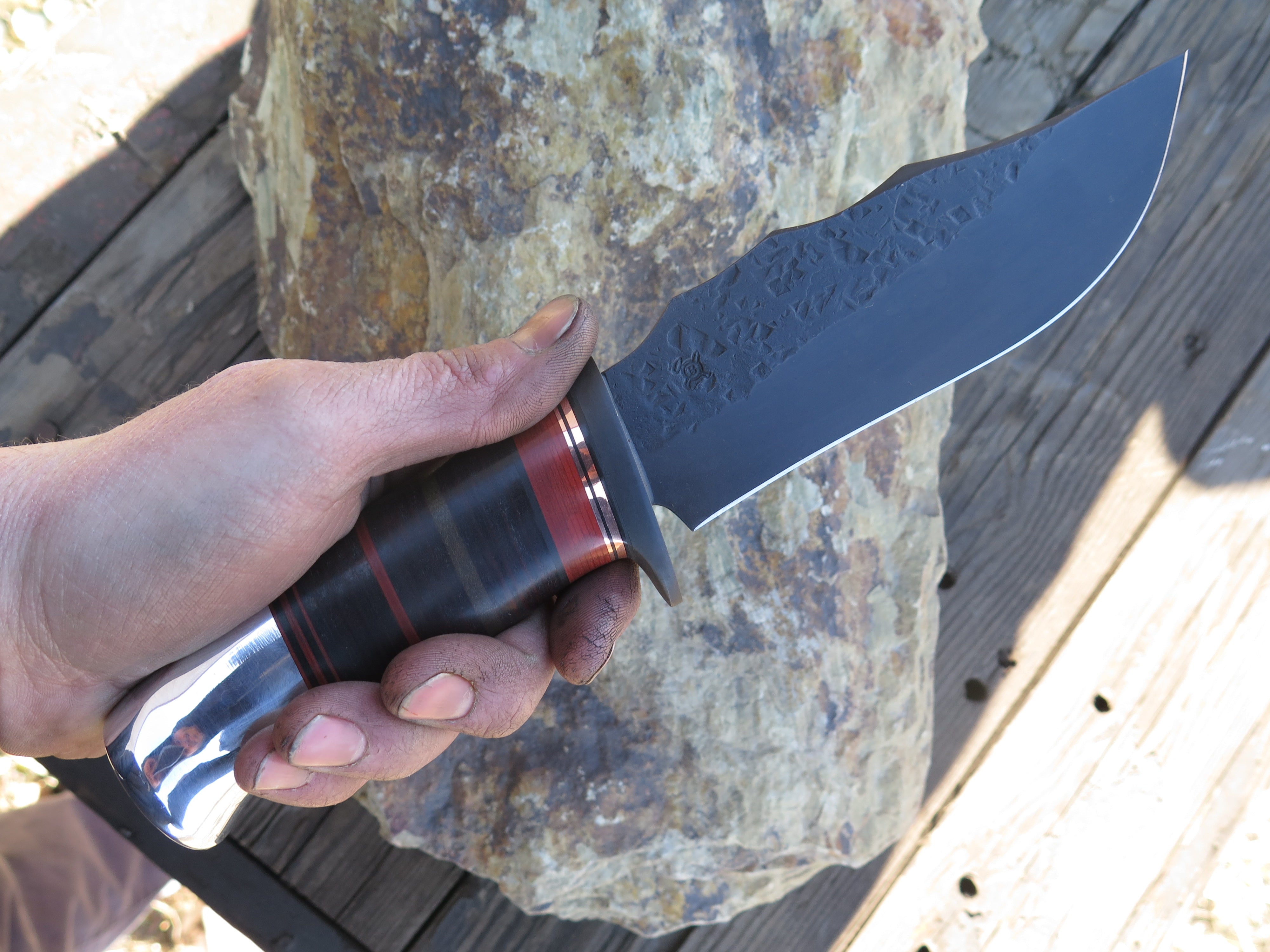 This new Scagel Tribute is hand forged from 13/64" thick 5160 spring steel and it measures 6" from tip to guard with a razor sharp hollow grind, hammermarks and our forced patina blued finish. The blued steel guard is soldered in place above black and maroon fiber, green micarta, copper and chocolate horsehide leather spacers as well as a big aluminum butt that's also pinned through the tang with aluminum. The overall length measures 10 5/8" and it will come in a custom leather sheath in the style of your choosing.