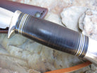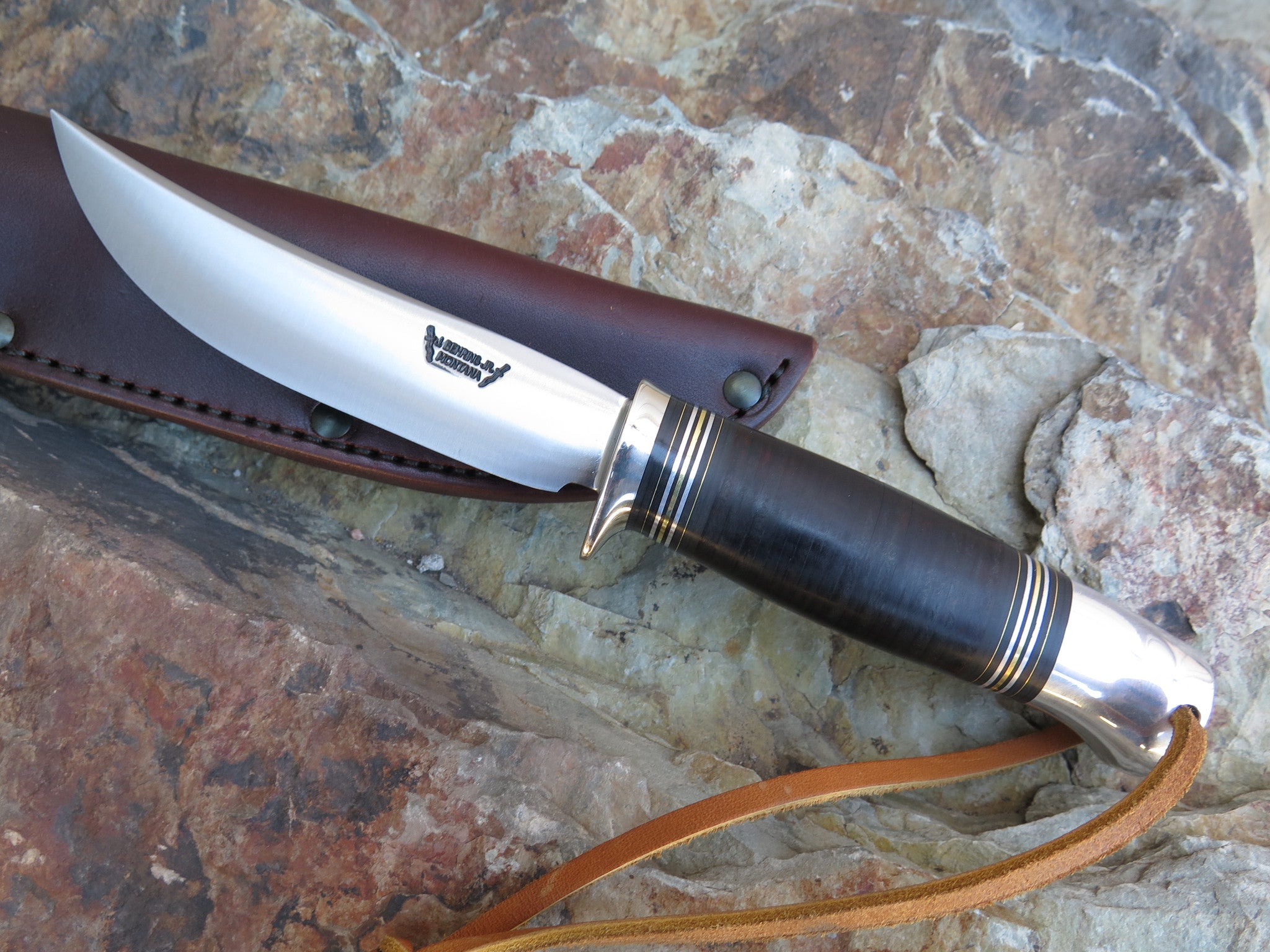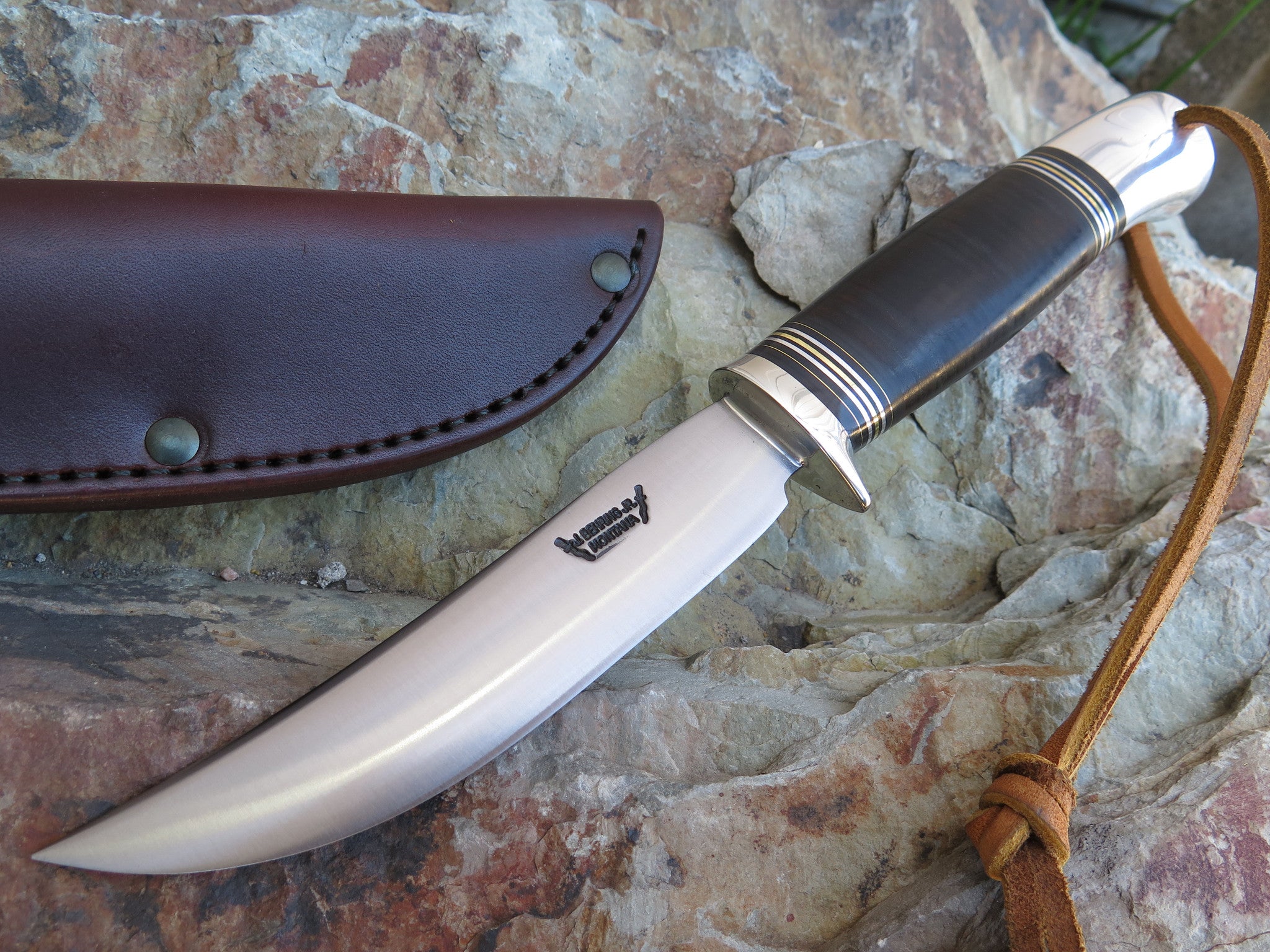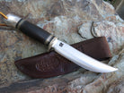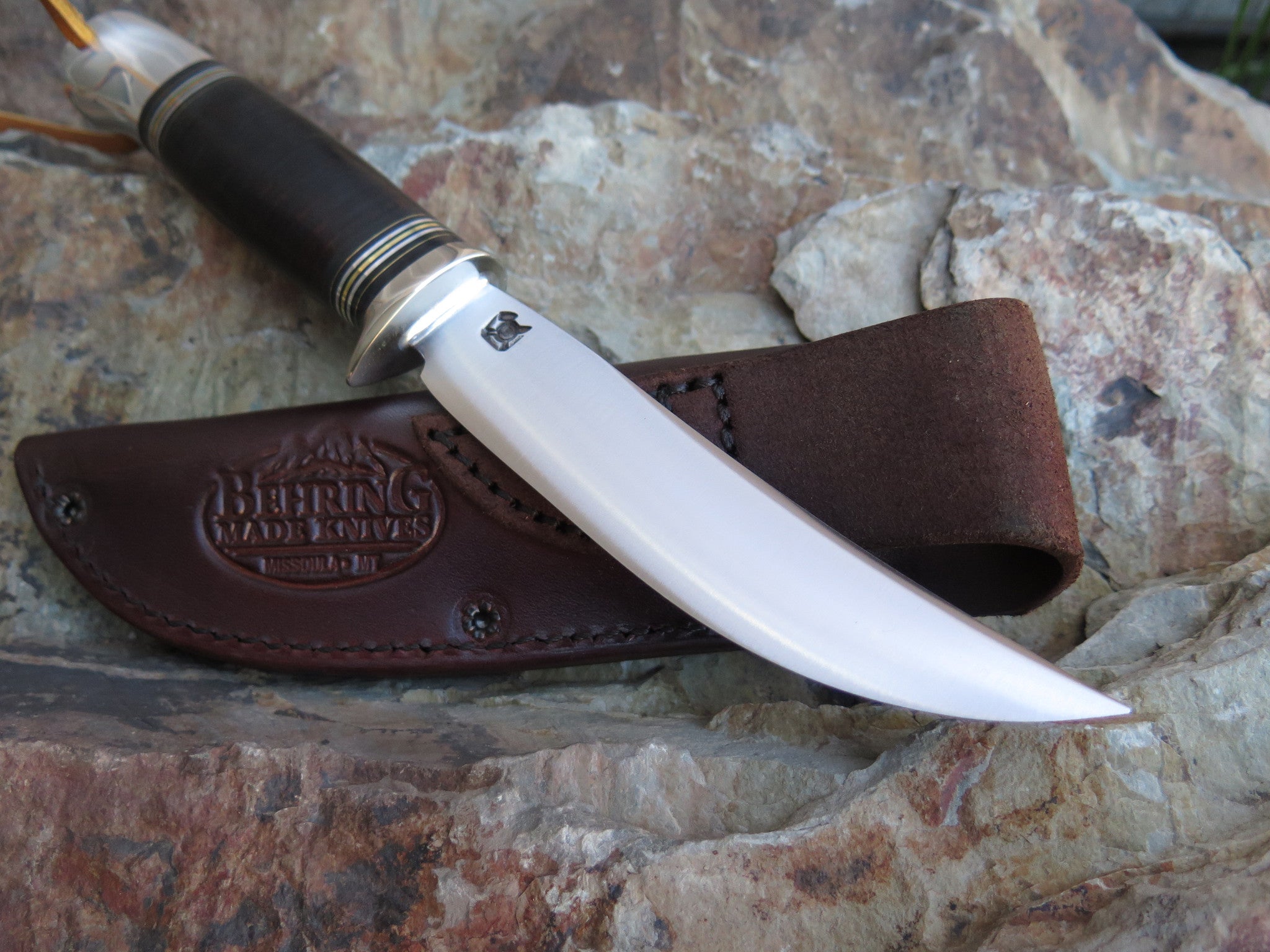 This Behring Made trout & bird is hand forged from 1/8" thick high carbon 01 tool steel and measures 5" from tip to guard. The nickel silver guard is hand soldered in place above black, brass, aluminum and premium horsehide spacers as well as an aluminum butt with a leather lanyard. The overall length measures 9 1/4" and it comes in a Behring Made pouch sheath.