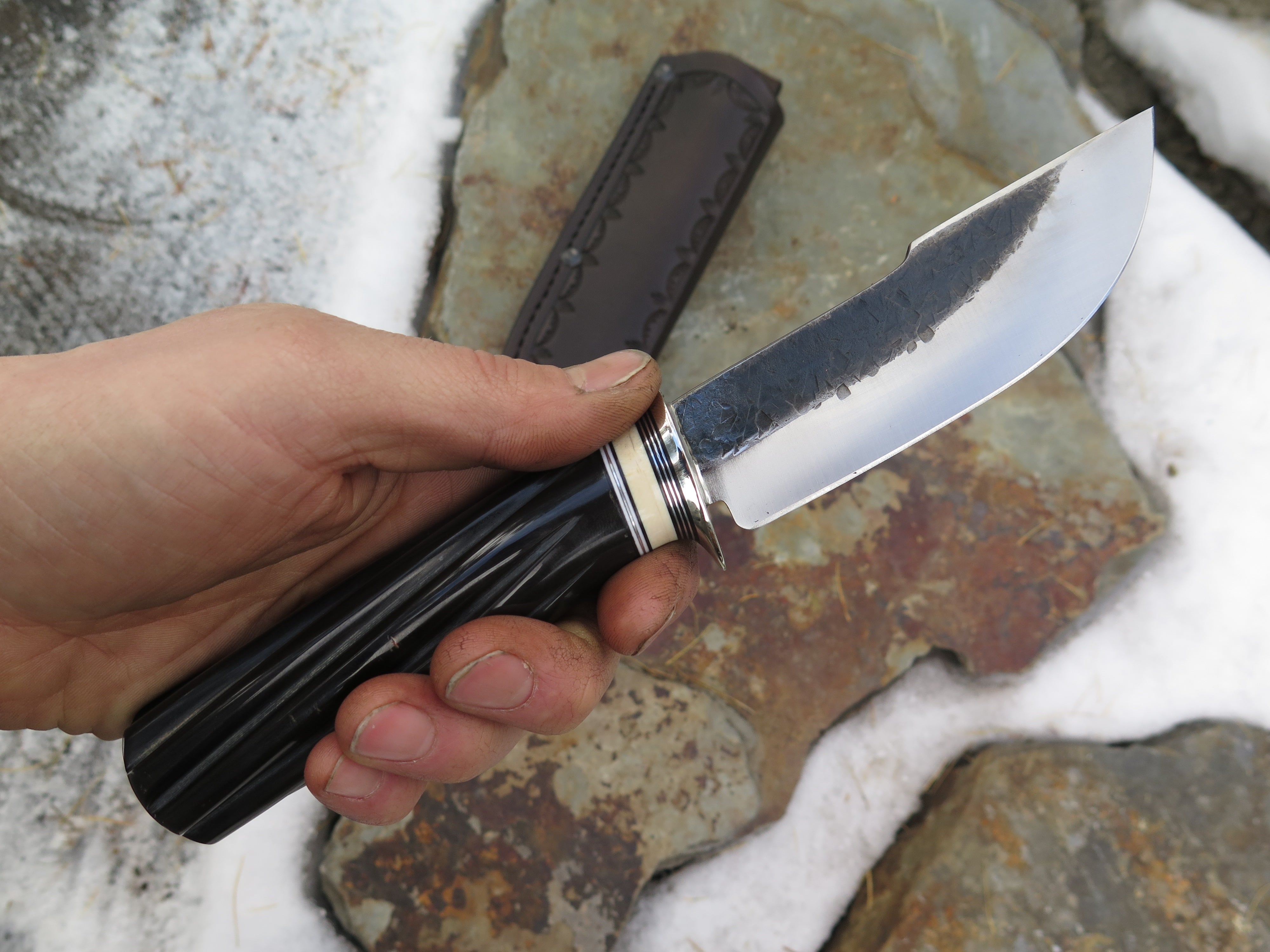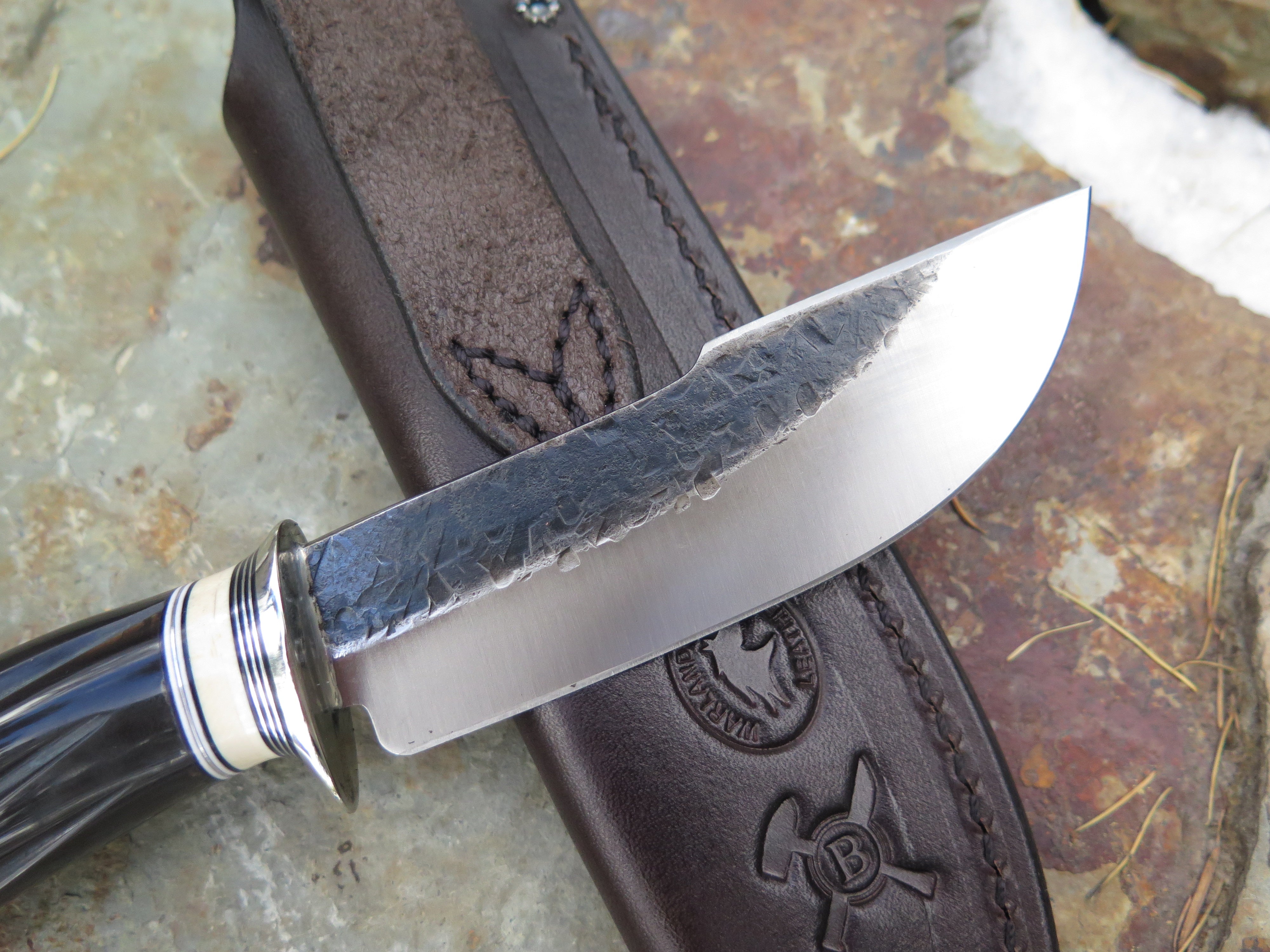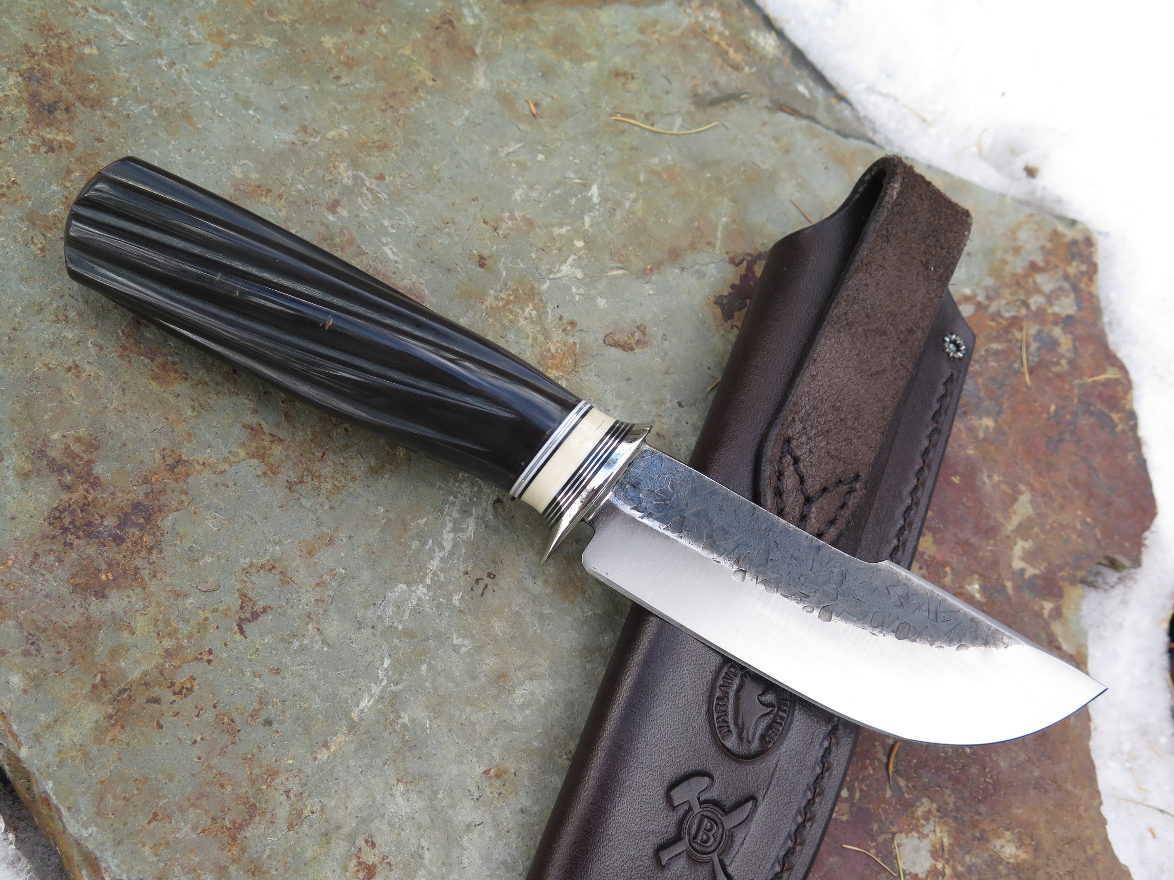 This beautiful new Woodcraft from Behring Made© is hand forged from 1/8" thick high carbon 01 tool steel and measures 4 1/2" from tip to guard with a razor sharp hollow grind and our hammermark finish. The nickel silver guard is soldered in place above black and white fiber, aluminum and ancient mammoth ivory spacers as well as a jigged African buffalo handle. The overall length measures 9" and it comes in the shown leather belt pouch sheath, though substitutions are available upon request.