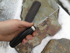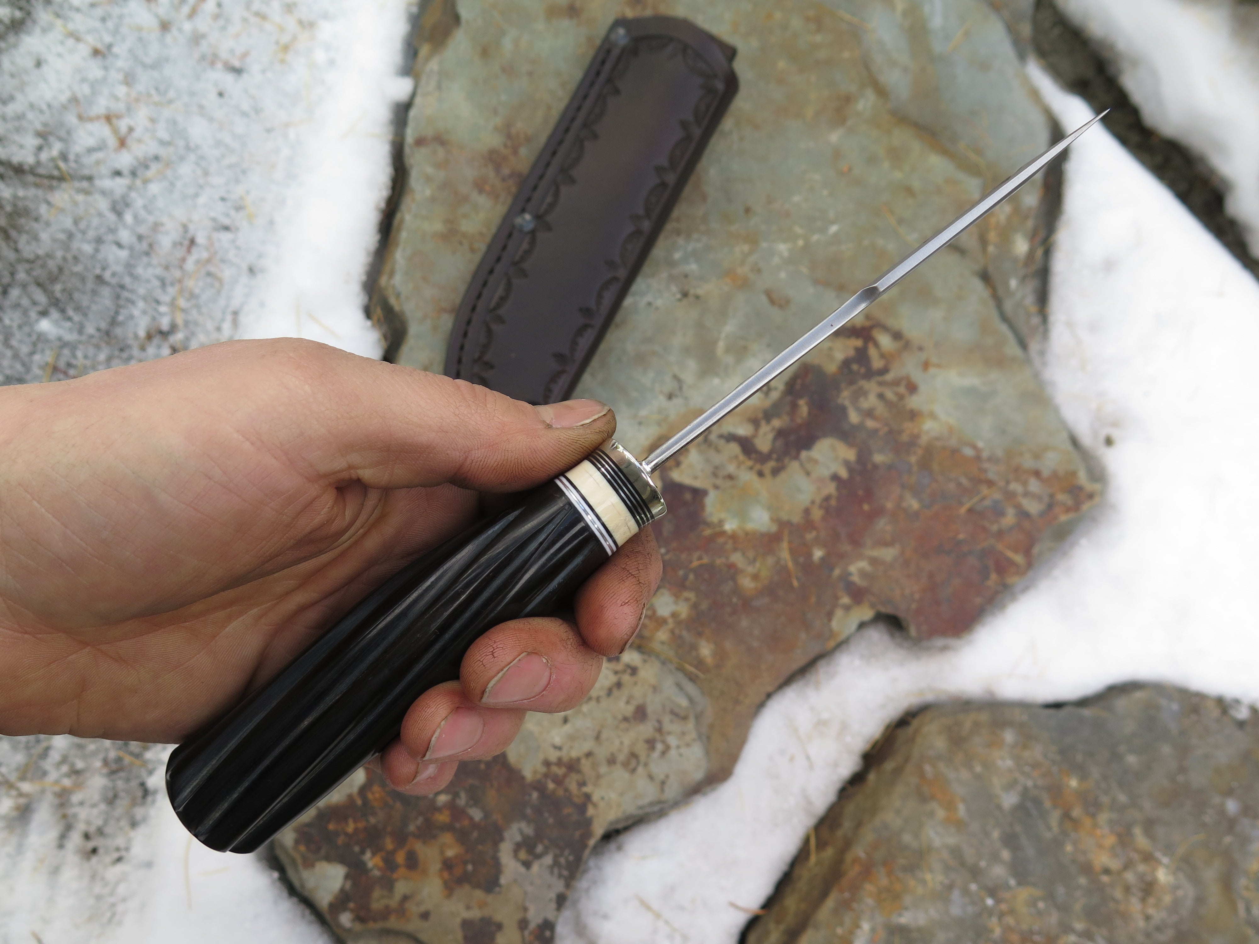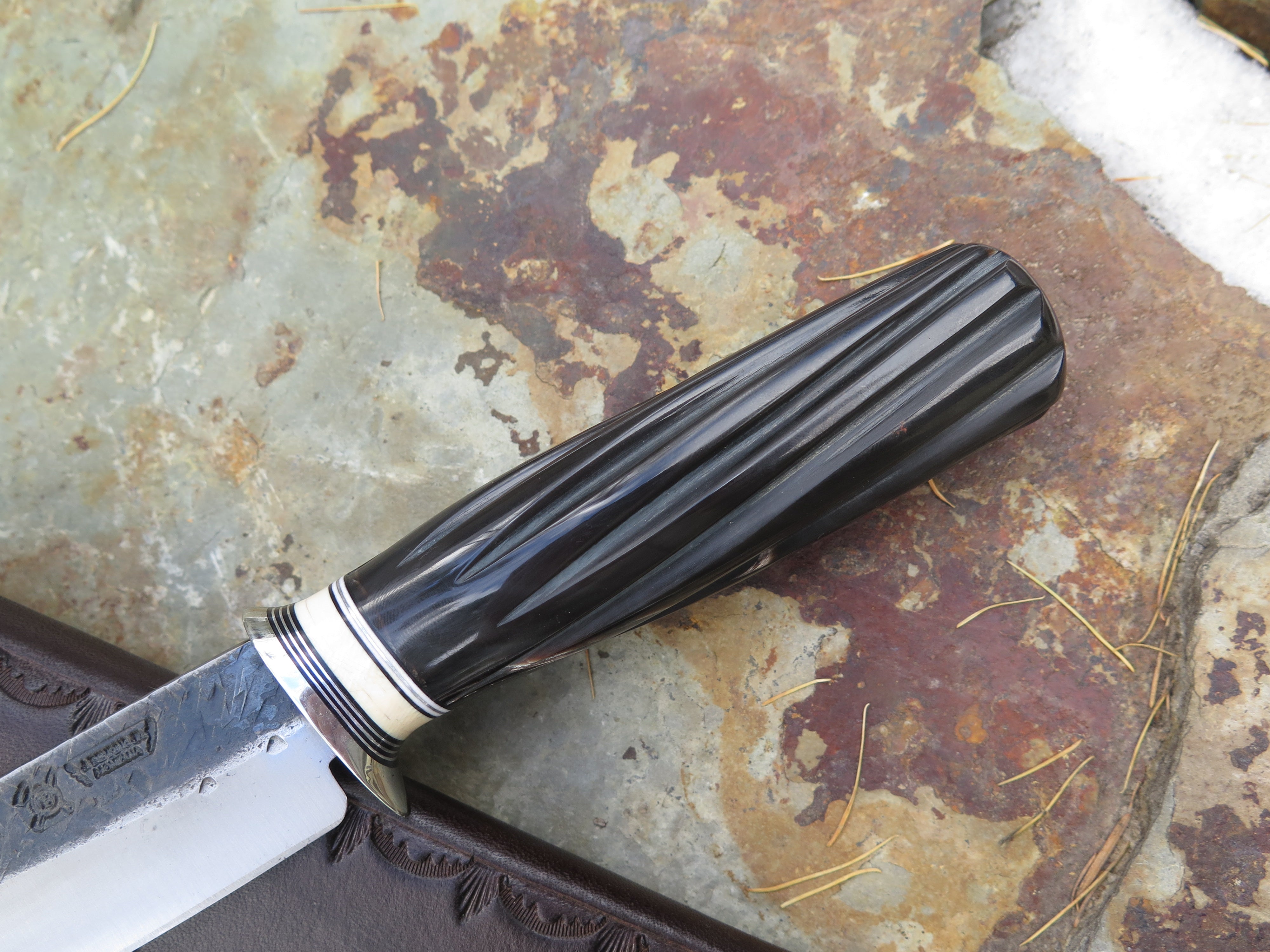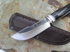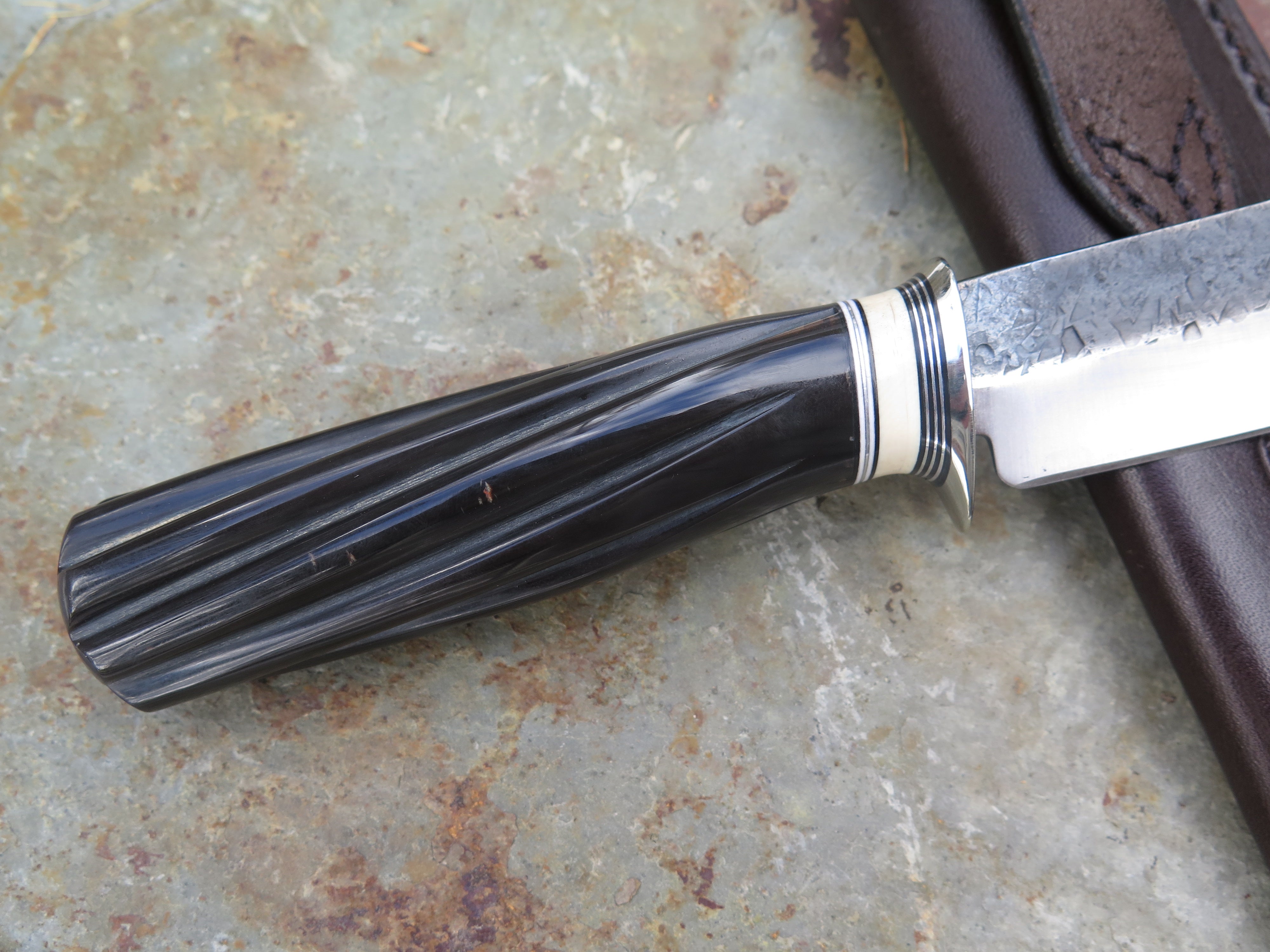 This beautiful new Woodcraft from Behring Made© is hand forged from 1/8" thick high carbon 01 tool steel and measures 4 1/2" from tip to guard with a razor sharp hollow grind and our hammermark finish. The nickel silver guard is soldered in place above black and white fiber, aluminum and ancient mammoth ivory spacers as well as a jigged African buffalo handle. The overall length measures 9" and it comes in the shown leather belt pouch sheath, though substitutions are available upon request.