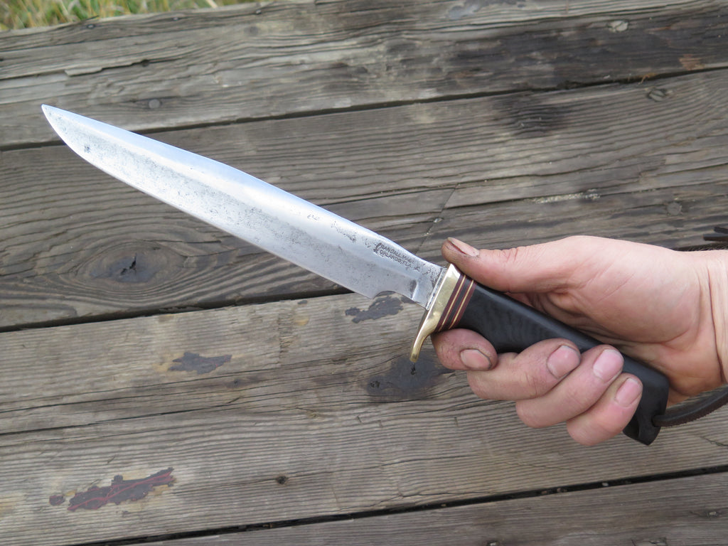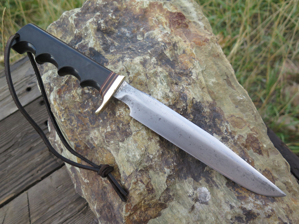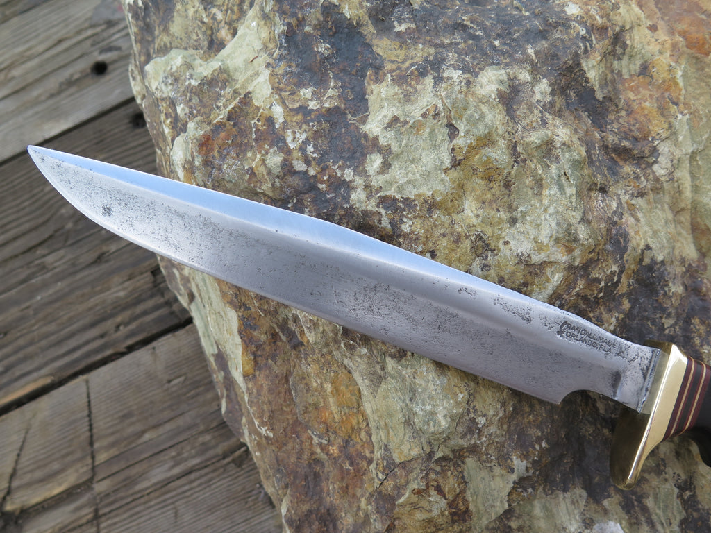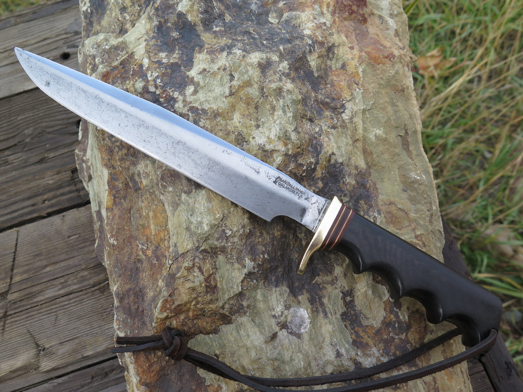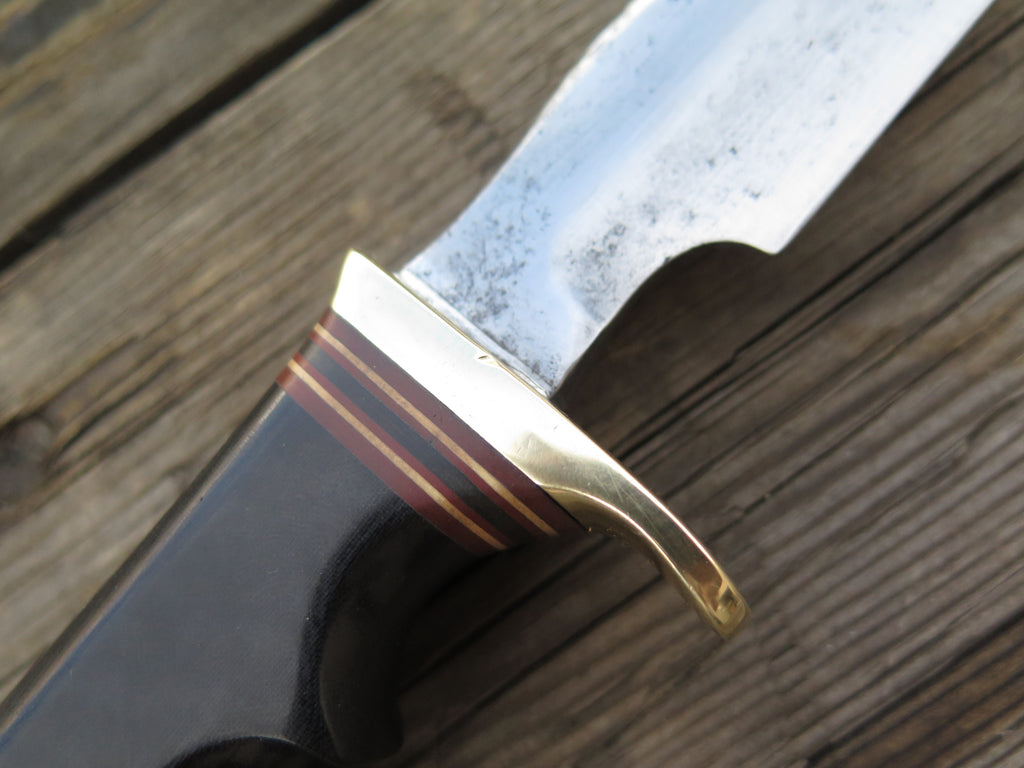 This is a fun one, and pretty rare too. A gentleman offered us a "rough shape" Randall Knives model 1-8 in trade that was in much need of some TLC- it must have seen some hell in Vietnam ( it was made between 1964-1972), but our clean up yielded a nice revival. The blade is hand forged high carbon 01 tool steel and it measures 8" from tip to guard with a nice sharp hollow grind. It does appear that the tip has been slightly modified, and Randall confirmed that this had not been done in-house. The flat-top brass guard is soldered in place above the classic 7 spacer variant as well as a finger grip green micarta handle that also features an unlined thonghole. At some point down the line, someone drilled out the original compass, but we sourced an era appropriate RMK compass and set it in place. Overall length measures just over 12", and unfortunately this one does not come with a sheath.