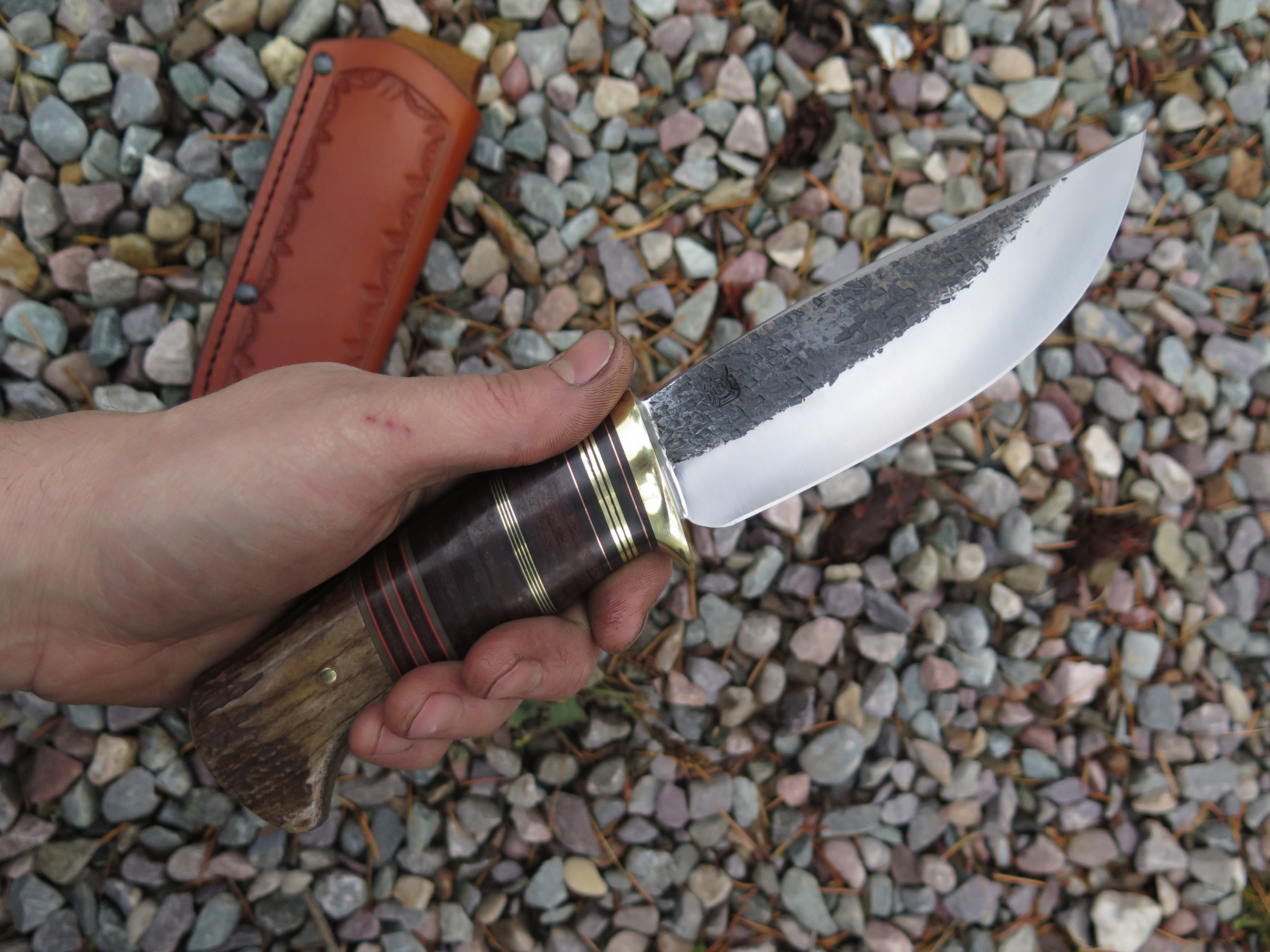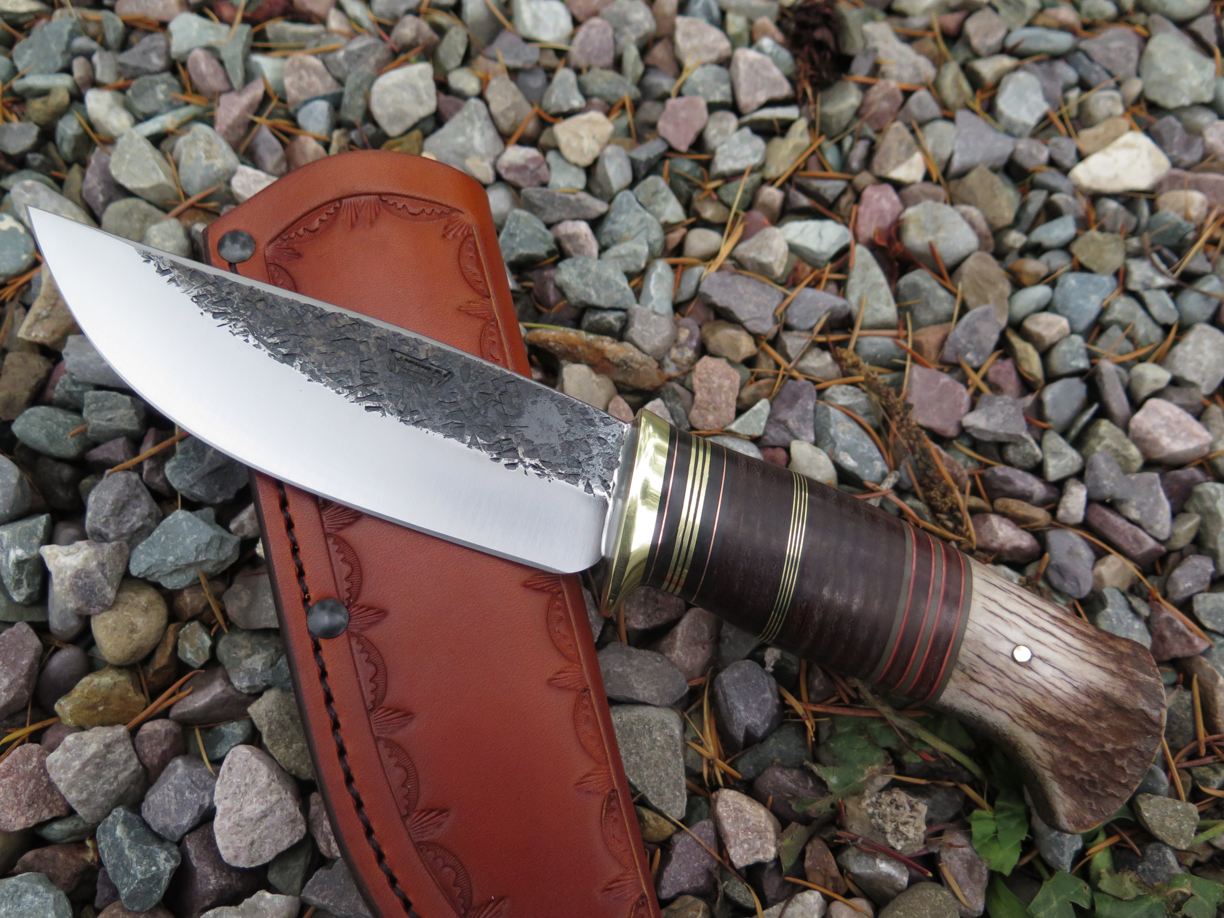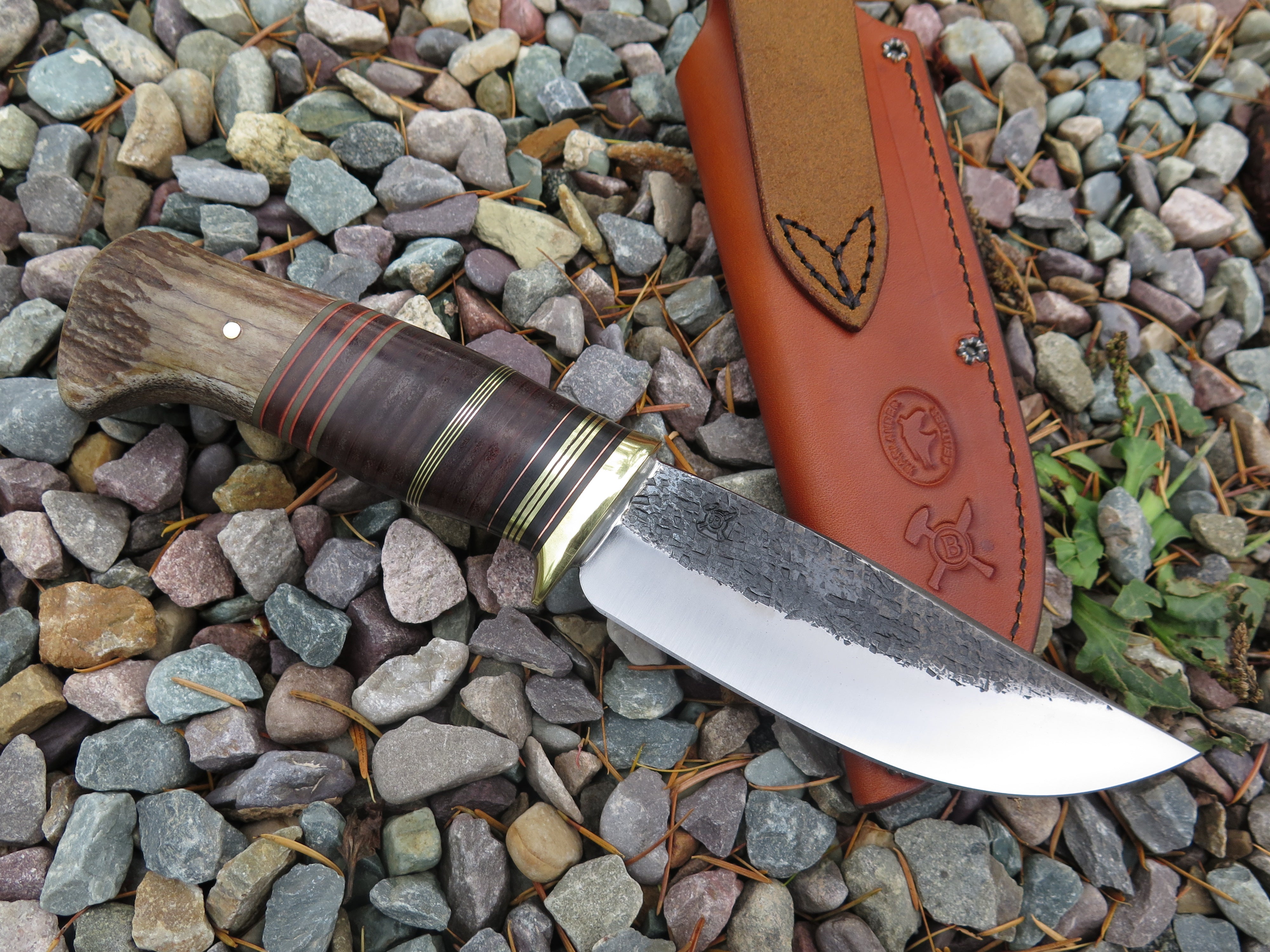 This new Hunter from Behring Made© might just be a perfect knife! We hand forged it from 3/16" thick high carbon 01 tool steel and it measures 5 1/4" from tip to guard with a razor sharp hollow grind and our hammermark finish. The brass guard is soldered in place above black, maroon and grey fiber, brass, copper and horsehide leather spacers as well as a sweet moose stag butt that is pinned with brass. The overall length measures 10" and this one comes in a border tooled pouch sheath that rides the belt.