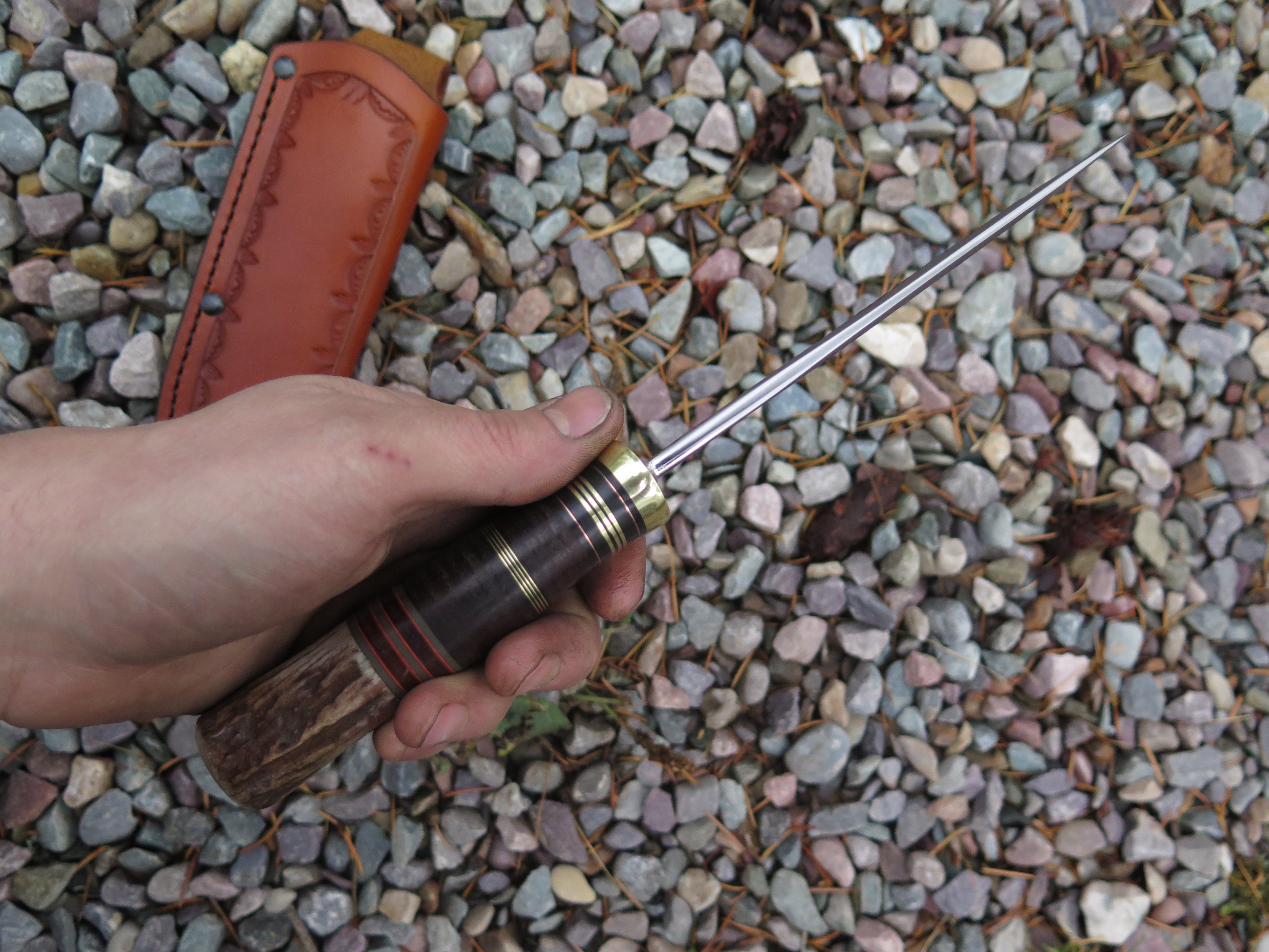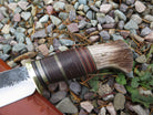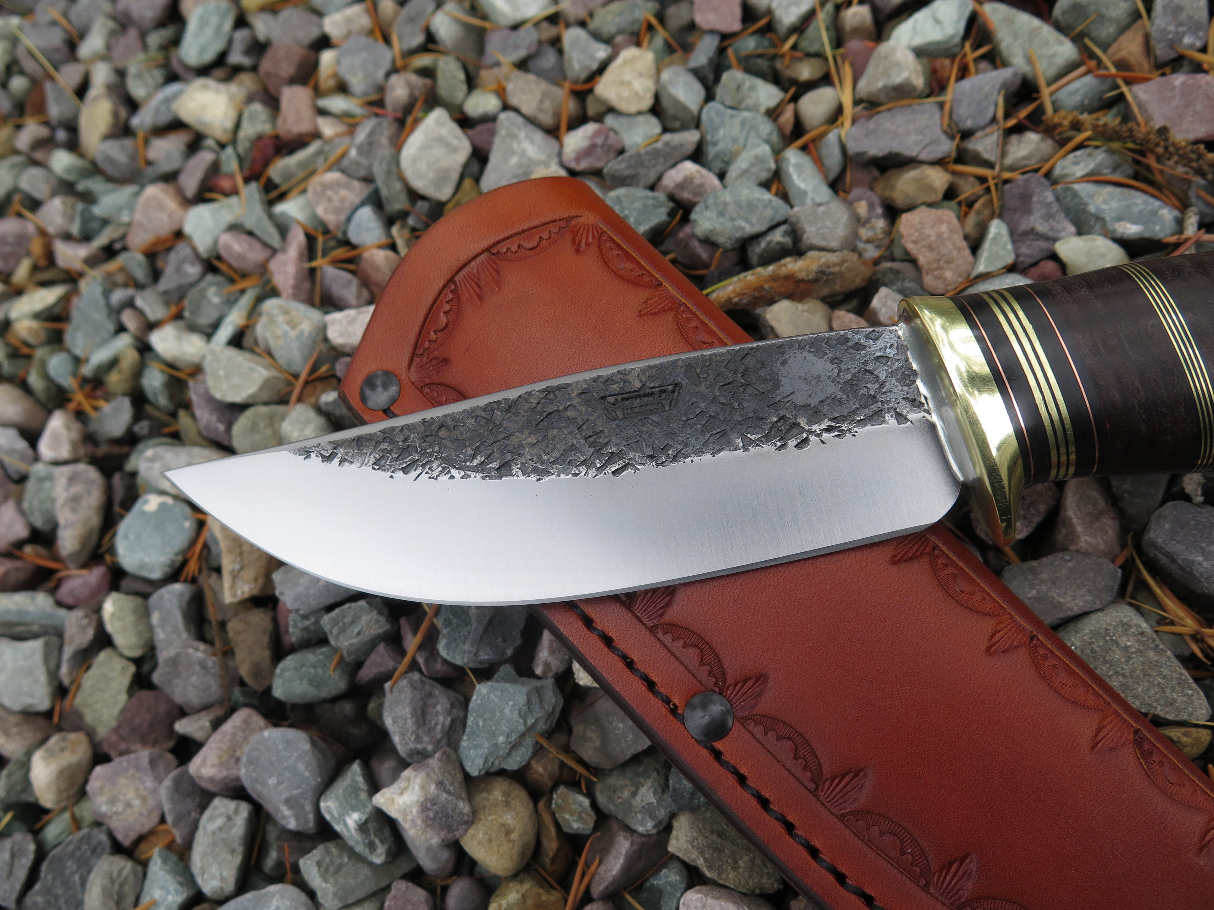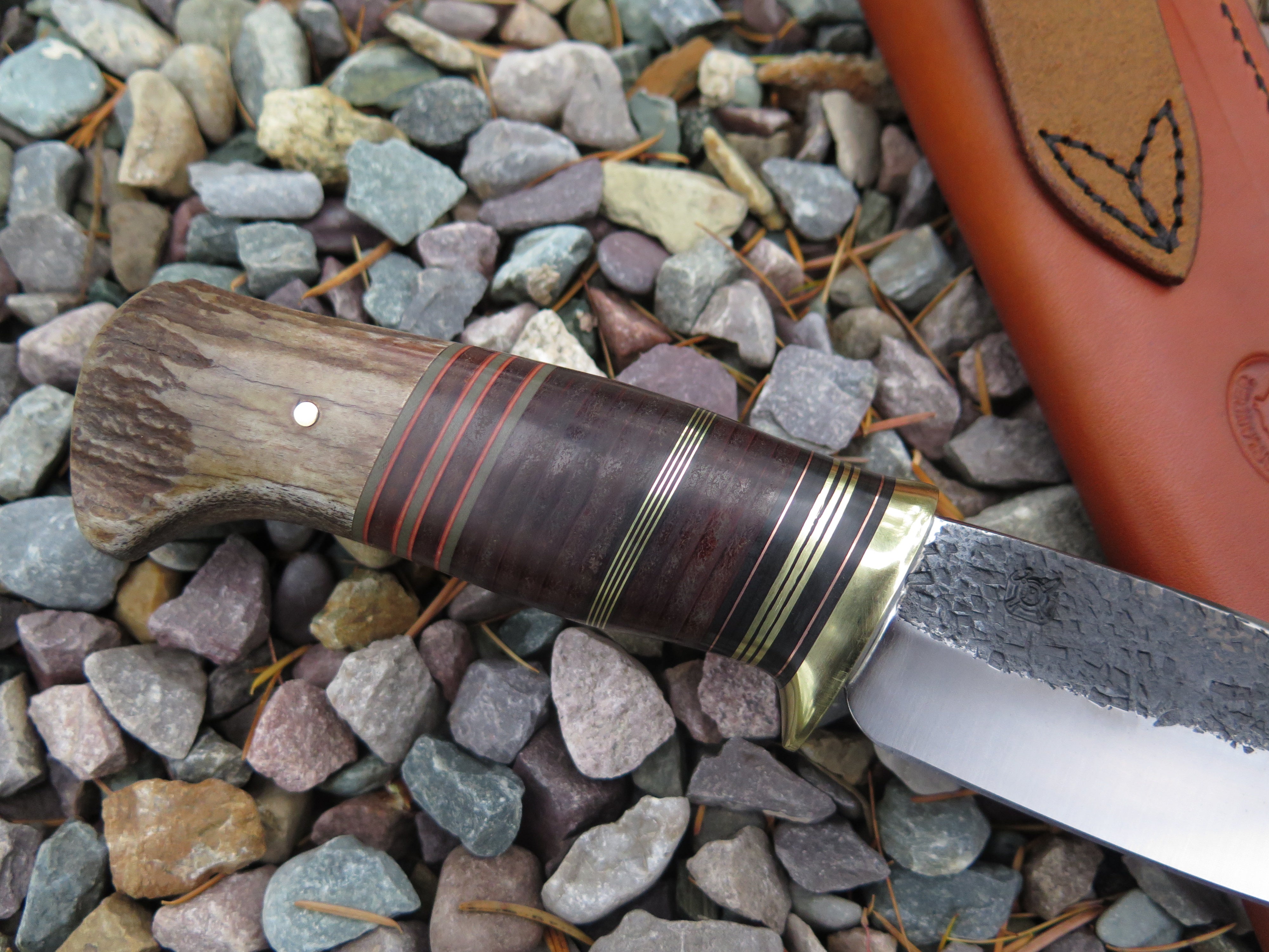 This new Hunter from Behring Made© might just be a perfect knife! We hand forged it from 3/16" thick high carbon 01 tool steel and it measures 5 1/4" from tip to guard with a razor sharp hollow grind and our hammermark finish. The brass guard is soldered in place above black, maroon and grey fiber, brass, copper and horsehide leather spacers as well as a sweet moose stag butt that is pinned with brass. The overall length measures 10" and this one comes in a border tooled pouch sheath that rides the belt.