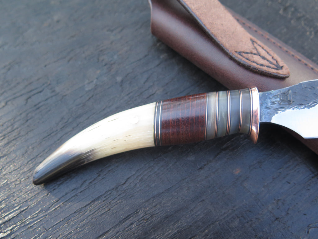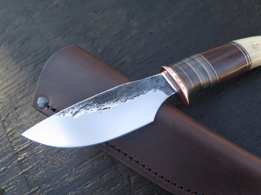 This beautiful new Alaskan from Behring Made© is hand forged from 1/8" thick high carbon 01 tool steel and it measures 3 1/2" from tip to guard with a razor sharp hollow grind and our hammermark finish. The copper guard is soldered in place above black fiber, copper and musk ox horn spacers atop a horsehide leather stack and a musk ox tine handle that's pinned through the tang with copper. The overall length measures 8" and it comes in a classic leather belt pouch sheath.