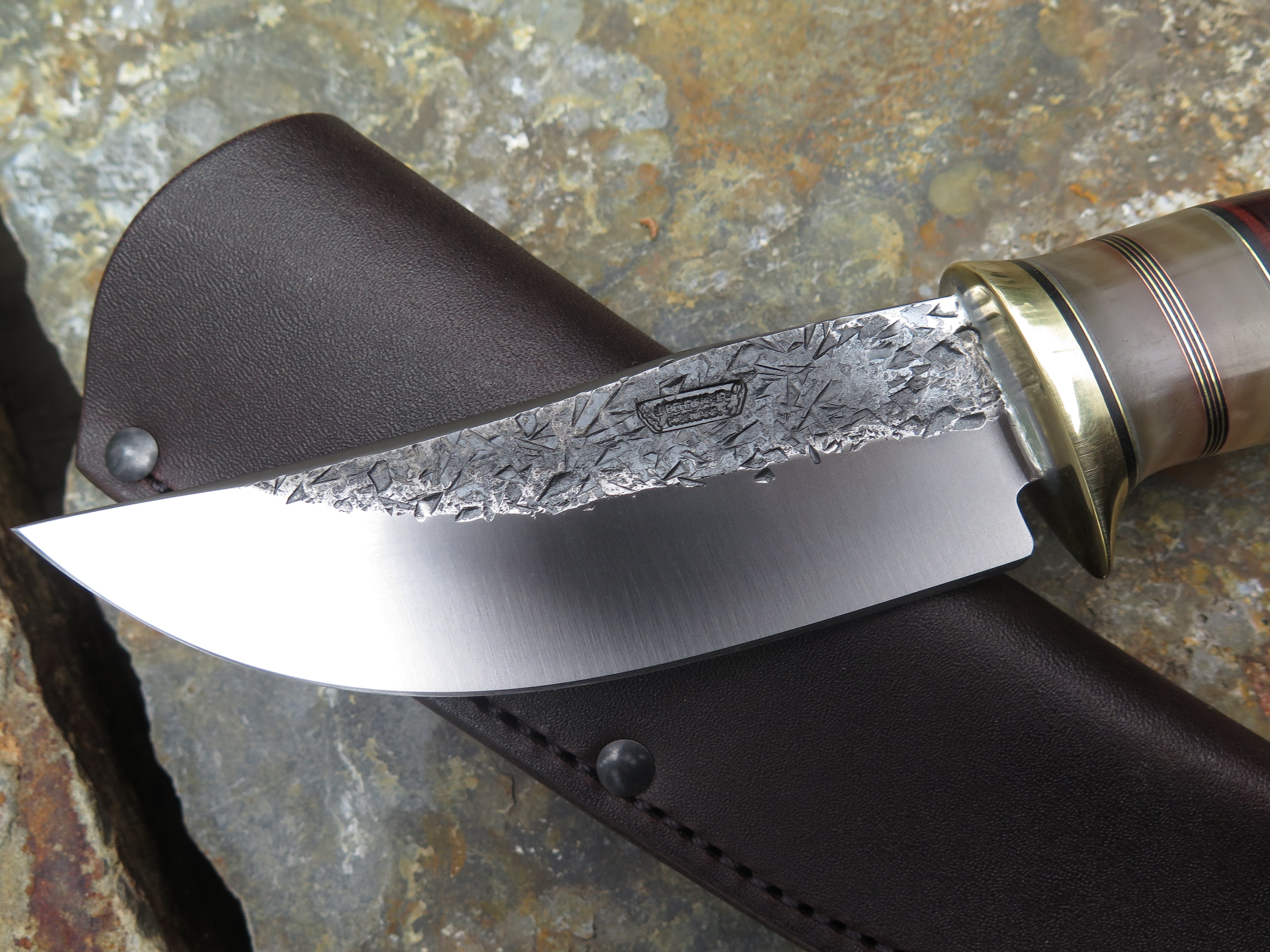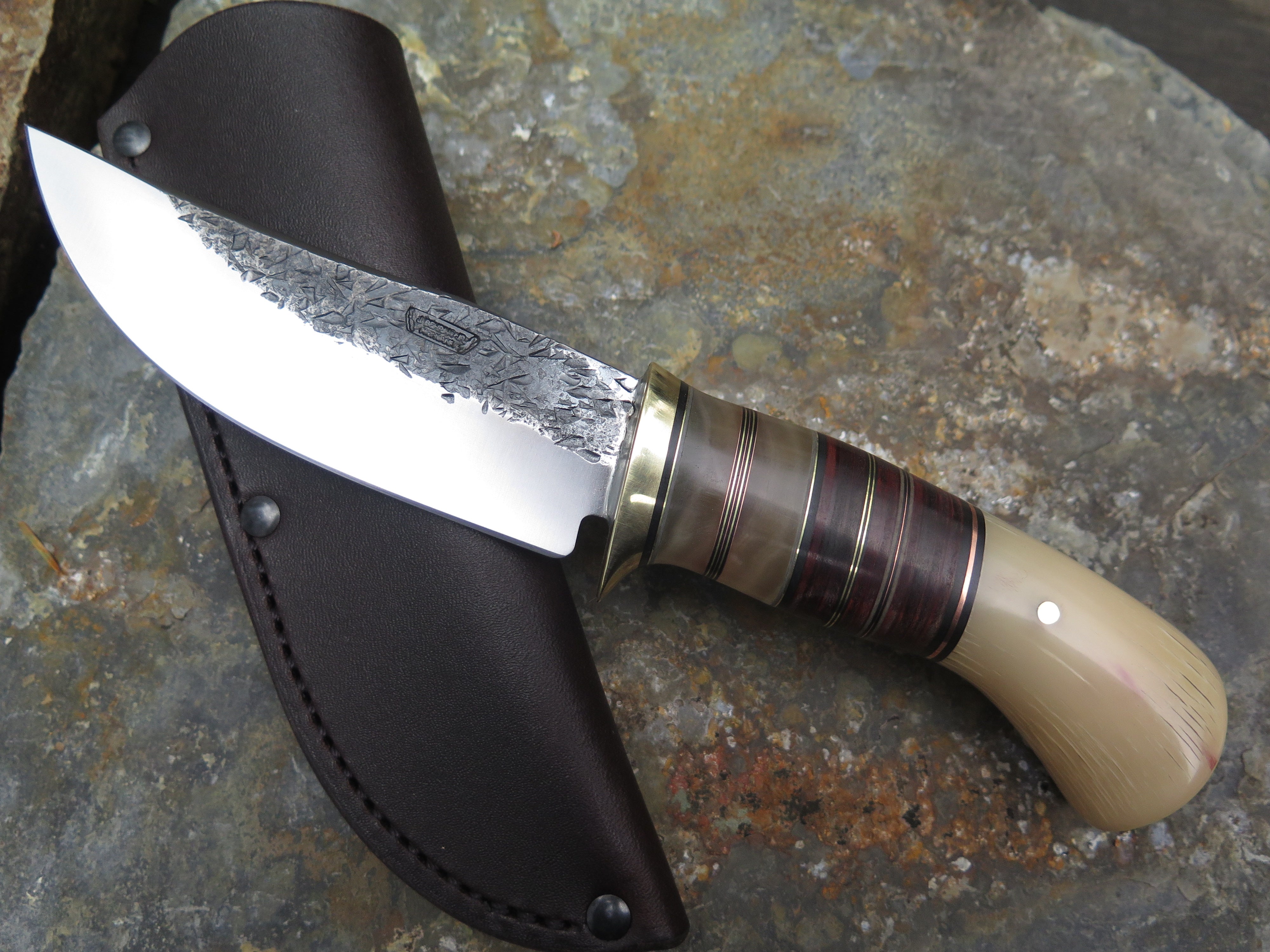 This beautiful new Hunter from Behring Made© is hand forged from 3/16" thick high carbon 01 tool steel and it measures 5" from tip to guard with a razor sharp hollow grind and our hammermark finish. The brass guard is soldered in place above black and gray fiber, horsehide, copper and brass spacers as well as a musk ox horn butt that's pinned through the tang with brass. The overall length measures 9 5/8" and it comes in a classic leather belt pouch sheath.