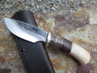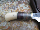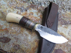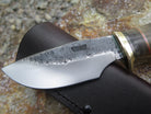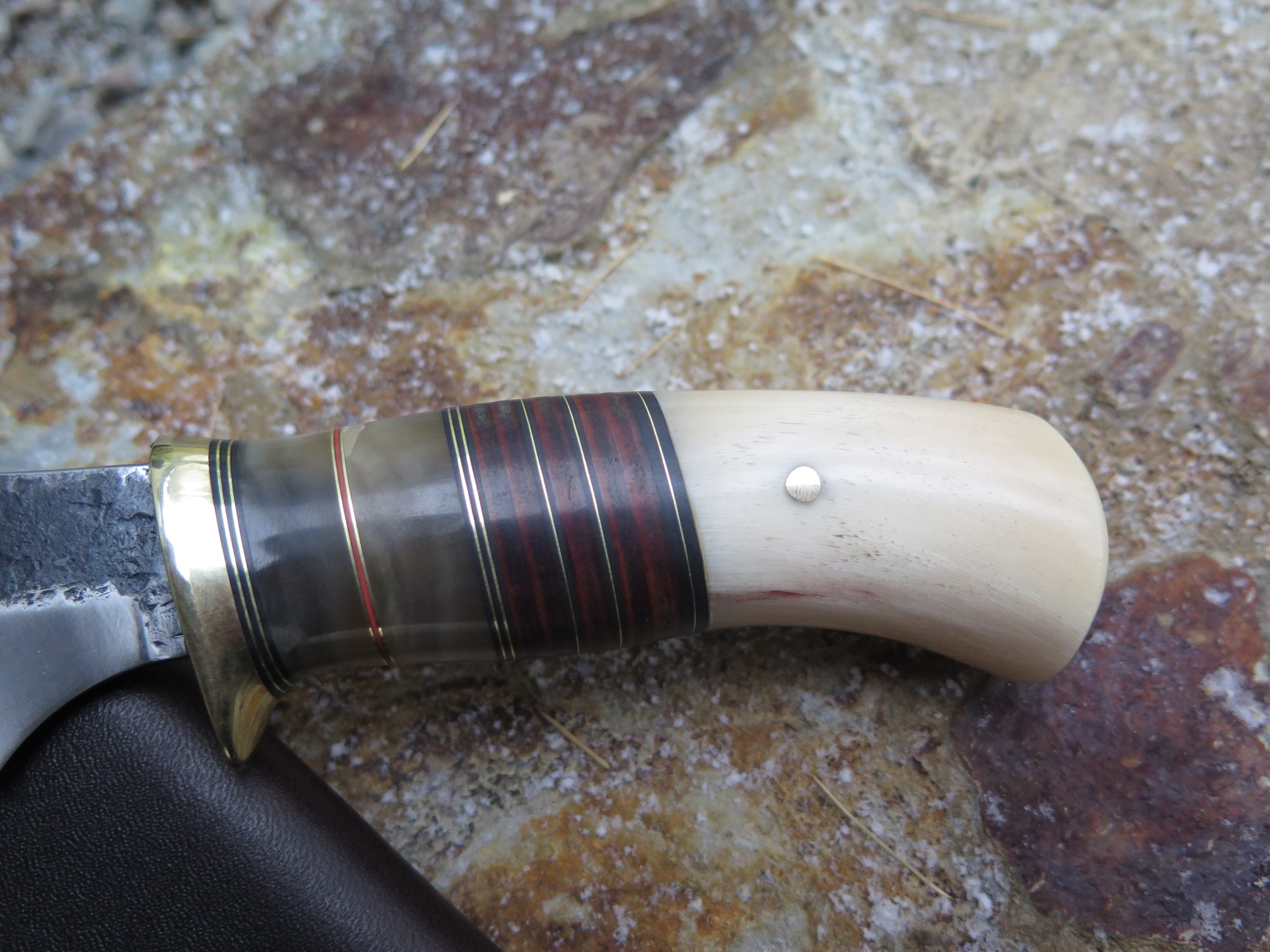 This beautiful new Alaskan from Behring Made© is hand forged from 3/16" thick high carbon 01 tool steel and it measures 4 1/2" from tip to guard with a razor sharp hollow grind and our hammermark finish. The brass guard is soldered in place above black and maroon fiber, brass, horsehide and musk ox boss spacers with a musk ox horn butt that's pinned through the tang with brass. The overall length measures 8 7/8" and it comes in a classic belt pouch sheath.