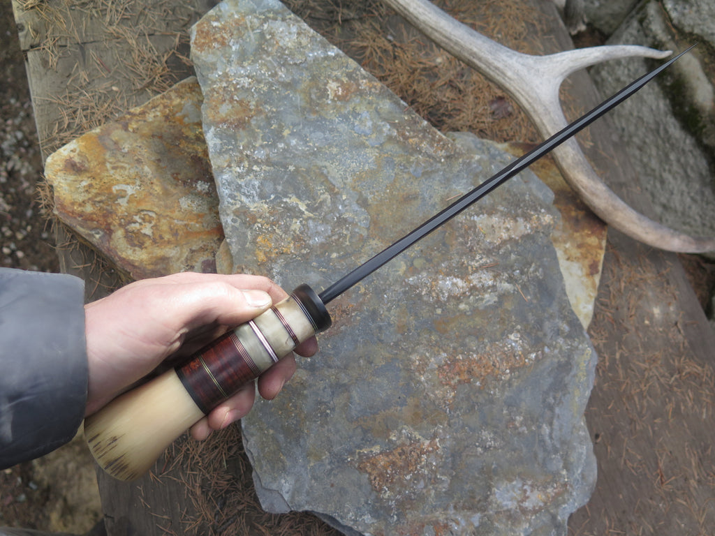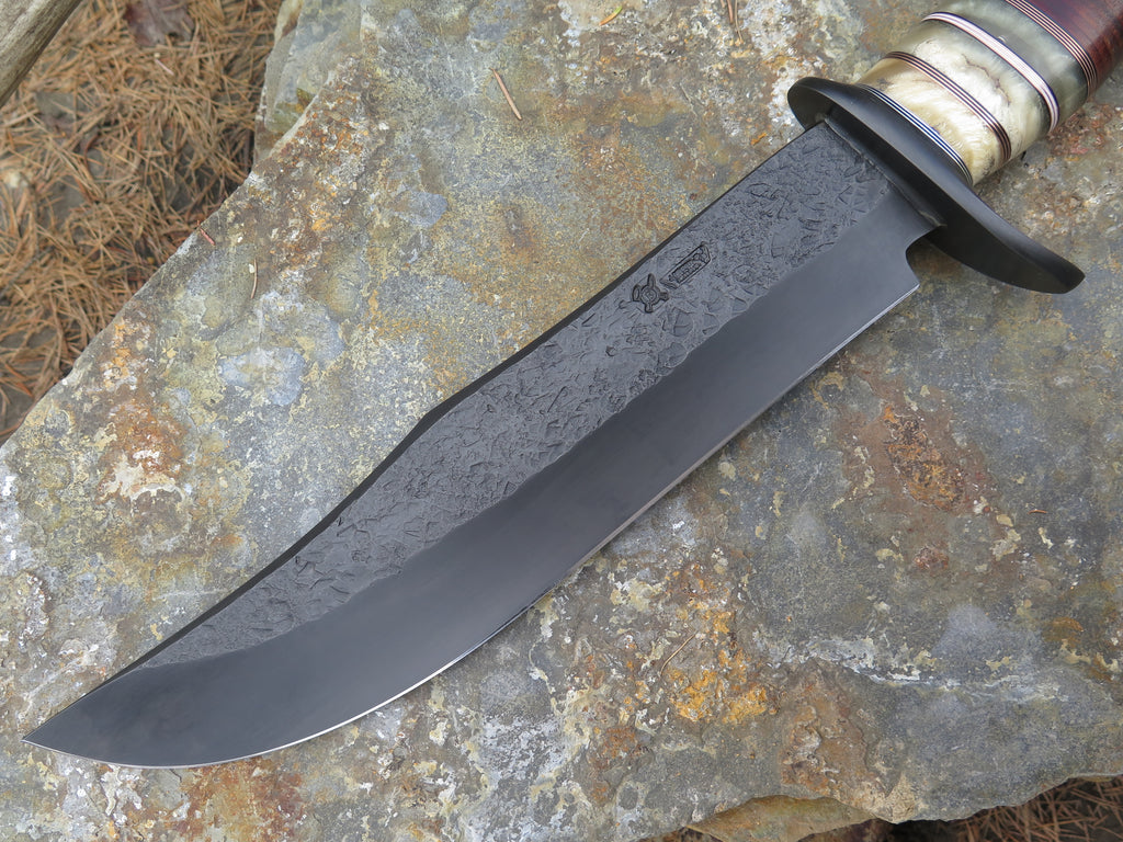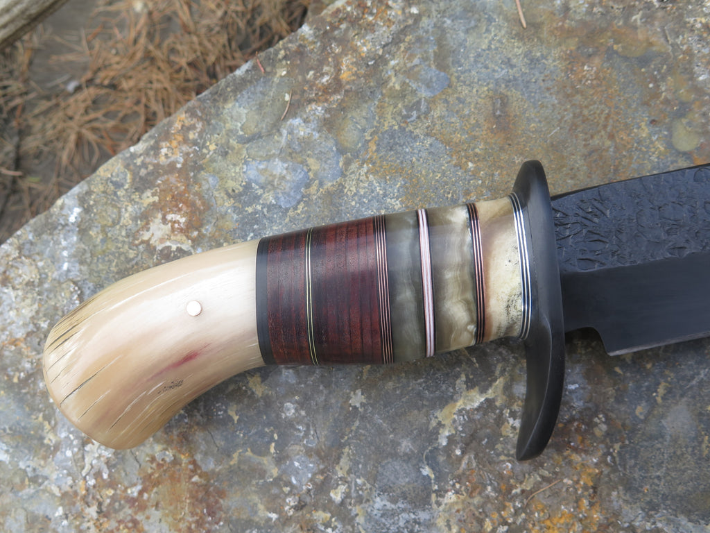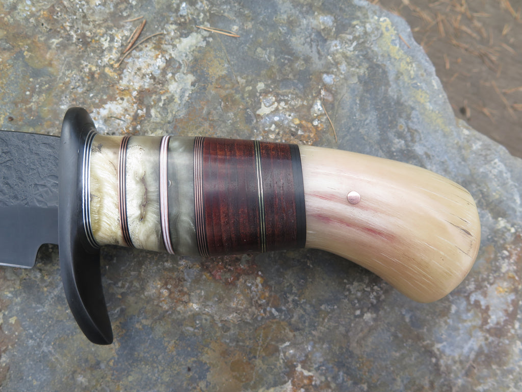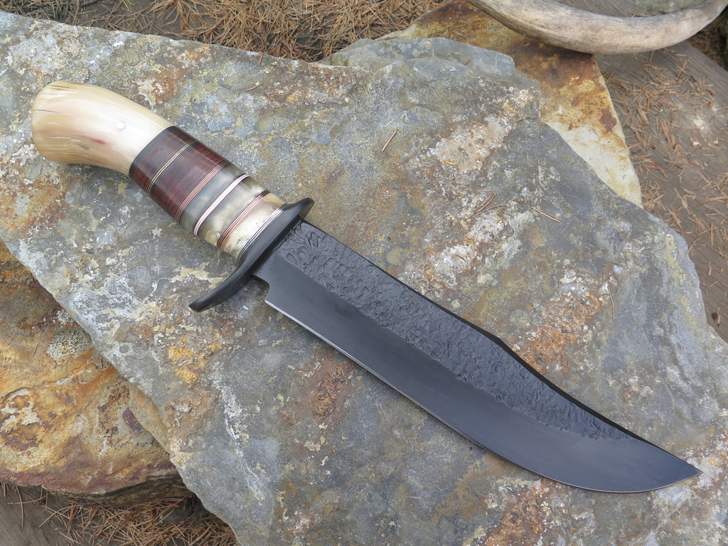 This beautiful new Bowie from Behring Made© is hand forged from 1/4" thick 5160 spring steel and it measures 10" from tip to guard with a razor sharp hollow grind and our hammermark finish. The blued steel guard is soldered in place above black, white, brass, copper, aluminum, musk ox boss and horsehide leather spacers which top a musk ox horn butt that's pinned through the tang with brass. The overall length measures 15 1/2" and it'll come in a custom sheath from Rowe's Leather.
