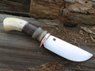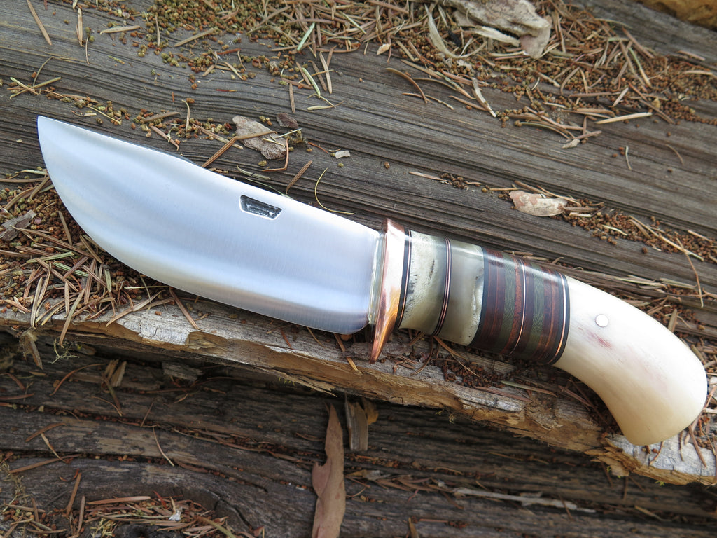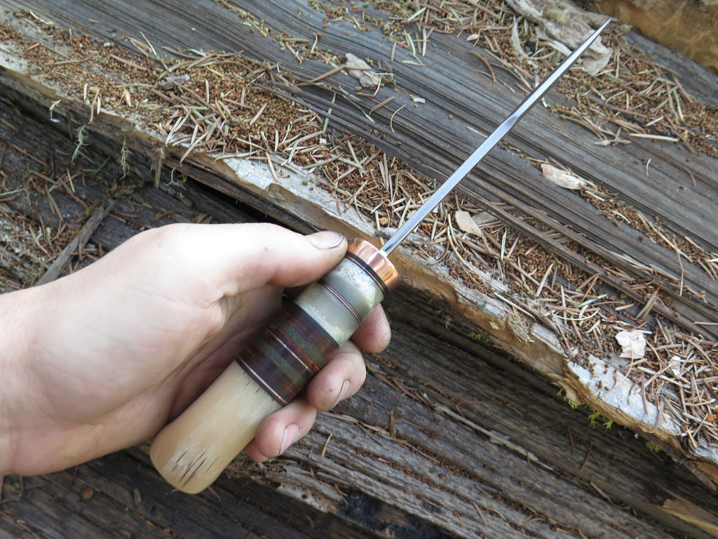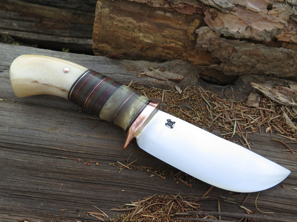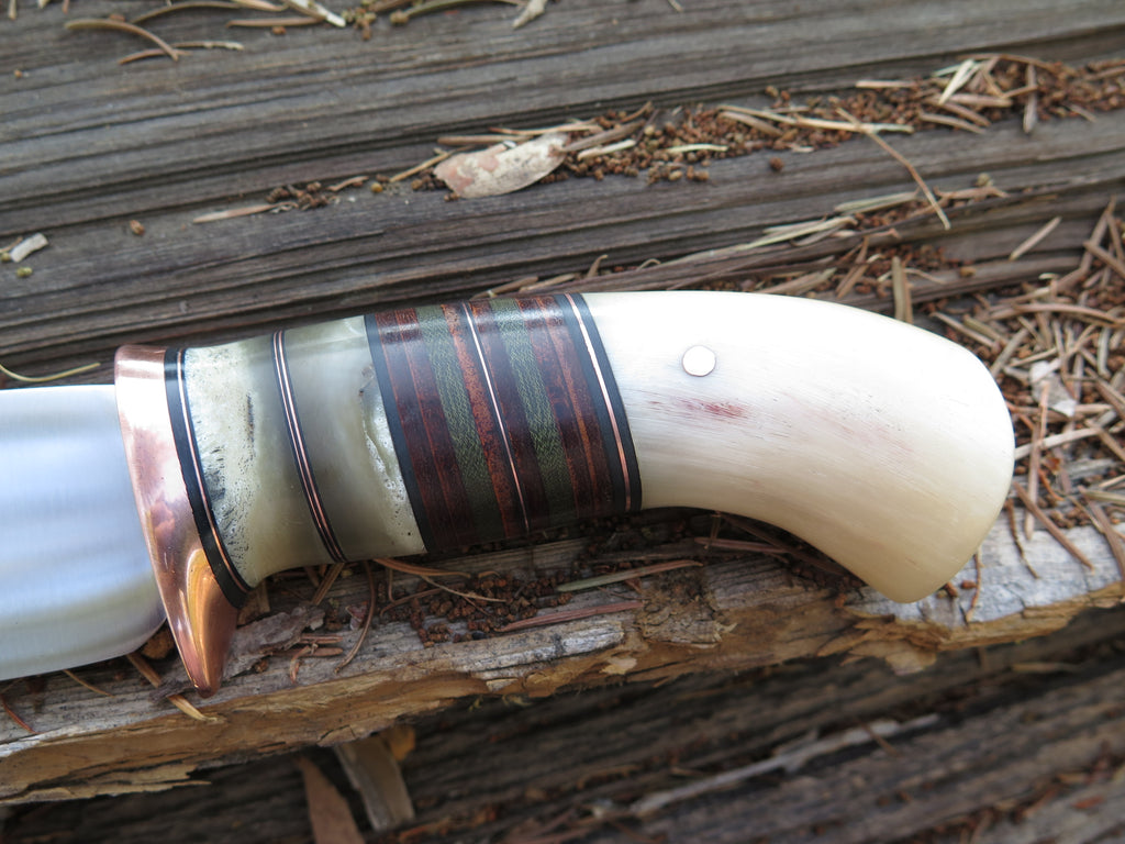 This beastly new Woodcraft from Behring Made© is hand forged from 3/16" thick high carbon 01 tool steel and it measures 5" from tip to guard with a razor sharp convex grind. The copper guard is soldered in place above black fiber, green micarta, copper, horsehide and two beautiful musk ox spacers in addition to the musk ox horn butt that is also pinned with copper. The overall length measures 9 1/2" and it comes in a custom pouch sheath from Warlander Leather.