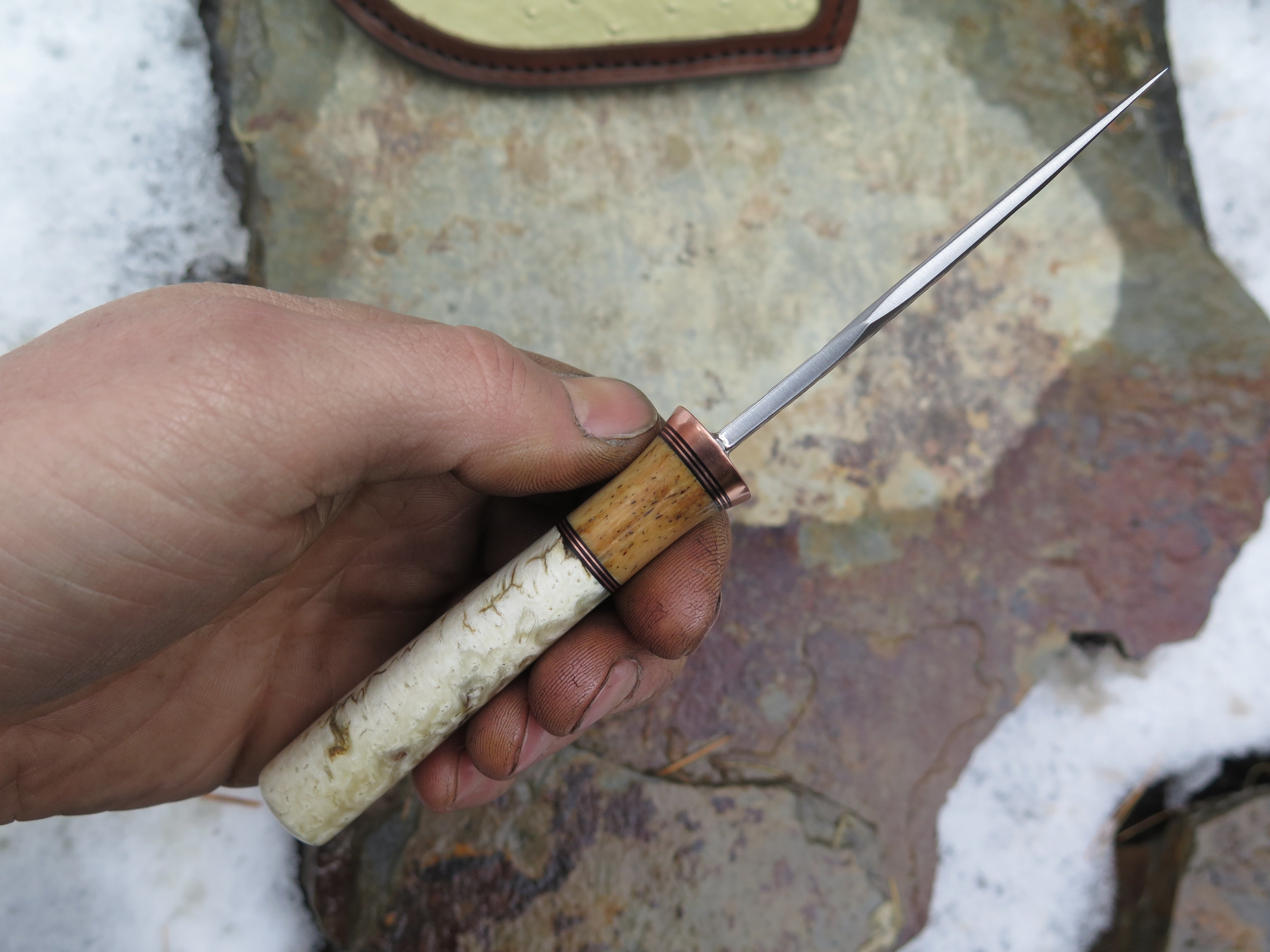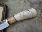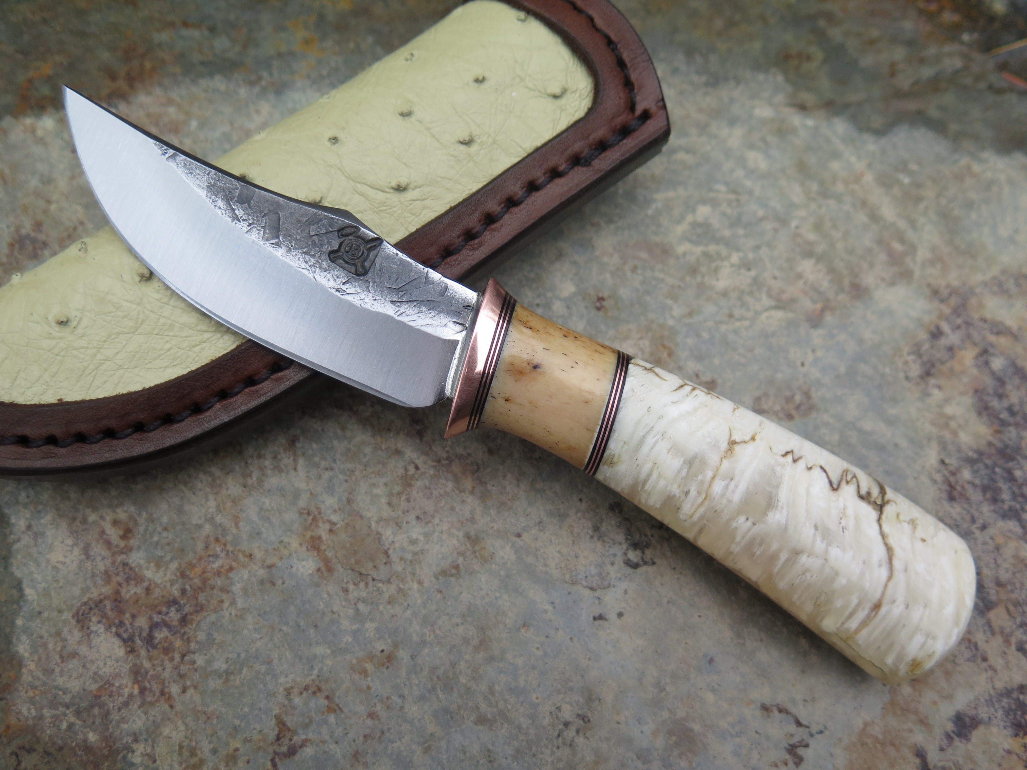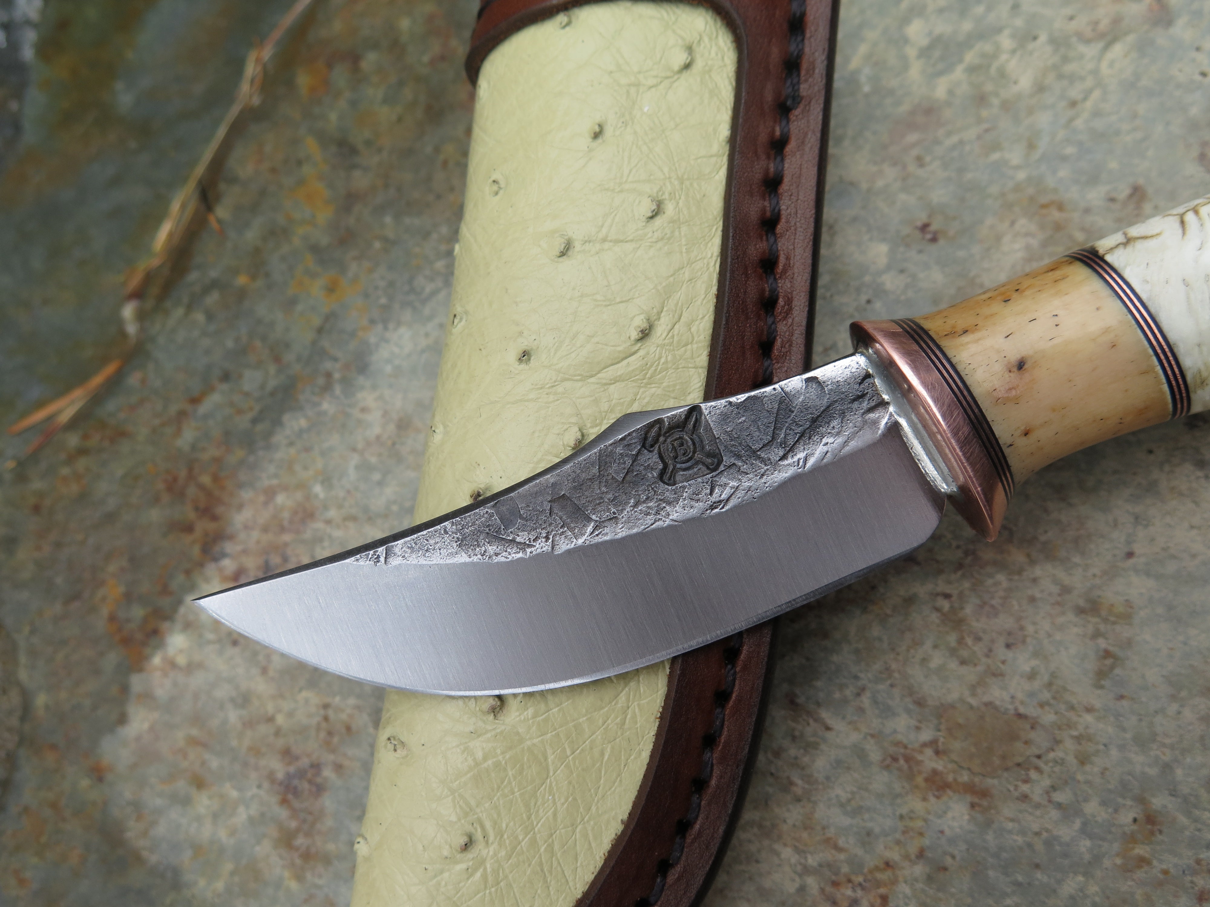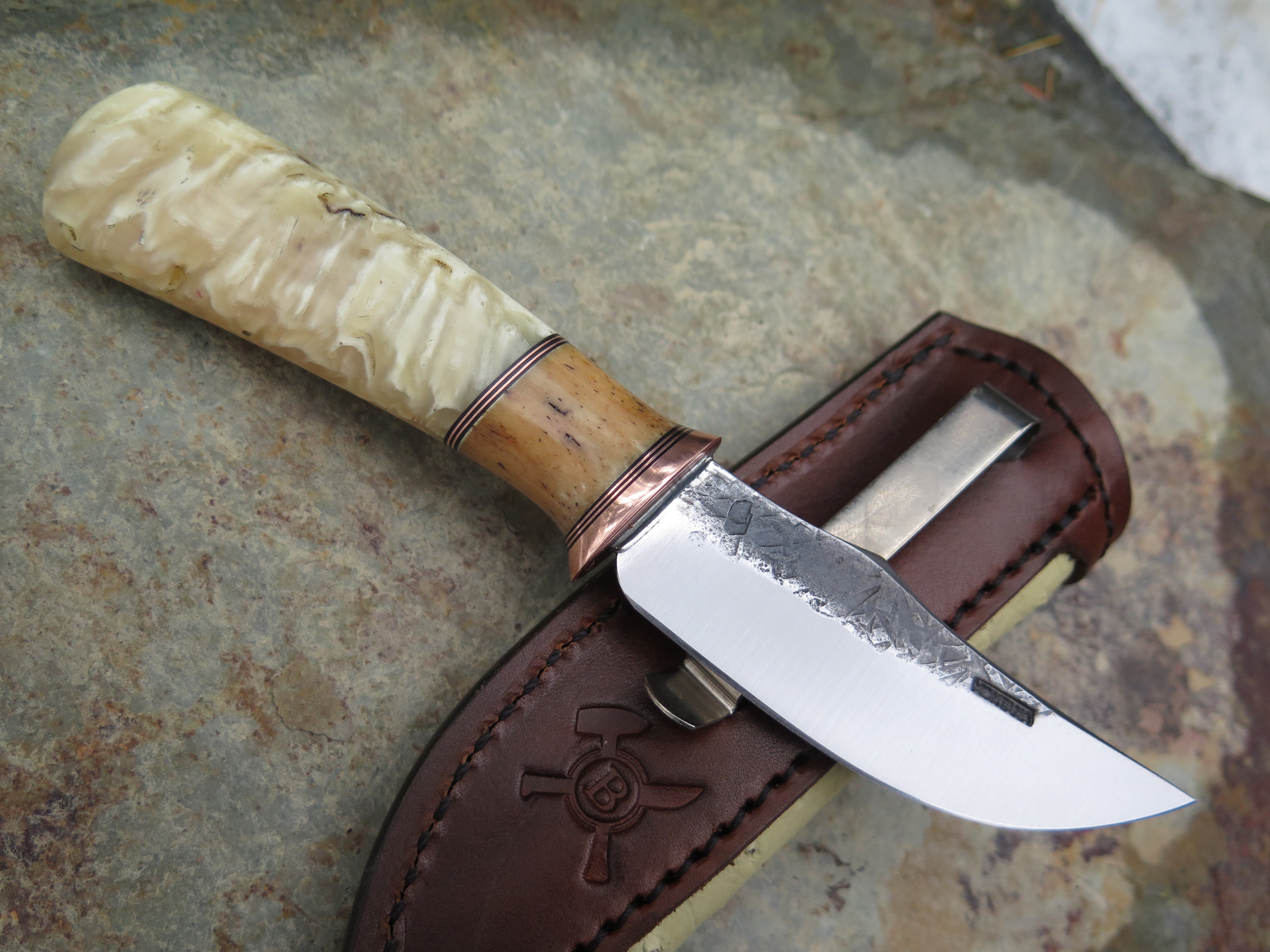 This handsome new Clip Point Pocket from Behring Made© is hand forged from 1/8" thick high carbon 01 tool steel and it measures 3" from tip to guard with a razor sharp hollow grind and our hammermark finish. The copper guard is soldered in place above black fiber, copper and oosik spacers as well as a beautiful musk ox boss handle that brings the overall length out to 6 5/8". Taking it a step further, we outfitted this one with an ostrich inlaid spring clip sheath that rides in the right hand pocket of your britches.