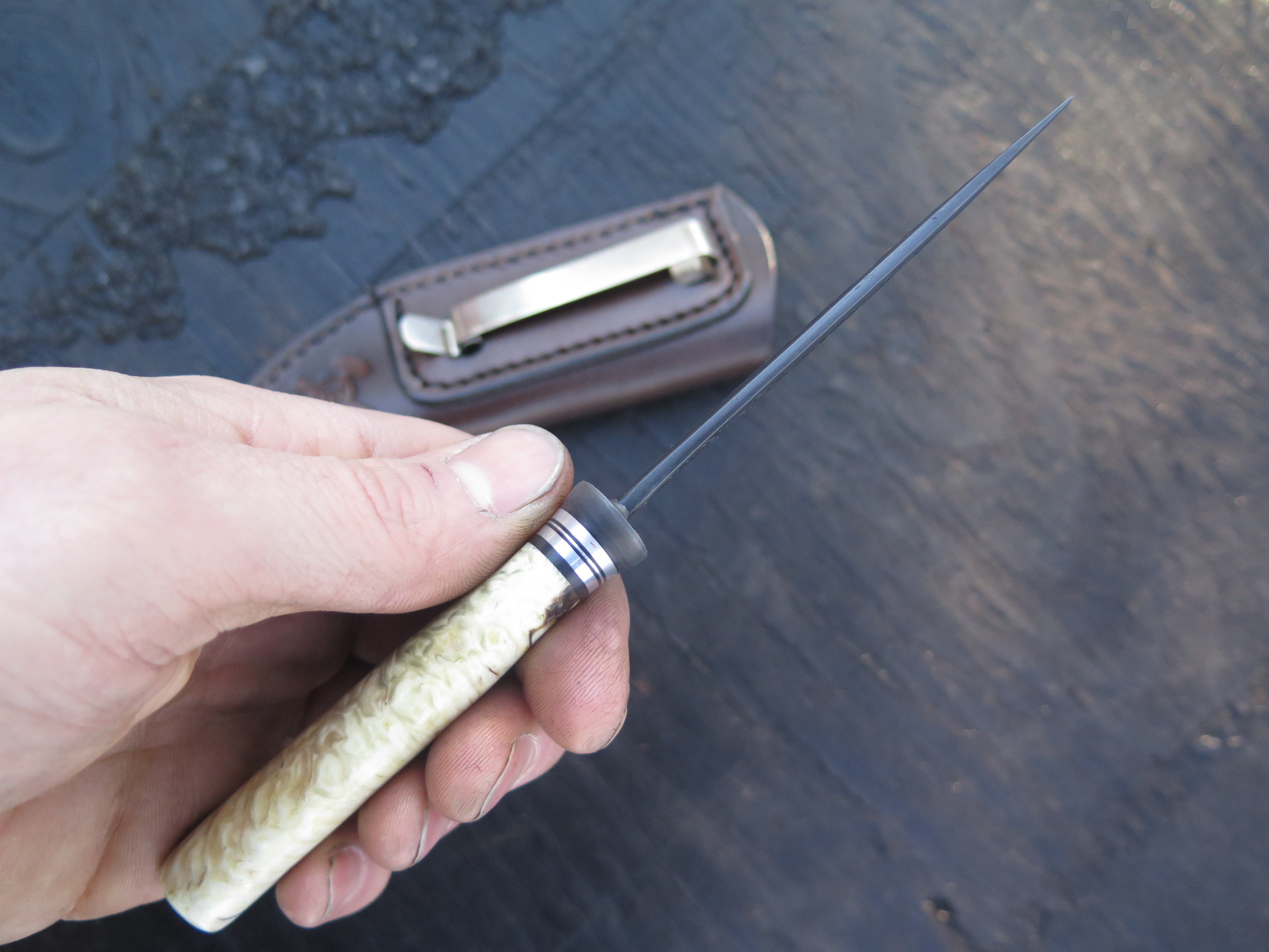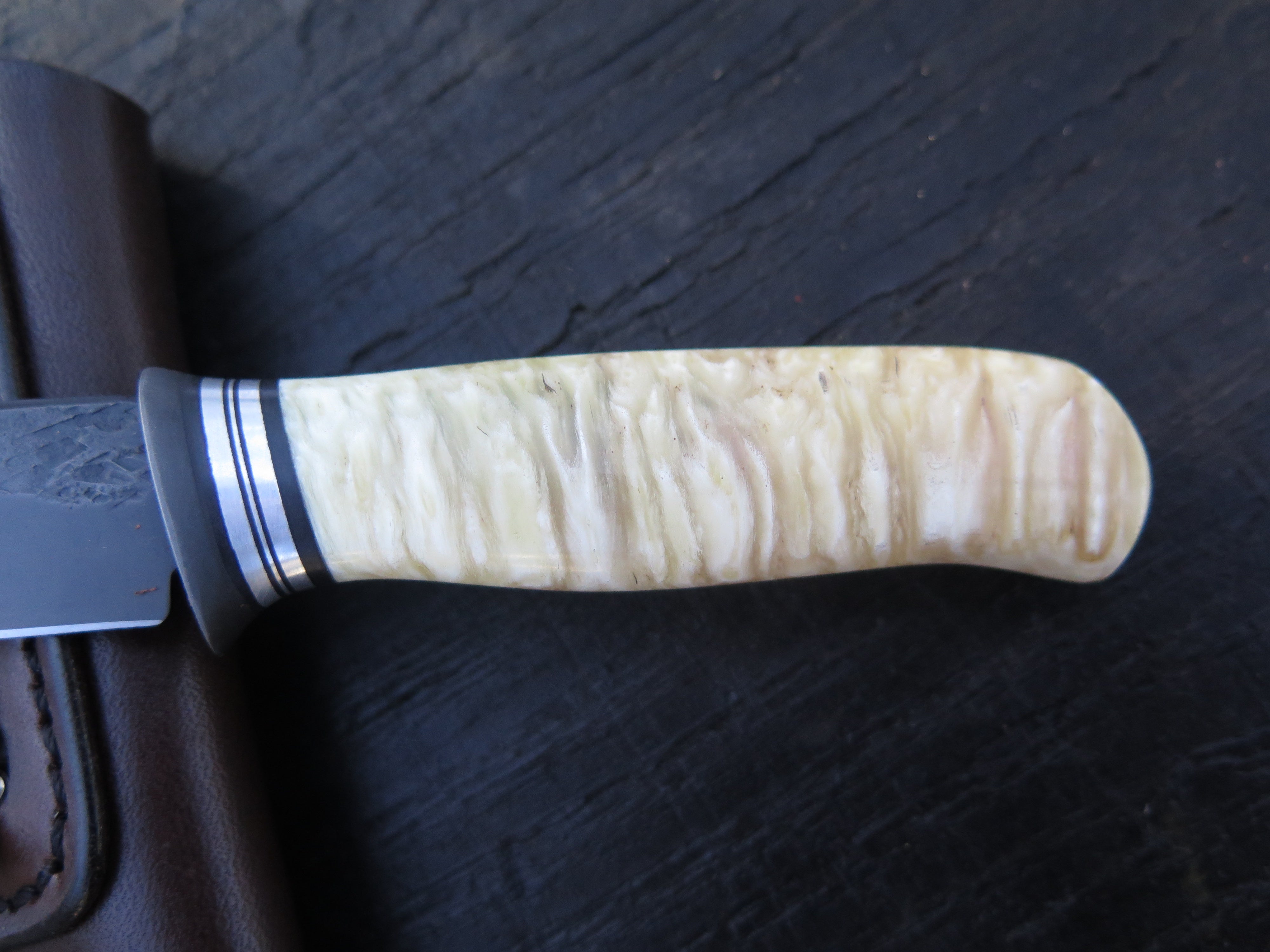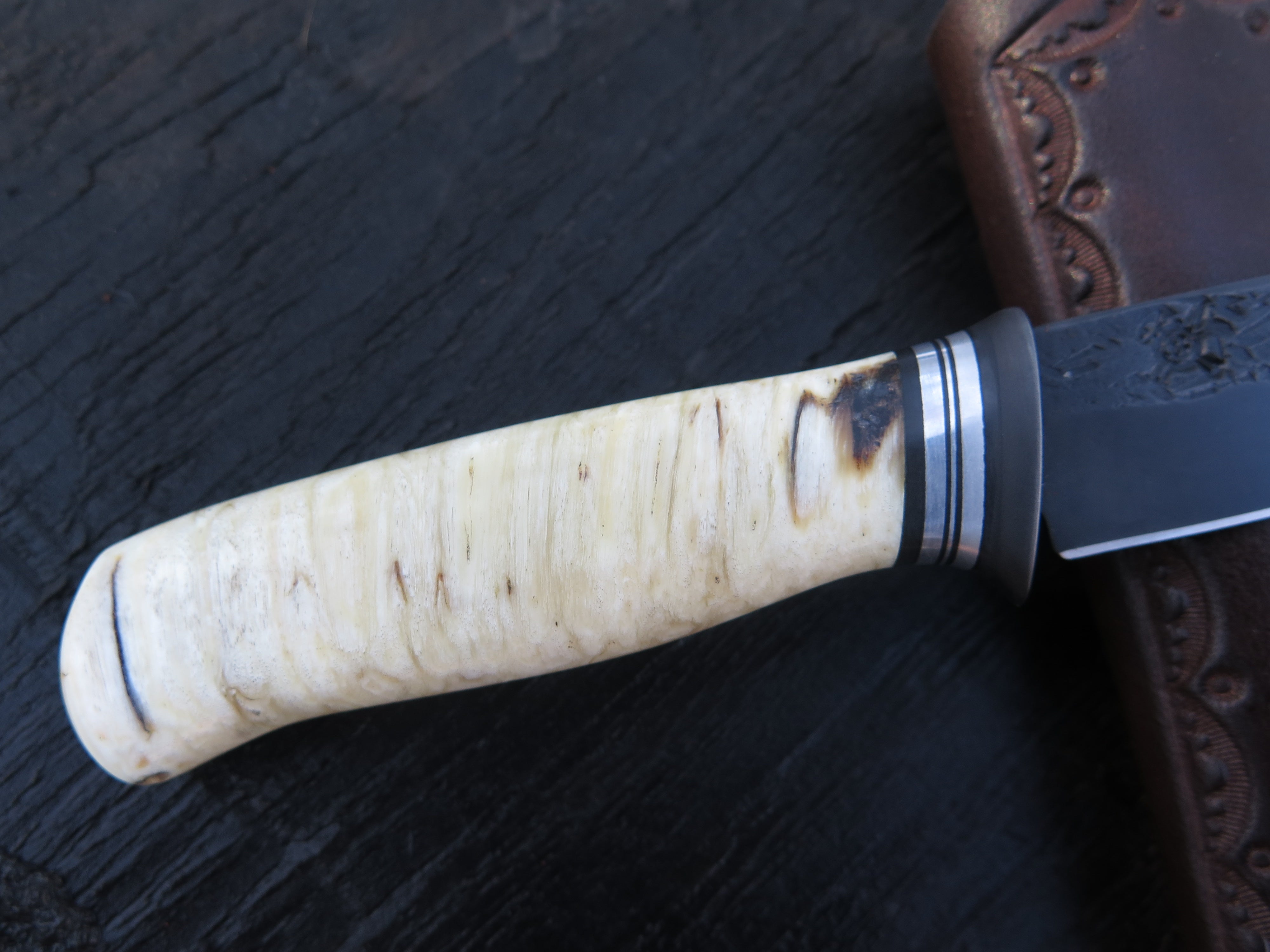 This incredibly unique Tanto Pocket from Behring Made© is hand forged from 1/8" thick high carbon 01 tool steel and it measures 3 1/4" from tip to guard with a razor sharp hollow grind, hammermarks and our forced patina blued finish. The blued steel guard is soldered in place above black fiber, aluminum and brass spacers as well as an outstanding handle of musk ox boss with a crow's beak grind. The overall length measures 6 3/4" and it comes with a sheath outfitted to ride inside the right hand pocket of your jeans. Pretty as it is, we made it for use and we guarantee this rig for life.
