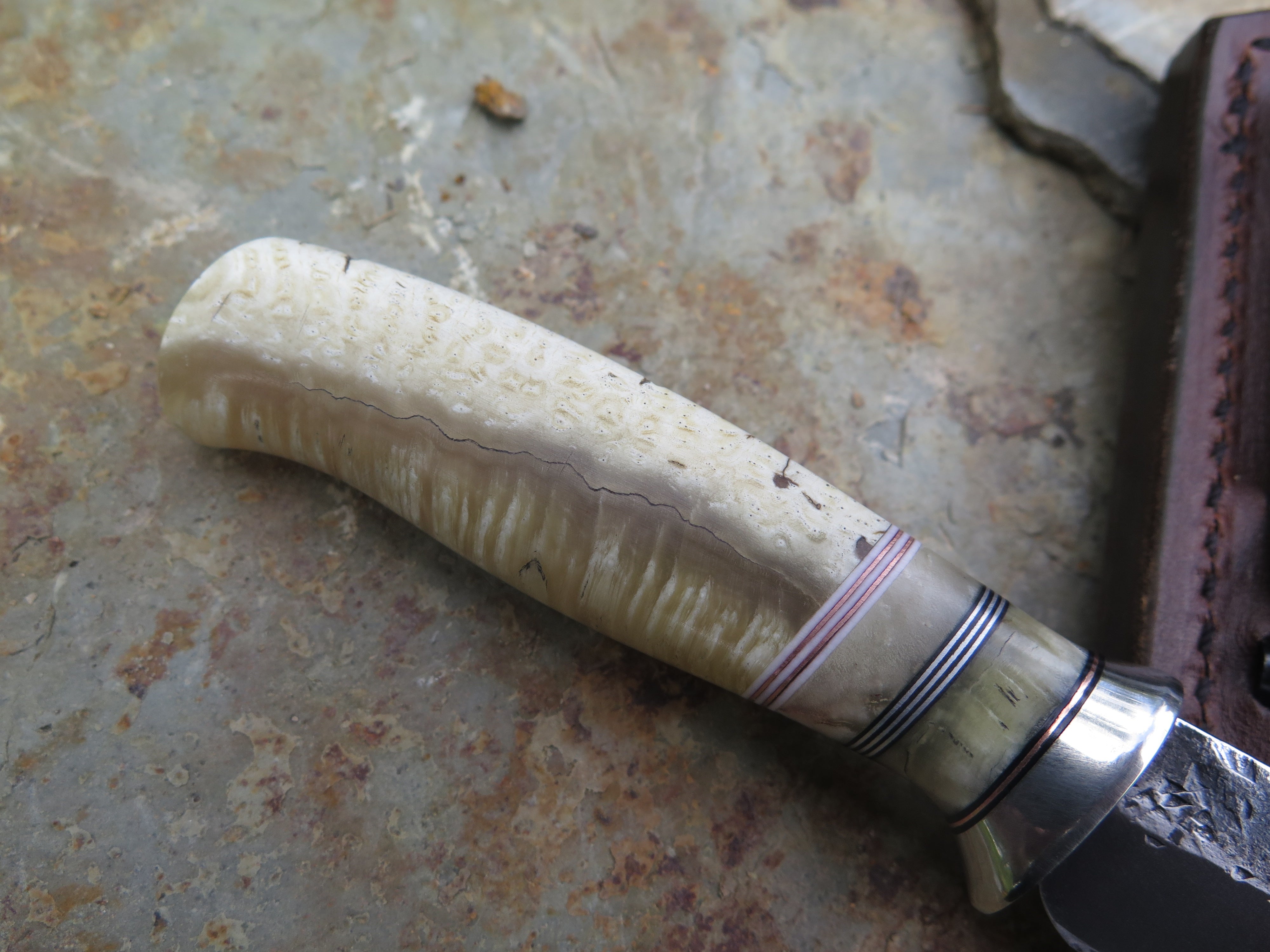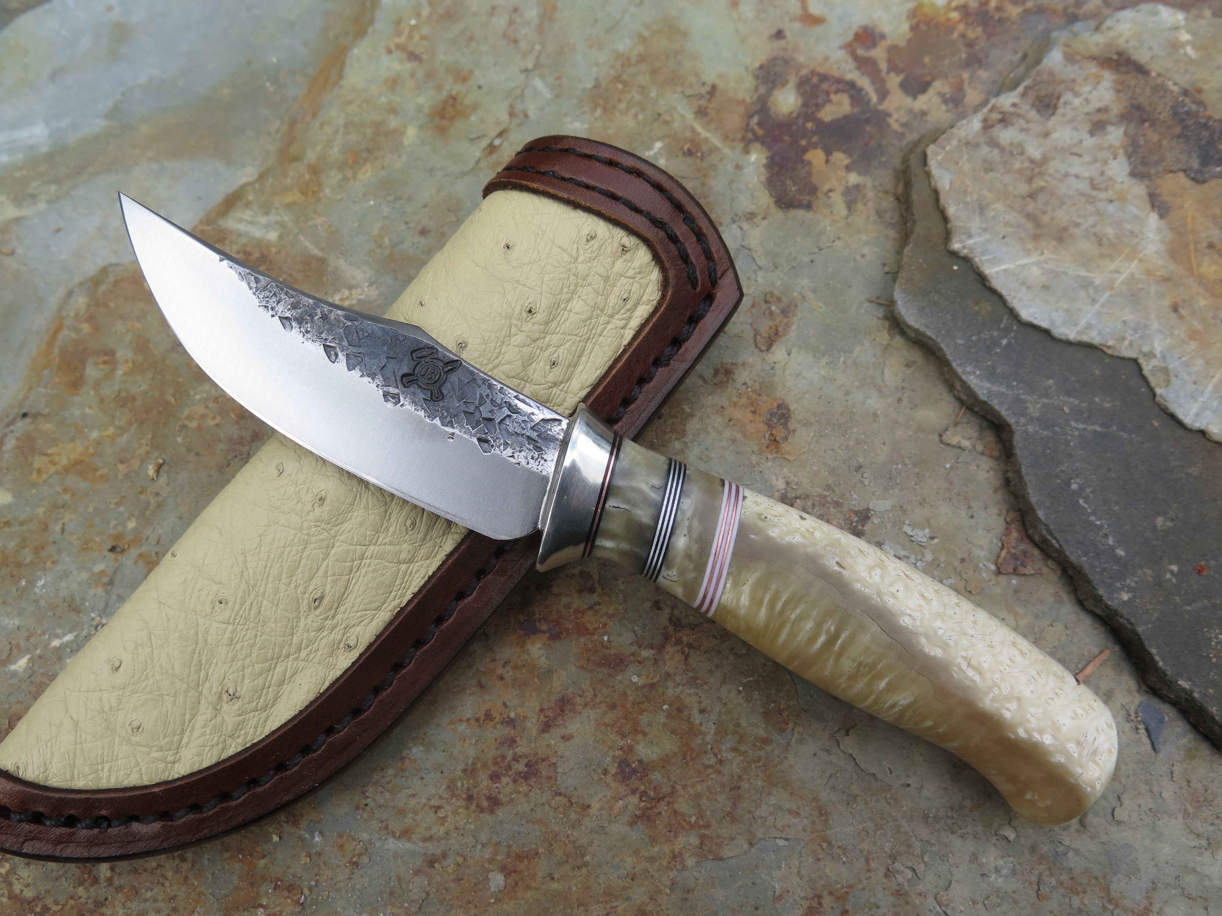 This new Behring Made© Pocket Knife is hand forged from 1/8" thick high carbon 01 tool steel and it measures just shy of 3 1/4" from tip to guard with a razor sharp hollow grind and our hammermark finish. The nickel silver guard is soldered in place above black and white fiber, copper, aluminum and musk ox boss spacers which top a full musk ox boss handle- and the figure is outstanding! Overall length measures 6 5/8" and it comes in a right handed pocket clip sheath with an ostrich inlay.