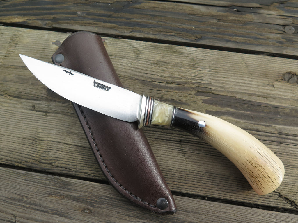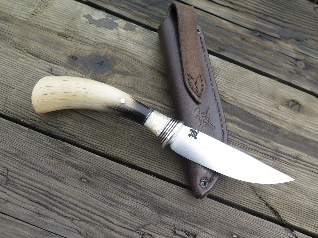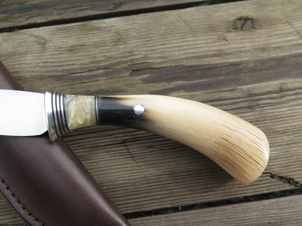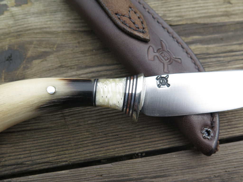 This incredible new Behring Made© Pintail is hand forged from 1/8" thick high carbon 01 tool steel and it measures 3 3/4" from tip to guard with a razor sharp convex grind. The nickel silver guard is soldered in place above black fiber, copper, aluminum and musk ox boss spacers. The premium musk ox carver handle flexes a beautiful range of black to light cream and is pinned through the tang with aluminum. The overall length measures 8" and it comes in a simple belt pouch sheath- though upgrades are available upon request.