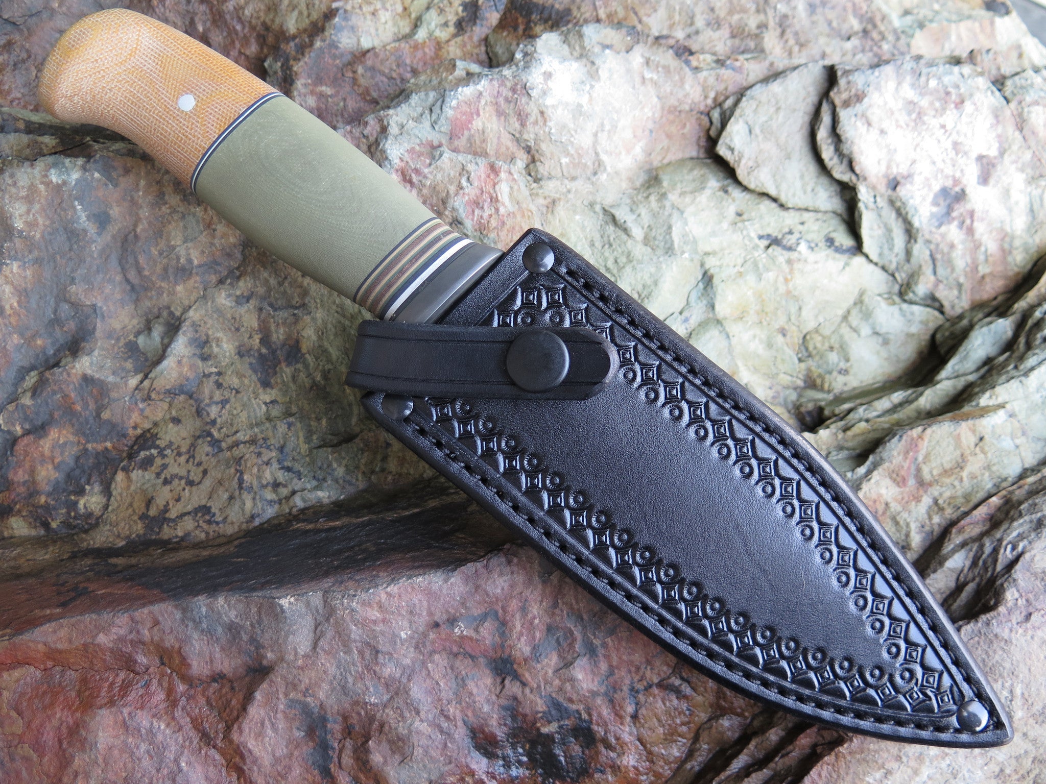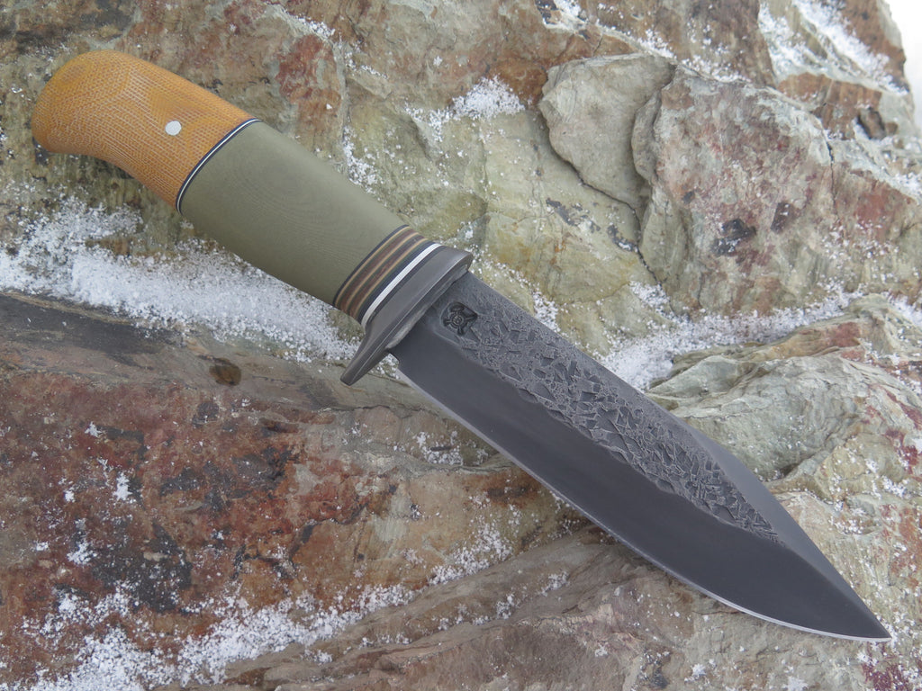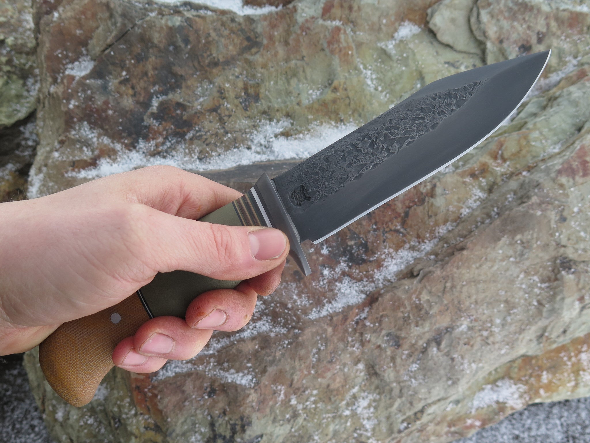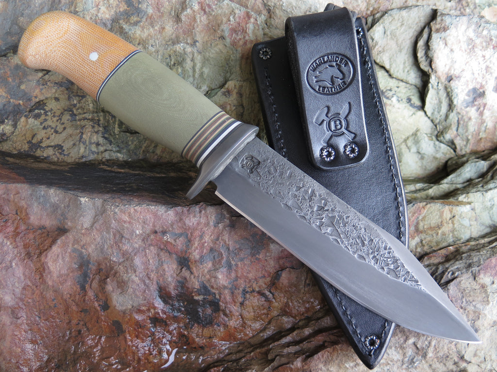 This bad ass new Drop Point from Behring Made is hand forged from 1/4" thick high carbon 01 tool steel and it measures 6" from tip to guard with a razor sharp hollow grind and our forced patina blued finish. The blued steel guard is silver-soldered in place above black fiber, aluminum and g-wood spacers as well as a od green g10 and natural canvas micarta- all with a bead blasted finish. The overall length measures 10 3/4" and it comes in a custom sheath from Warlander Leather.