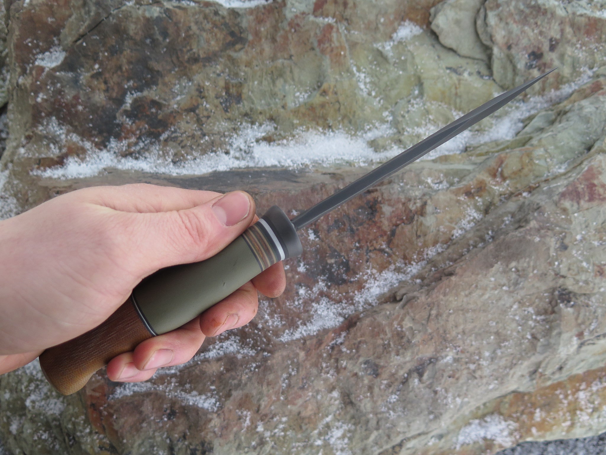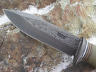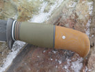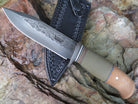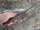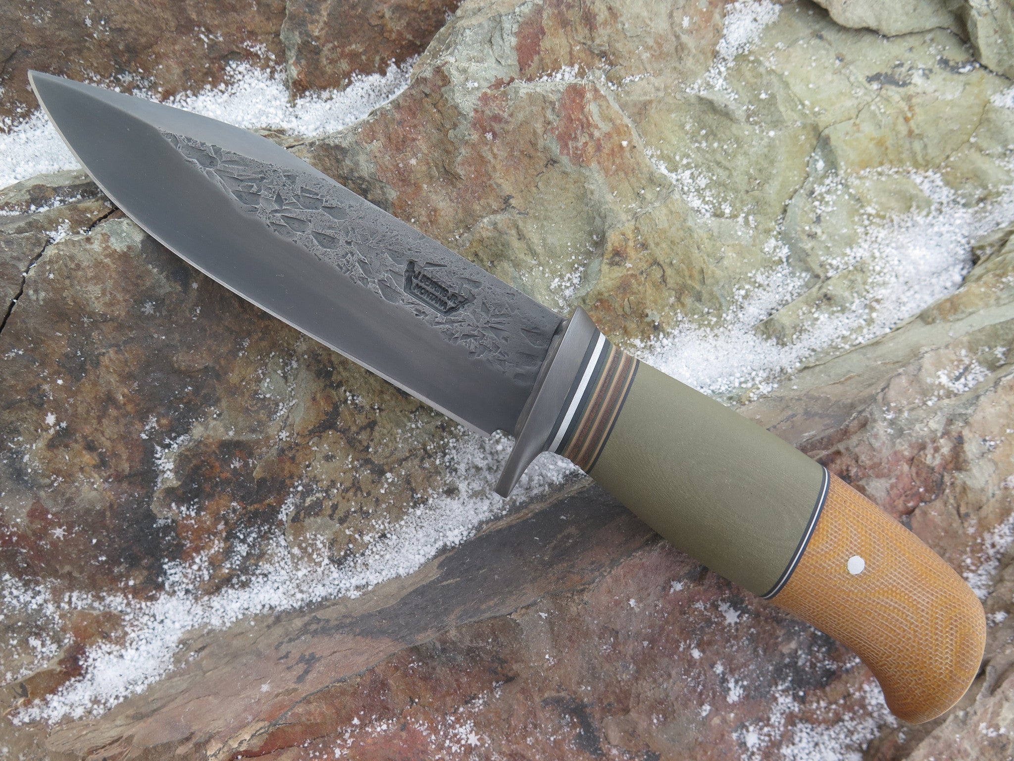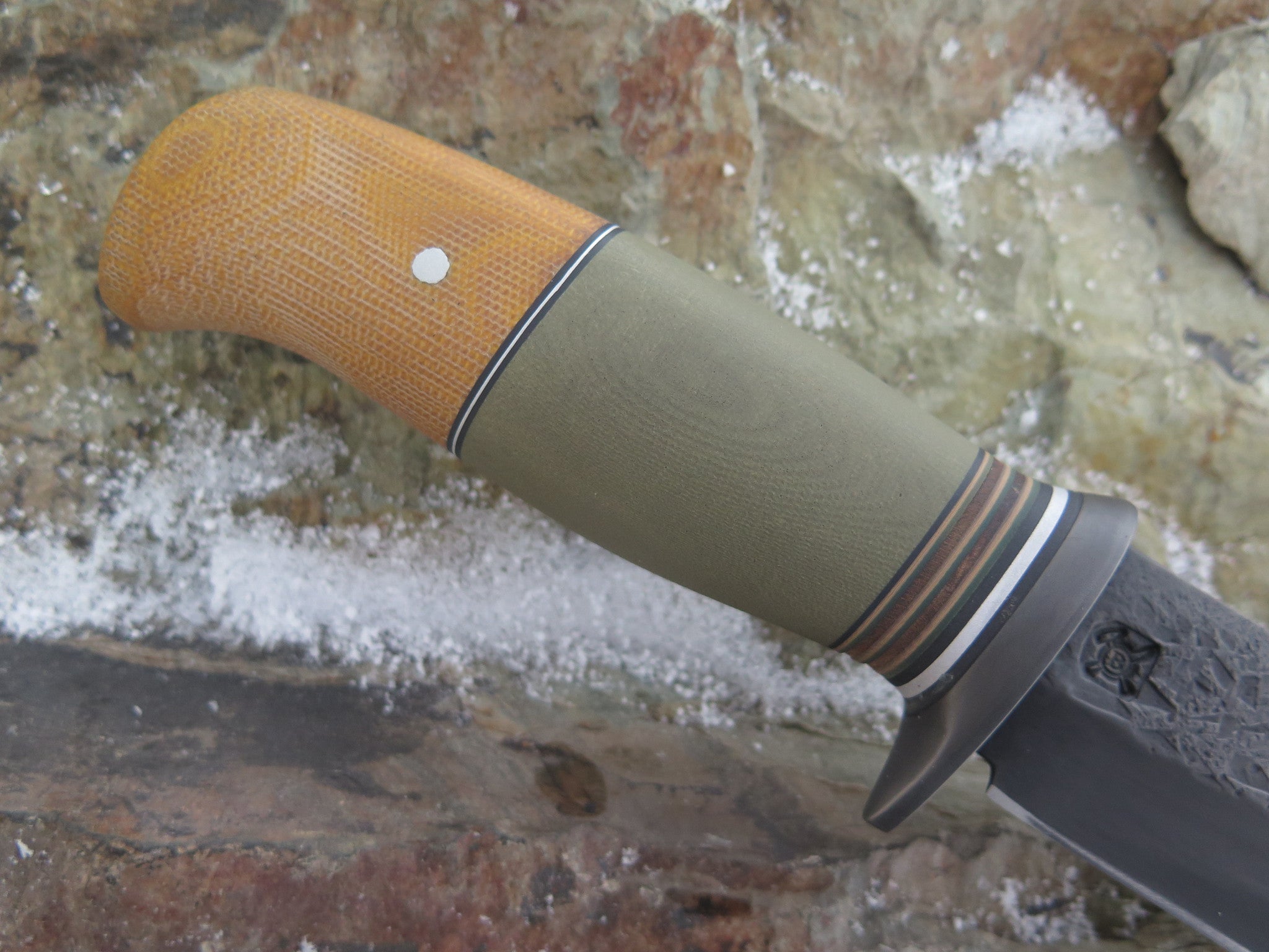 This bad ass new Drop Point from Behring Made is hand forged from 1/4" thick high carbon 01 tool steel and it measures 6" from tip to guard with a razor sharp hollow grind and our forced patina blued finish. The blued steel guard is silver-soldered in place above black fiber, aluminum and g-wood spacers as well as a od green g10 and natural canvas micarta- all with a bead blasted finish. The overall length measures 10 3/4" and it comes in a custom sheath from Warlander Leather.