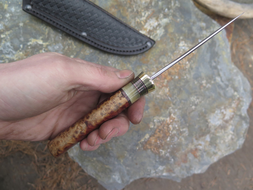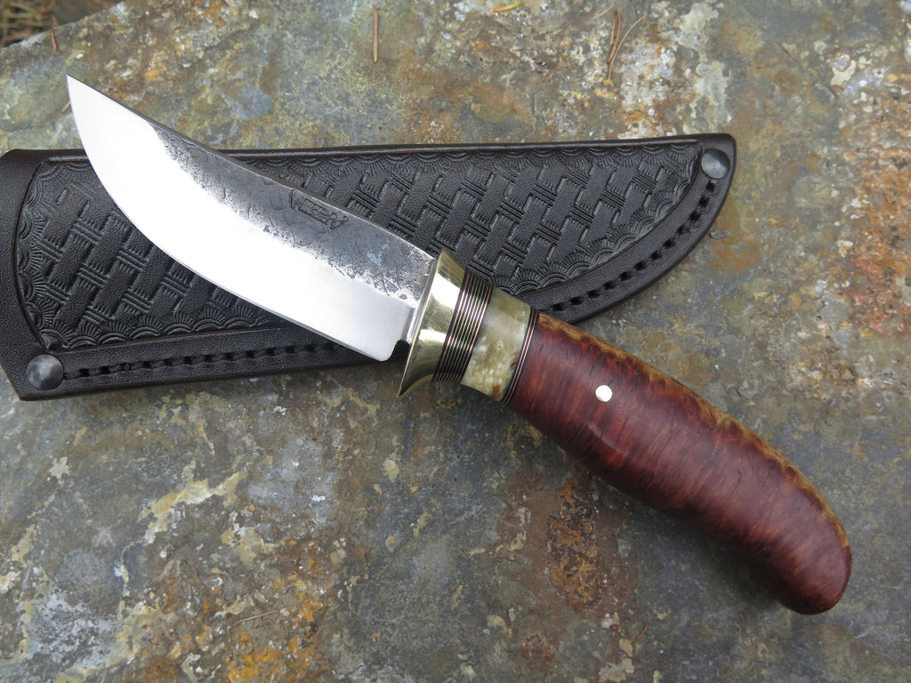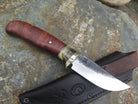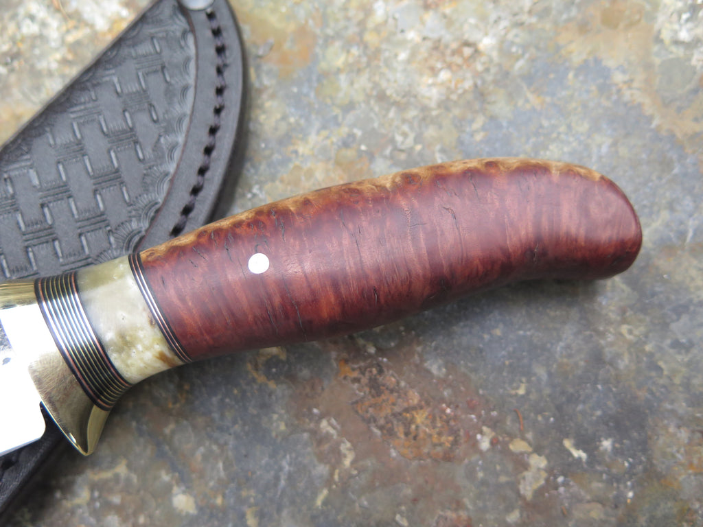 This sized-down Hunter from Behring Made© is hand forged from 1/8" thick high carbon 01 tool steel and it measures 3 3/4" from tip to guard with a razor sharp hollow grind and our hammermark finish. The brass guard is soldered in place above a notable stack of brass, copper, black fiber and musk ox boss spacers which contrast the incredible amboyna burl handle that's pinned through the tang with brass. The overall length measures 8 1/8" and it comes in a leather belt pouch sheath.