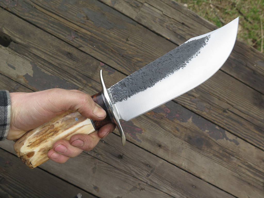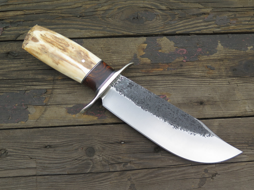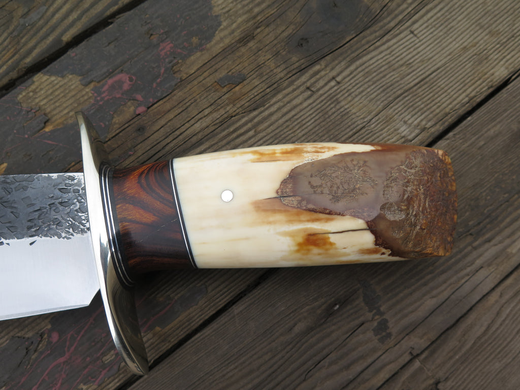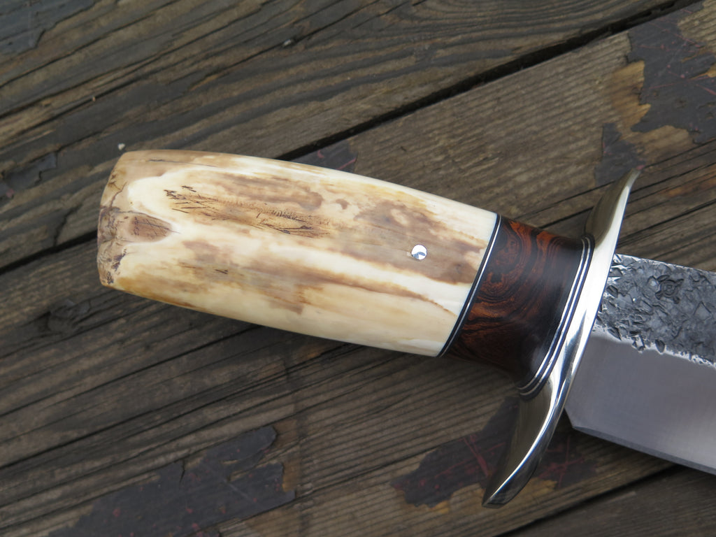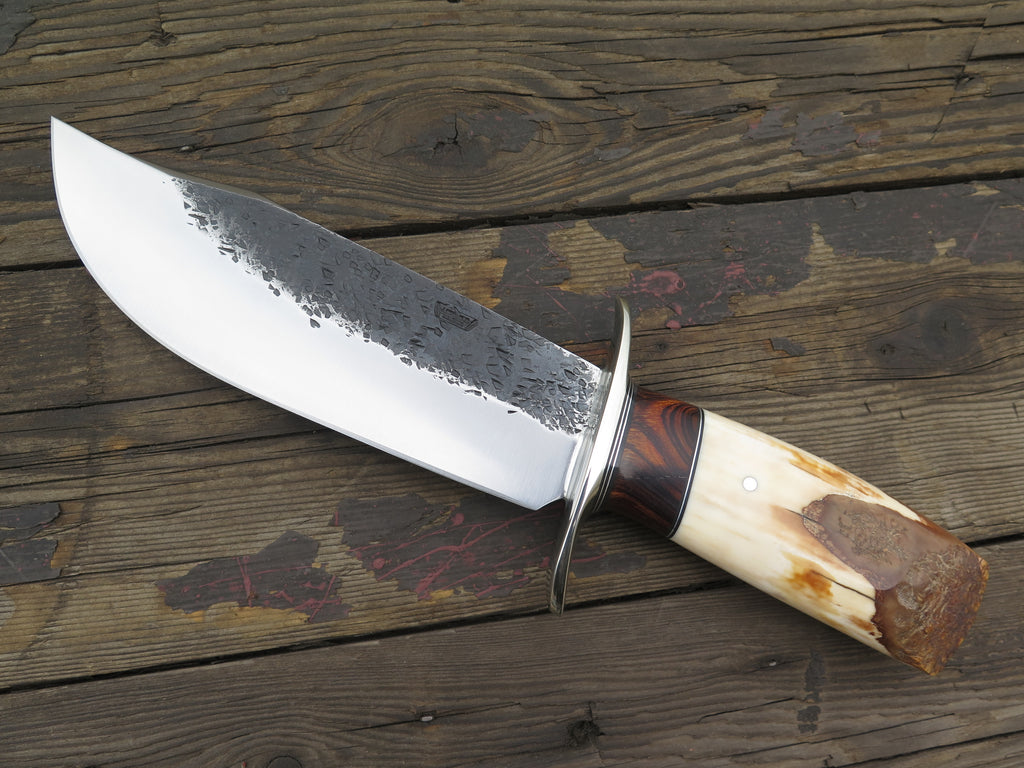 This astounding new Southwest Bowie from Behring Made™ is hand forged from 1/4" thick high carbon 01 tool steel and it measures 8" from tip to guard with a big fat hollow grind (2" belly!) and our hammermark finish. The tall nickel silver s-guard is soldered in place above black fiber, aluminum and desert ironwood burl wood spacers as well as a premium artifact walrus ivory ice chisel that's pinned with aluminum. Overall length measures 13" and it comes in a custom sheath from Warlander Leather. *PLEASE CONTACT TO ORDER