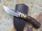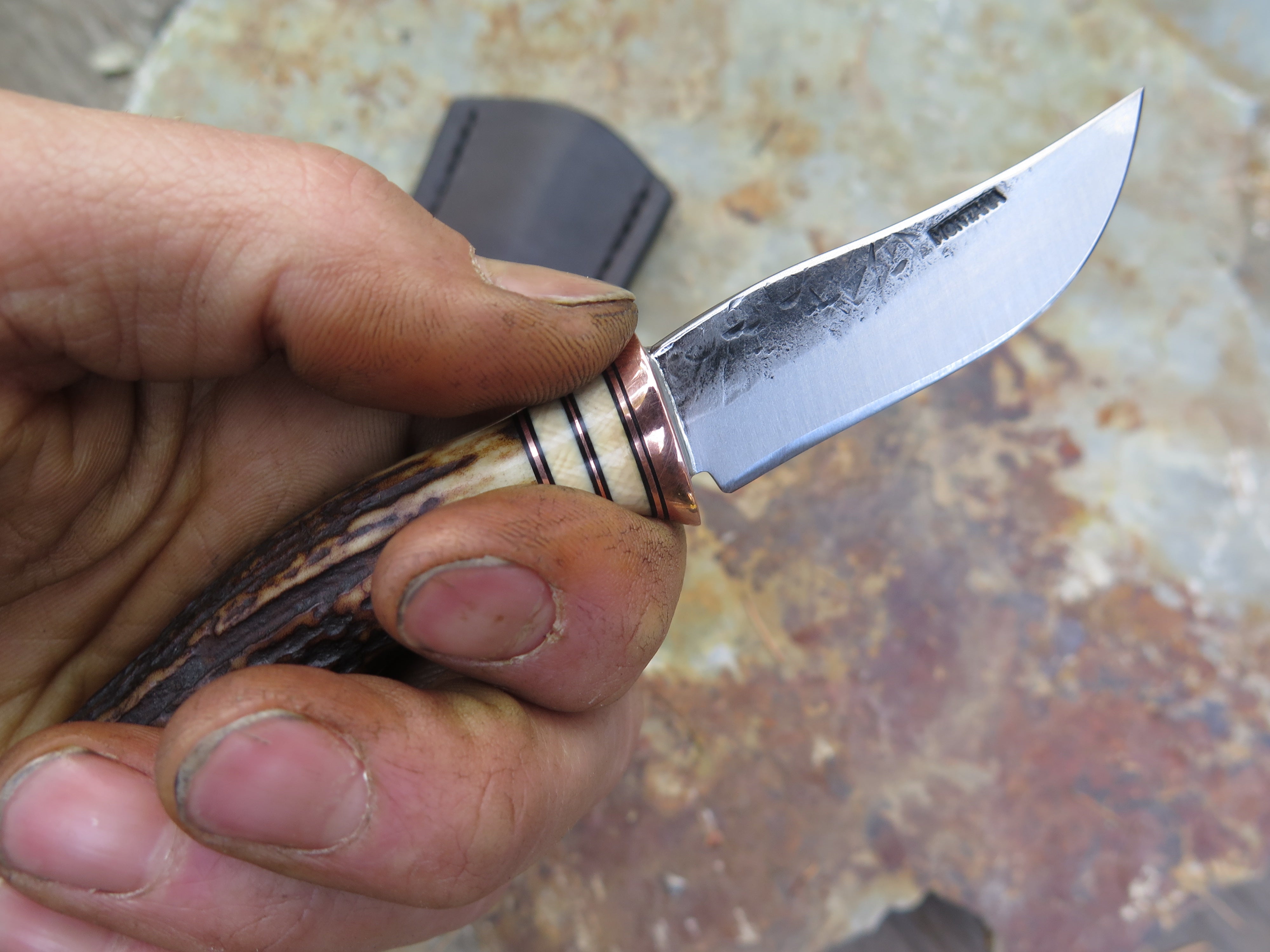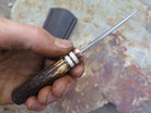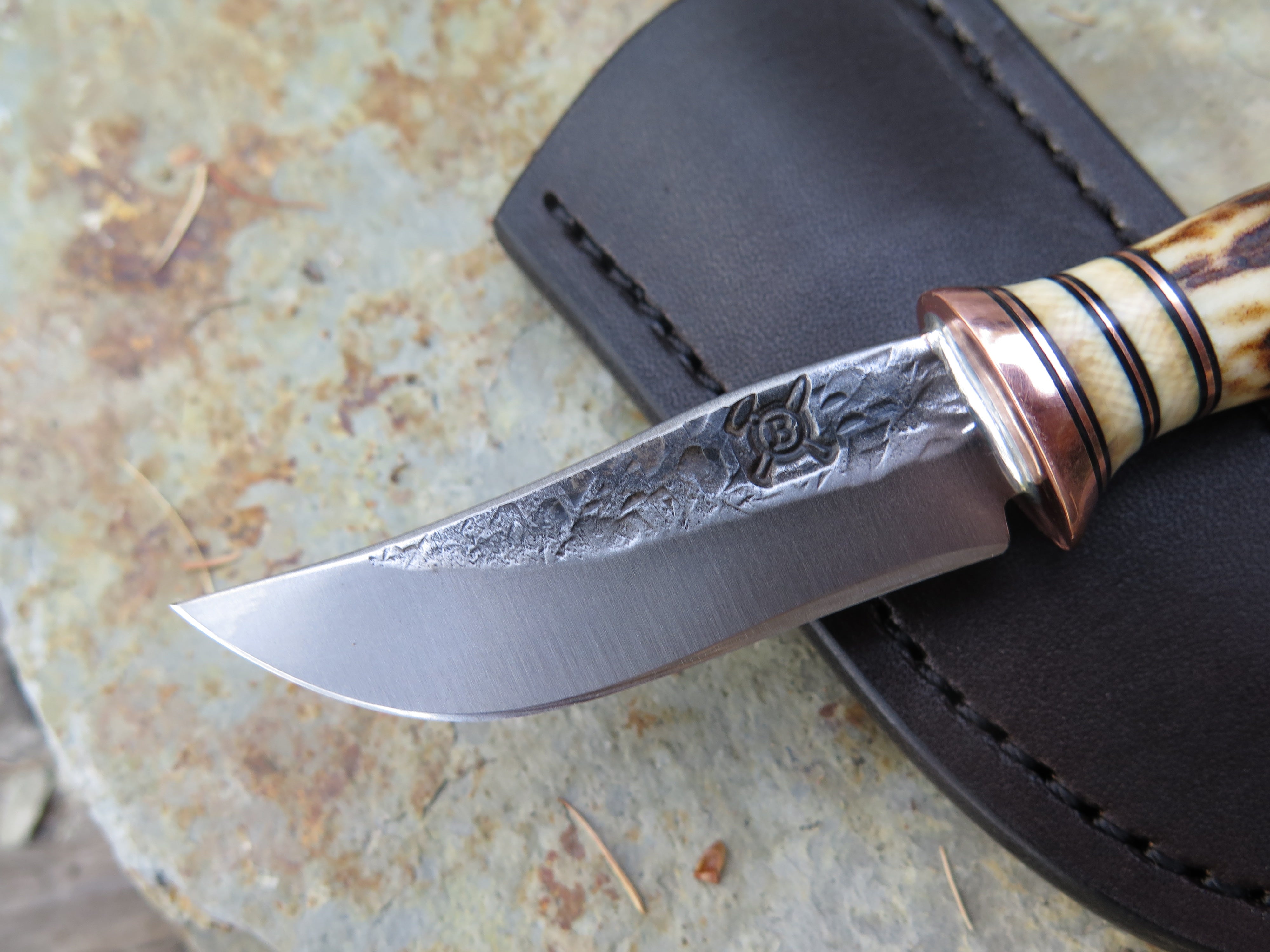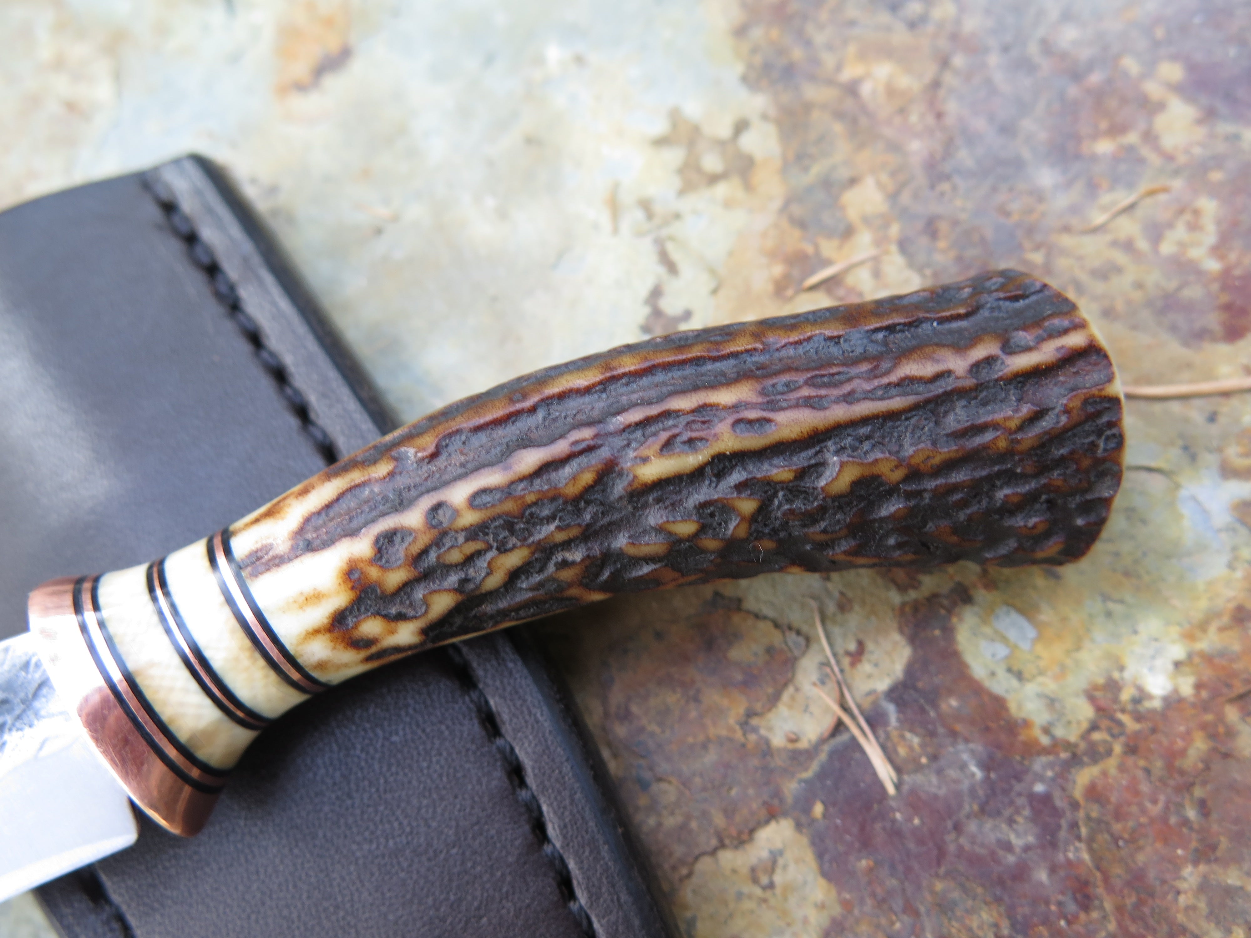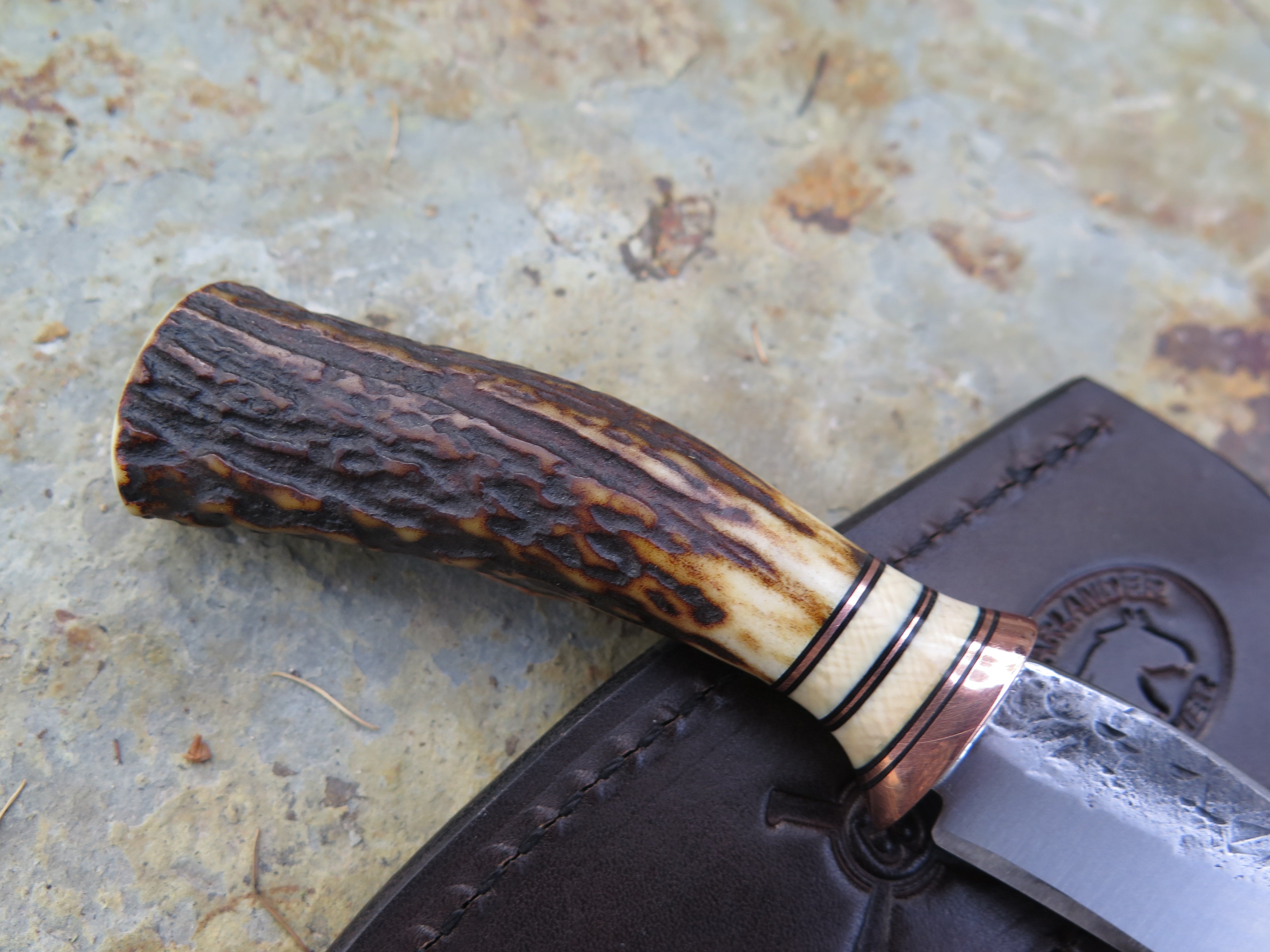 This sleek new 5th pocket from Behring Made© is hand forged from 1/8" thick high carbon 01 tool steel and it measures 2 1/2" from tip to guard with a razor sharp hollow grind and our hammermark finish. The copper guard is soldered in place above black fiber, copper, and two mammoth ivory spacers with a beautiful axis stag handle that brings the overall length out to 5 3/8". The simple leather sleeve makes this a discreet and easy carry, and we guarantee it a joy to use! This is an archive listing- please allow 4 to 6 weeks for production / delivery.