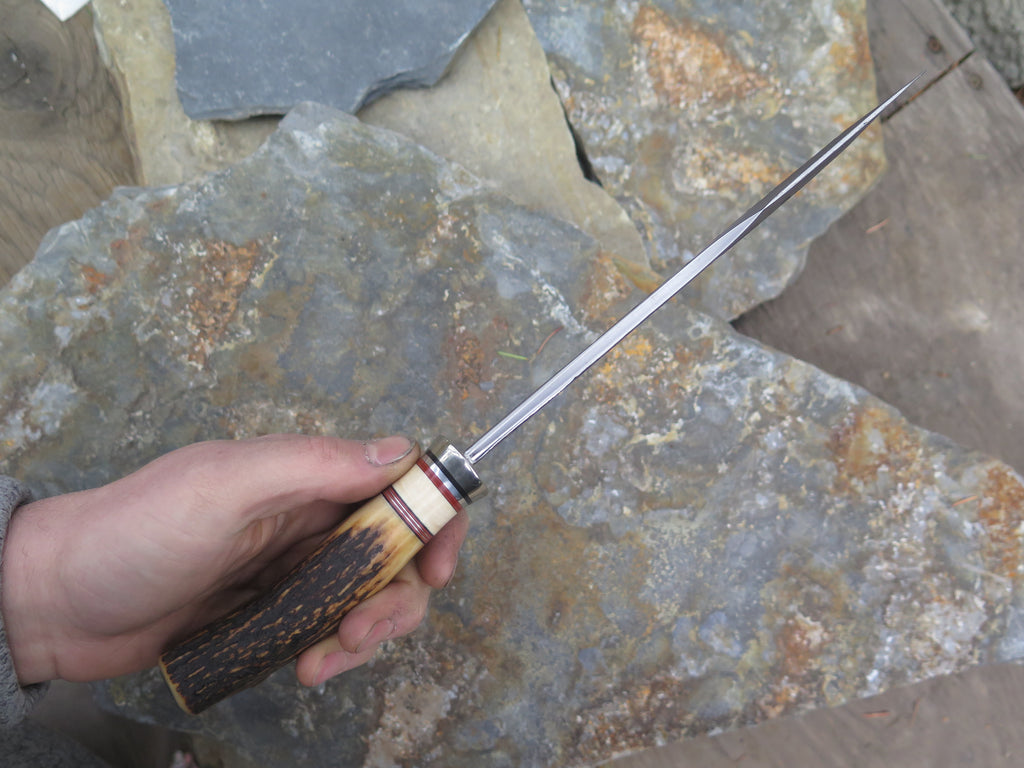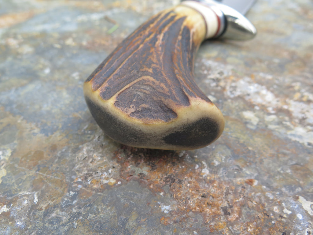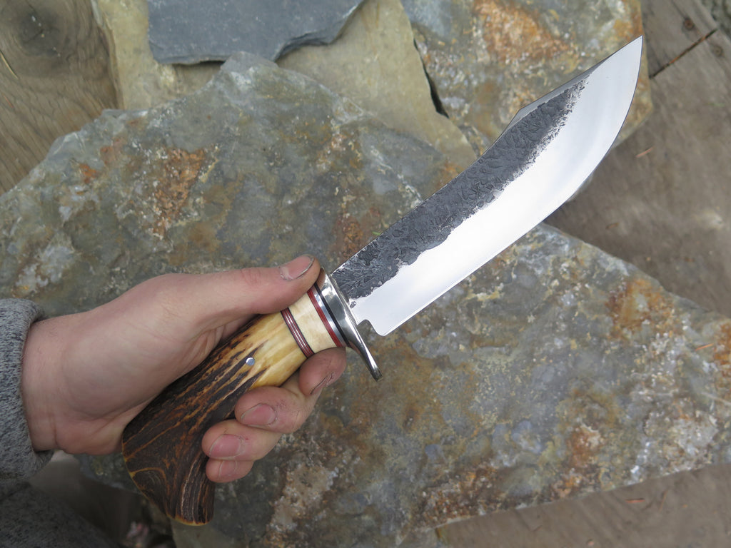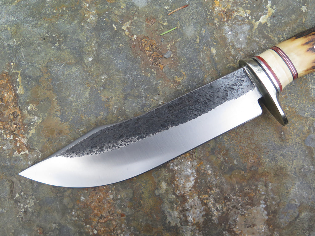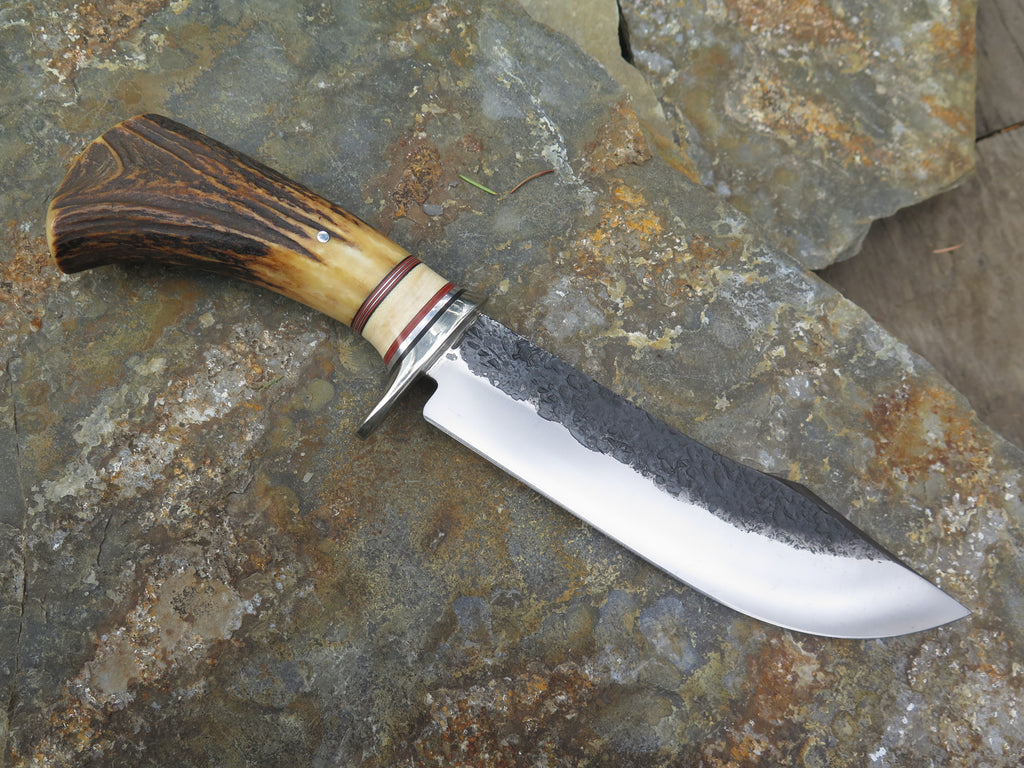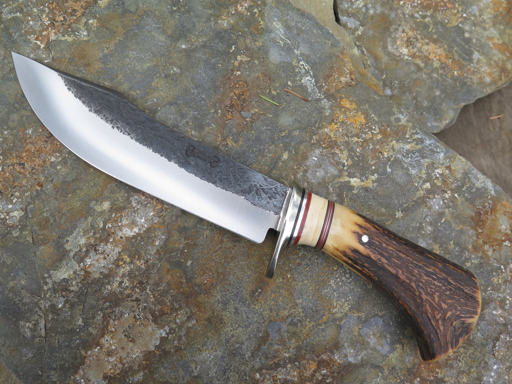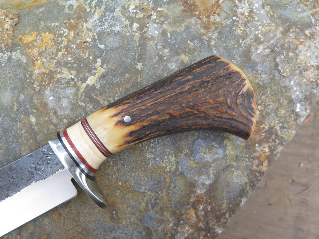 This beautiful new Behring Made© Clip Point is hand forged from 13/64" thick 5160 spring steel and it measures 7 1/2" from tip to guard with a razor sharp hollow grind and our hammermark finish. The nickel silver guard is soldered in place above black and maroon fiber, aluminum and ancient mammoth ivory spacers as well as a premium crotch sambar stag handle that James pinned through the tang with aluminum. The overall length measures 12 3/8" and we're sending this one to Rowe's Leather for a custom sheath.