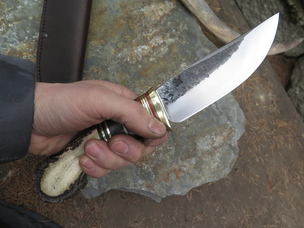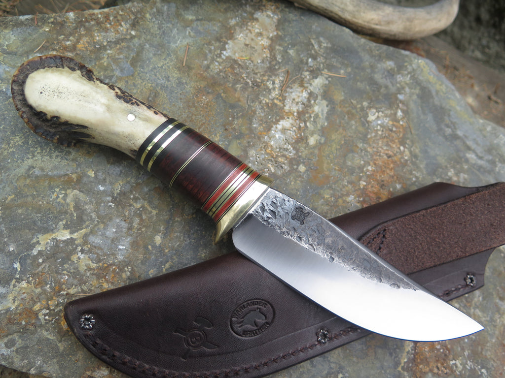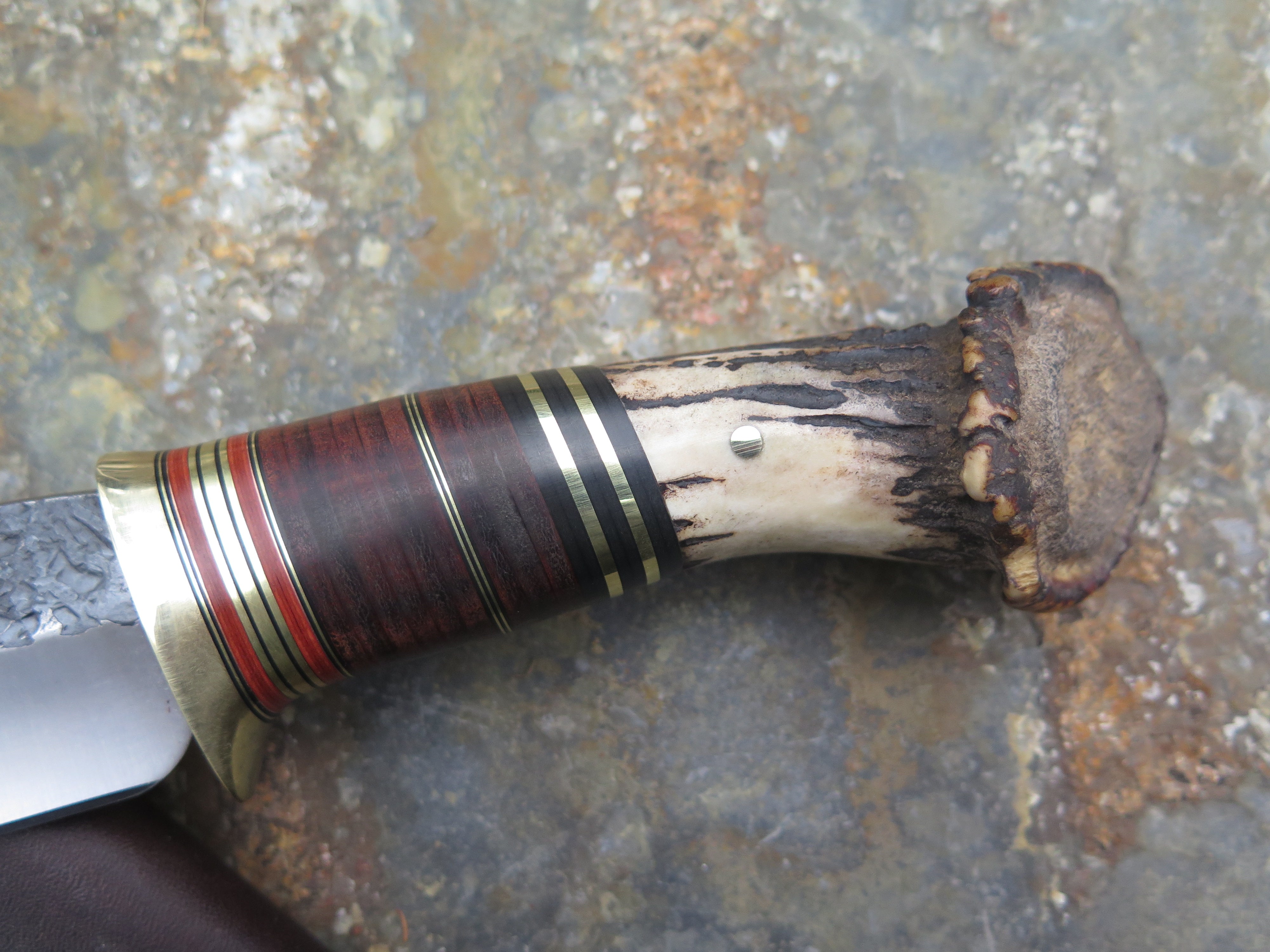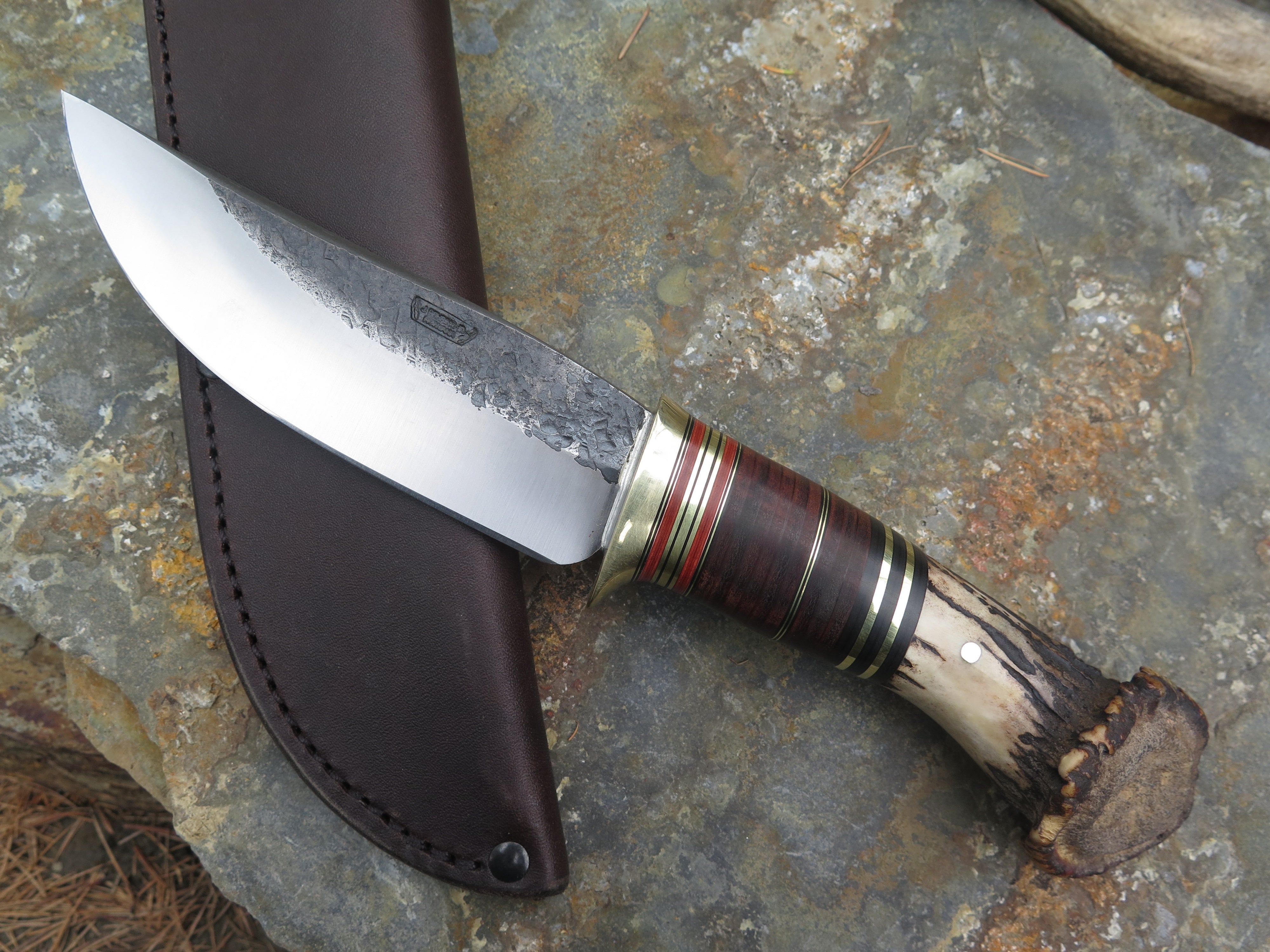 This outstanding new Hunter from Behring Made© is hand forged from 3/16" thick high carbon 01 tool steel and it measures 5 1/2" from tip to guard with a razor sharp hollow grind and our hammermark finish. The brass guard is soldered in place above black and maroon fiber, brass and horsehide leather spacers with a premium sambar crown stag butt that's pinned through the tang with brass. The overall length measures 10 3/4" and it comes in a classic leather belt pouch sheath.