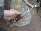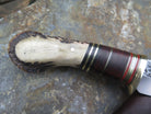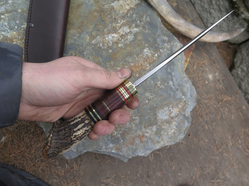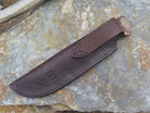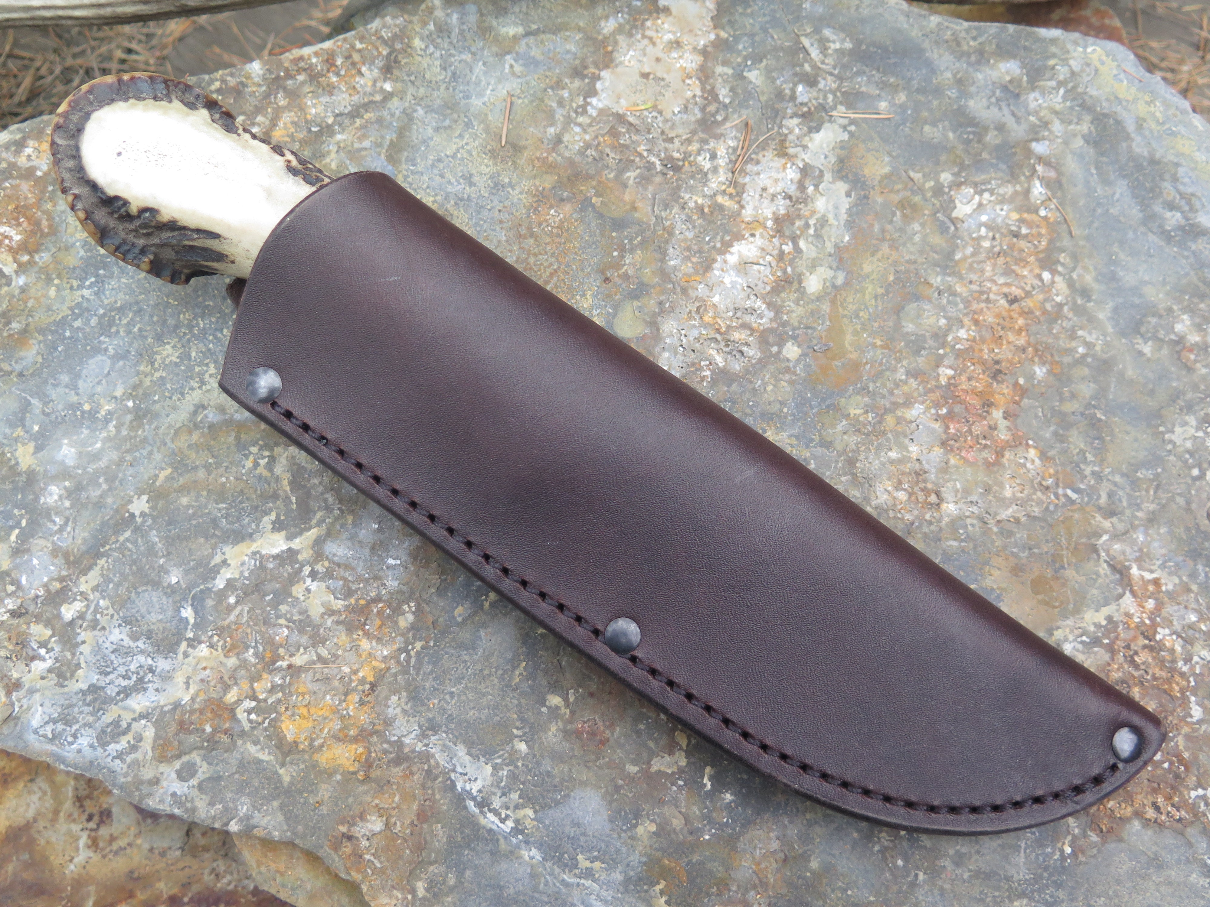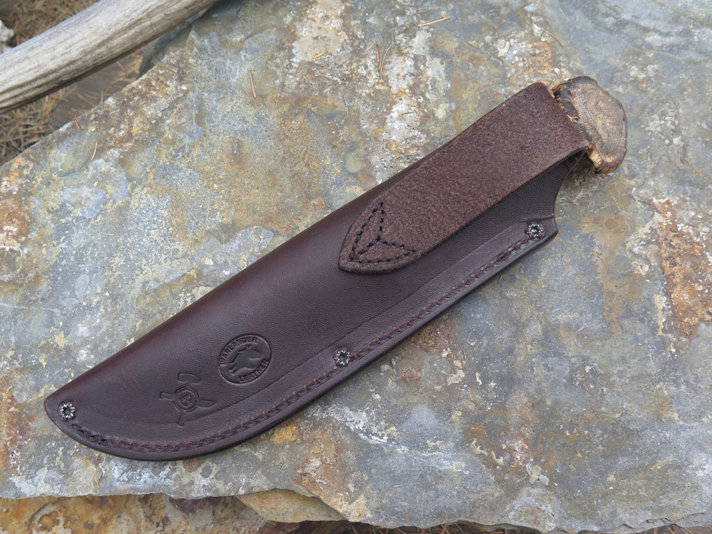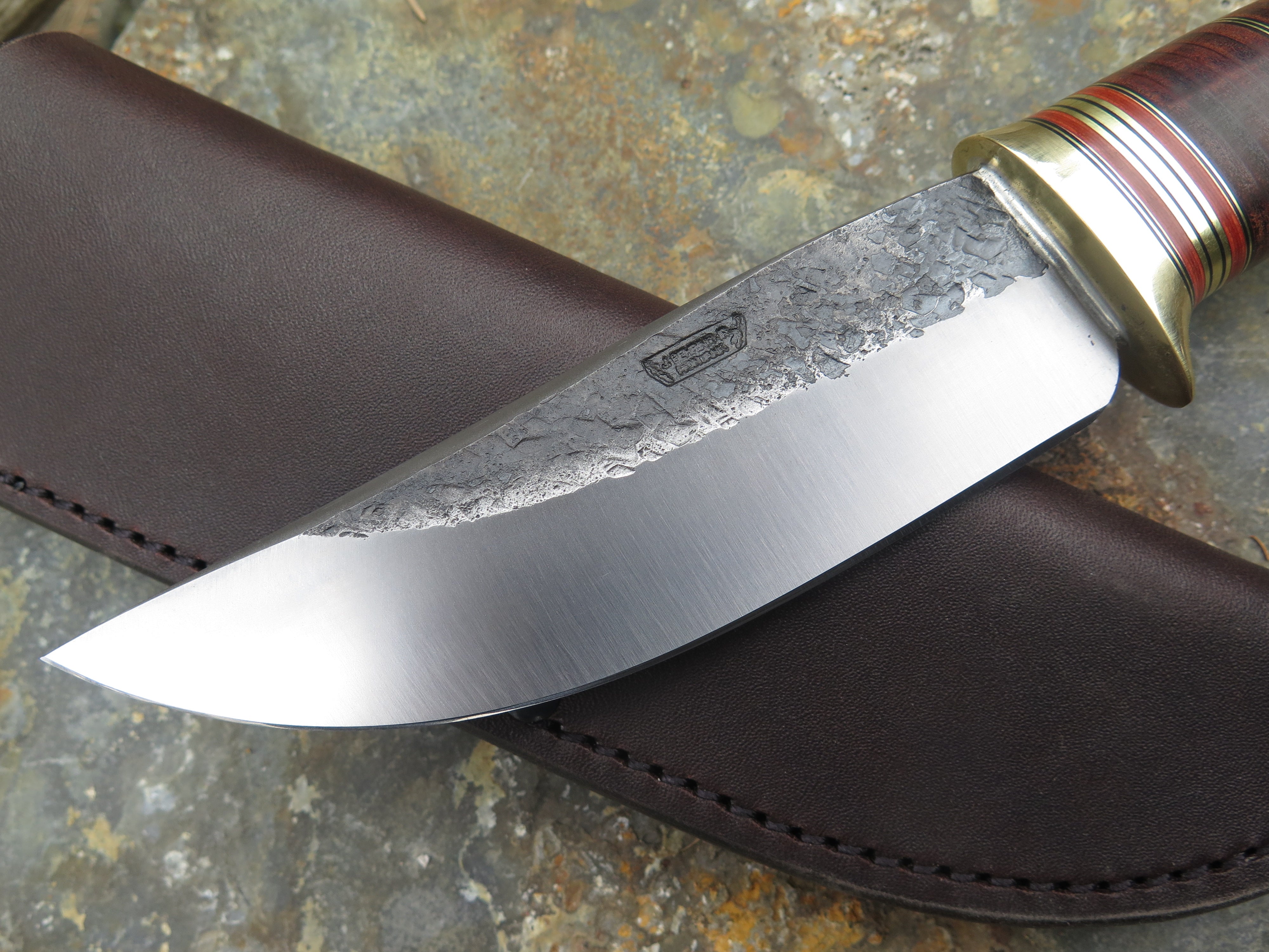 This outstanding new Hunter from Behring Made© is hand forged from 3/16" thick high carbon 01 tool steel and it measures 5 1/2" from tip to guard with a razor sharp hollow grind and our hammermark finish. The brass guard is soldered in place above black and maroon fiber, brass and horsehide leather spacers with a premium sambar crown stag butt that's pinned through the tang with brass. The overall length measures 10 3/4" and it comes in a classic leather belt pouch sheath.
