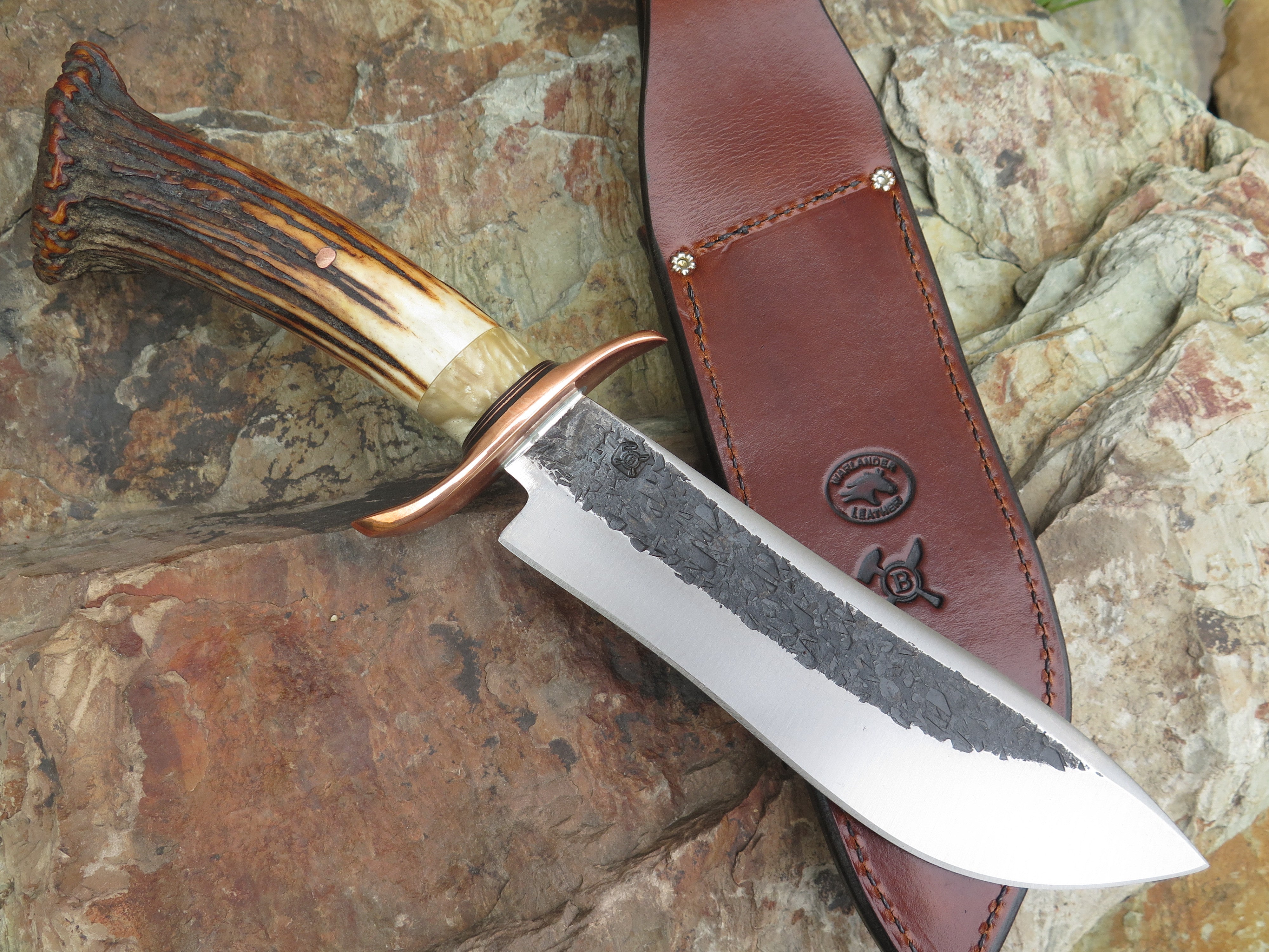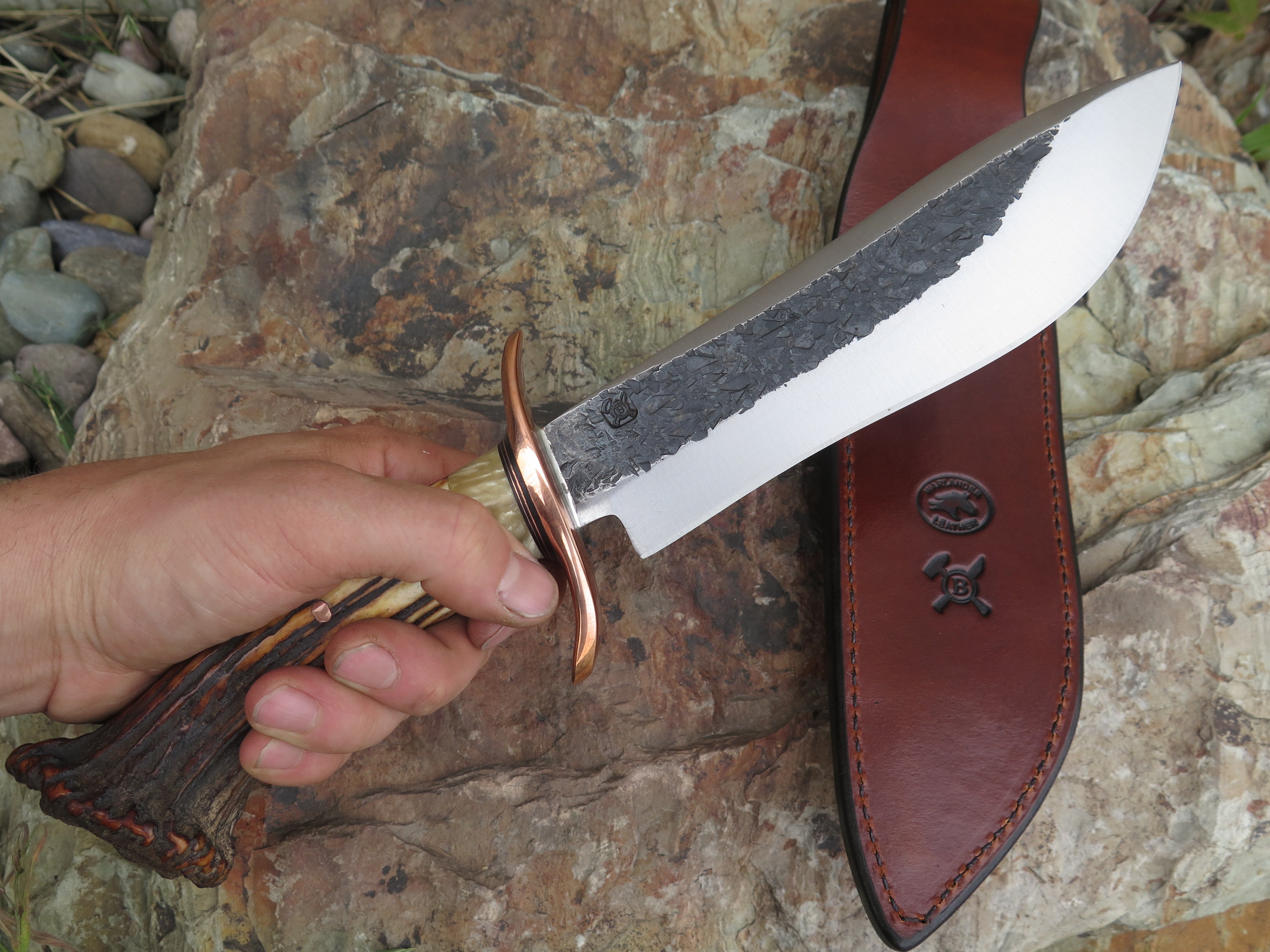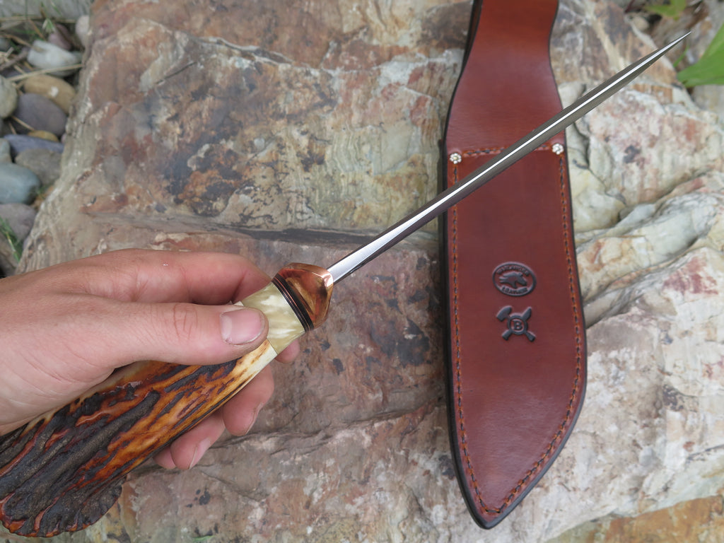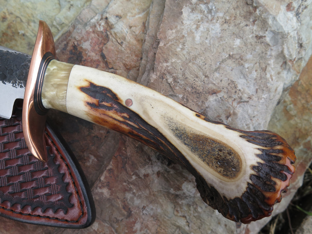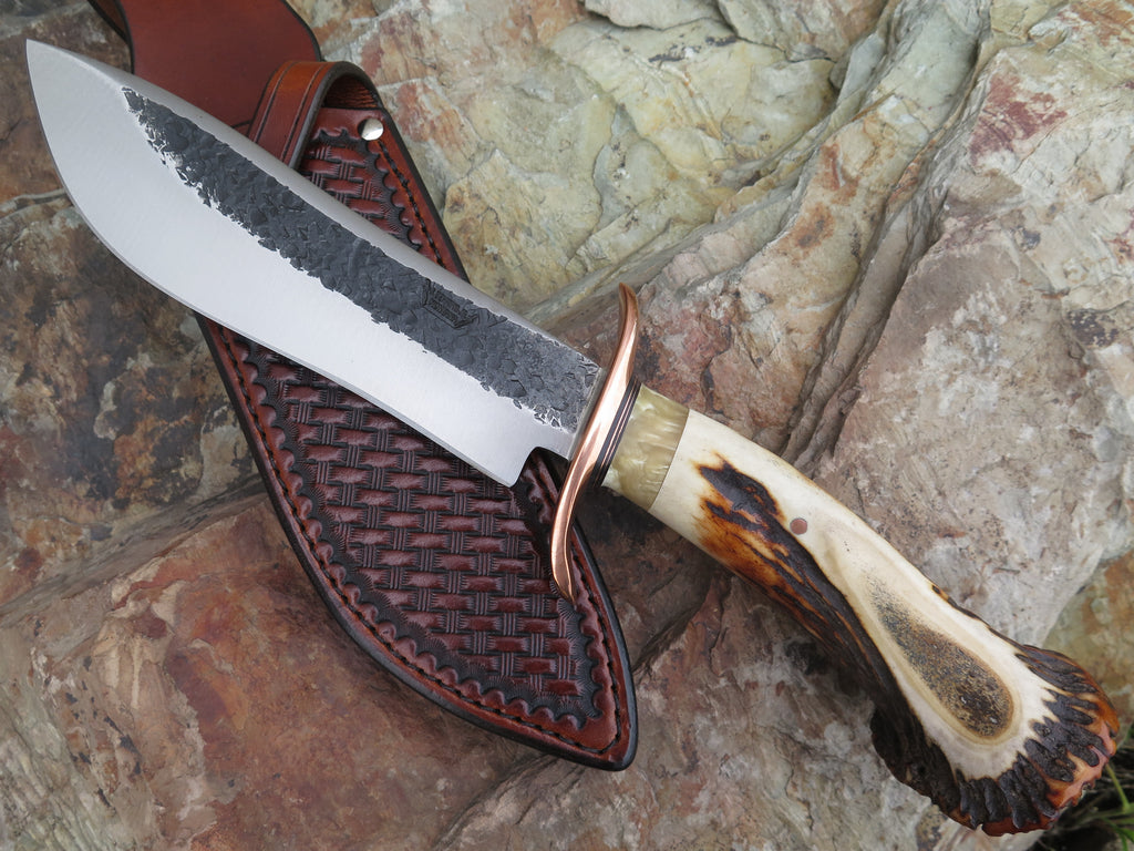 This ultra camp knife from Behring Made™ is better known as the Sasquatch. Hand forged from 1/4" thick high carbon 01 tool steel, the blade measures 7 3/4" from tip to guard with a razor sharp hollow grind and our hammermark finish. The forged copper s-guard is soldered in place above black fiber and copper spacers with a gorgeous piece of musk ox boss that compliments the premium sambar crown stag handle that's pinned with copper. The overall length measures 13 1/2" and it comes in a custom Warlander Leather sheath.
