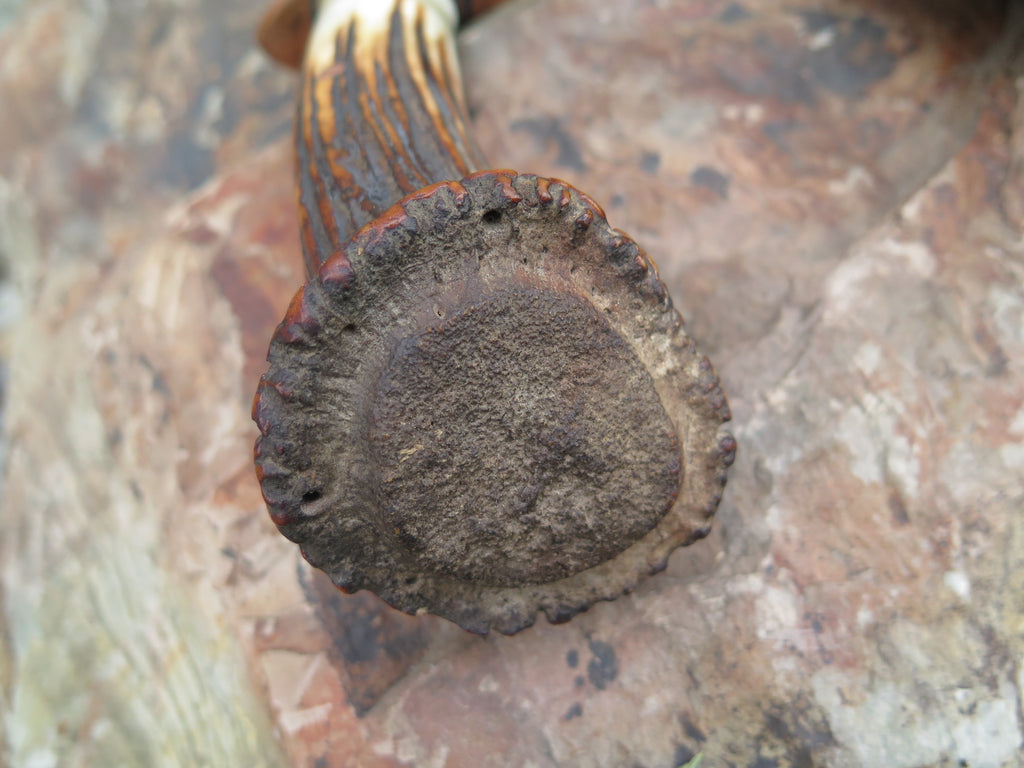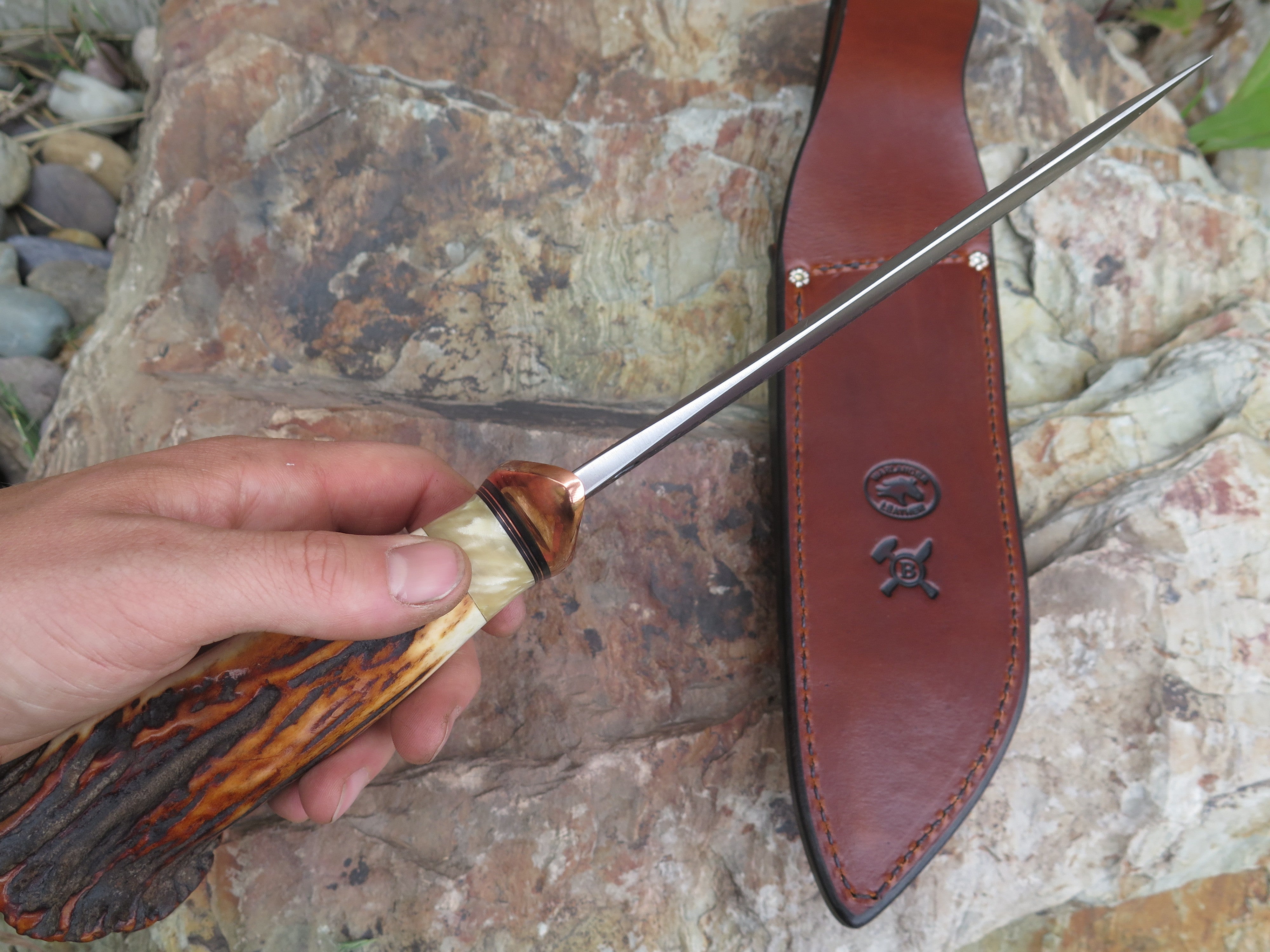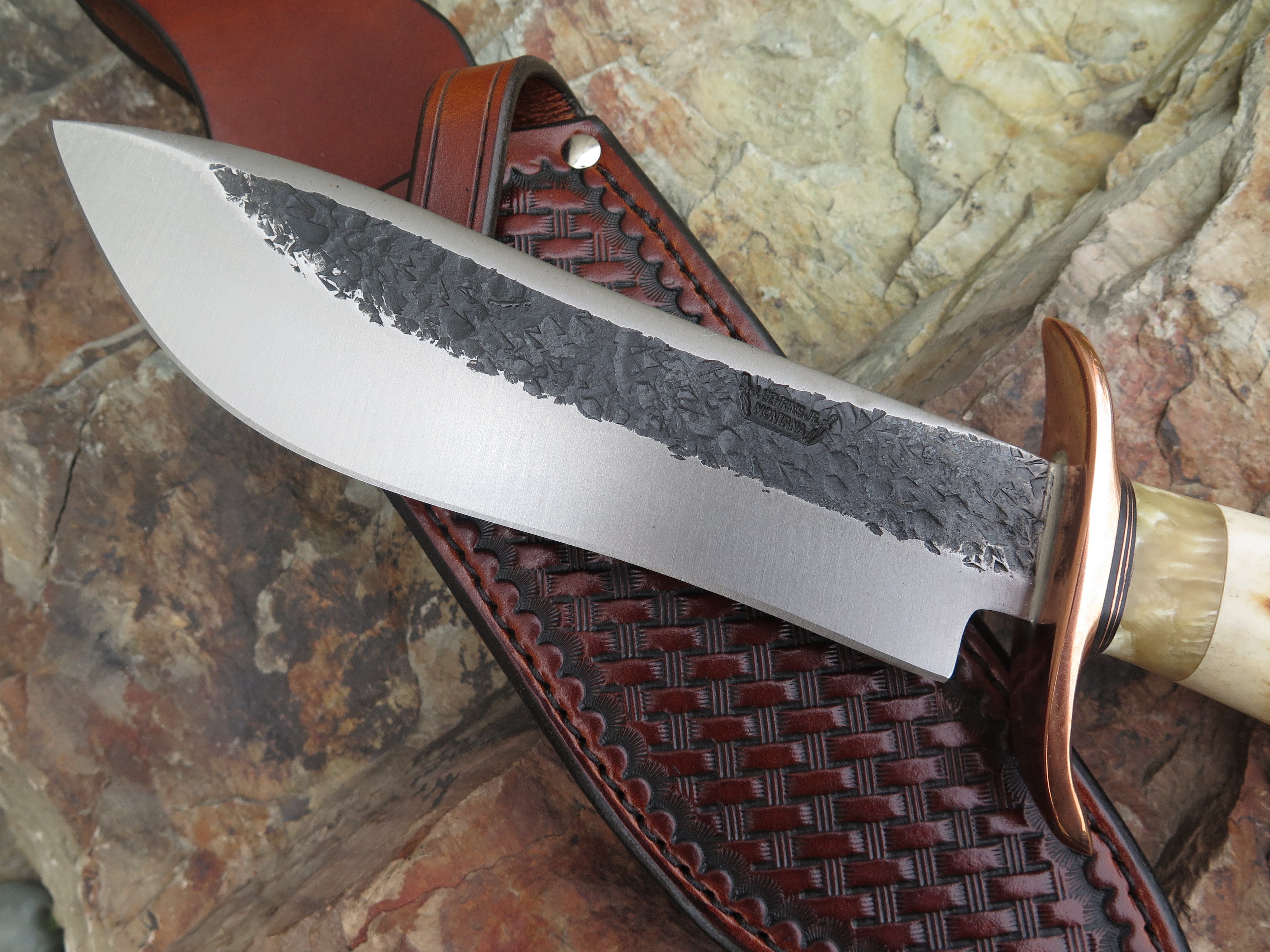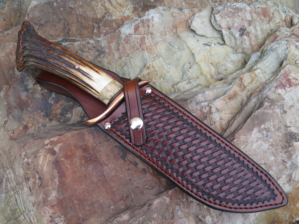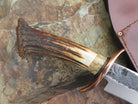 This ultra camp knife from Behring Made™ is better known as the Sasquatch. Hand forged from 1/4" thick high carbon 01 tool steel, the blade measures 7 3/4" from tip to guard with a razor sharp hollow grind and our hammermark finish. The forged copper s-guard is soldered in place above black fiber and copper spacers with a gorgeous piece of musk ox boss that compliments the premium sambar crown stag handle that's pinned with copper. The overall length measures 13 1/2" and it comes in a custom Warlander Leather sheath.