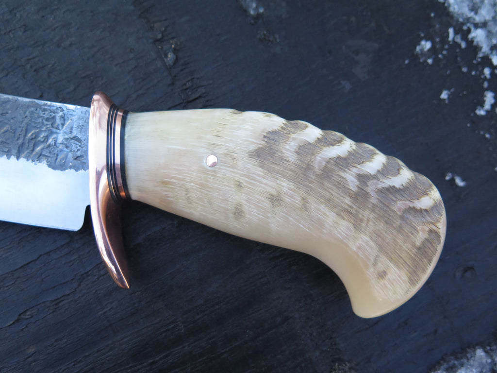 This beastly new Camp Knife from Behring Made© is hand forged from 1/4" thick high carbon 01 tool steel and it measures 9" from tip to guard with a razor sharp hollow grind and our hammermark finish. The forged copper half-s guard is soldered in place above black fiber and copper spacers atop an outstanding handle made from a Dall sheep horn curl with that lovable texture on both sides- plus we pinned it through the tang with copper for a durable construction we guarantee for life. A knife this big needs custom leather, so it's off to Warlander and will be tooled to compliment the handle.