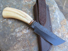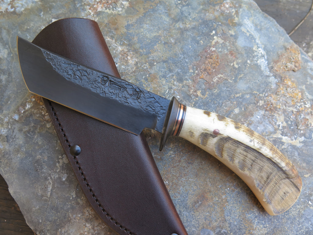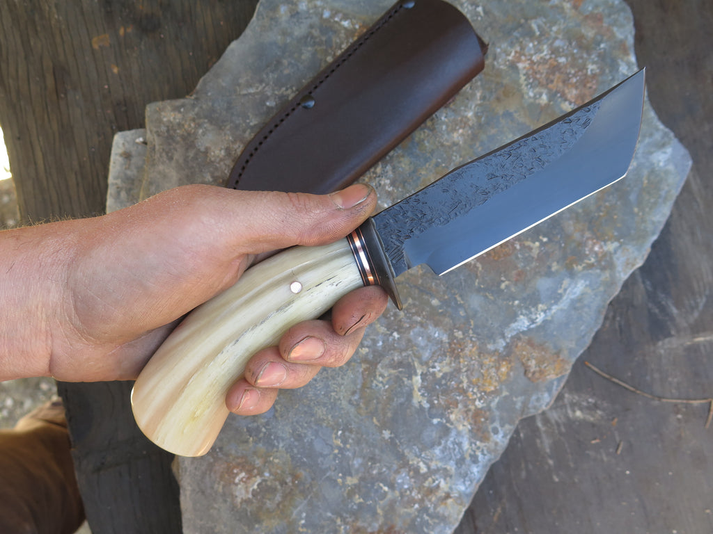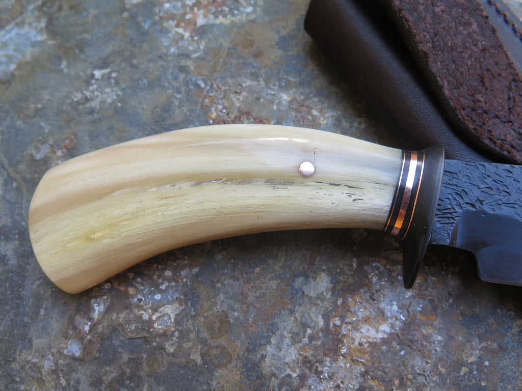 This nasty new Tanto from Behring Made© is hand forged from 3/16" thick high carbon 01 tool steel and it measures 5" from tip to guard with a razor sharp hollow grind, hammermarks and our forced patina blued finish. The blued steel guard is soldered in place above black and copper spacers as well as a remarkable Dall's sheep horn handle that dons the outer horn texture on one side and the inner core creaminess on the other- plus it's pinned with copper. The overall length measures 9 5/8" and it comes in a classic leather belt pouch sheath.