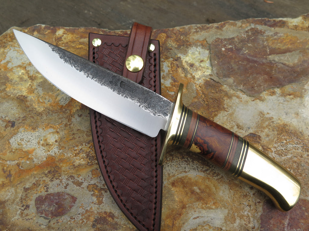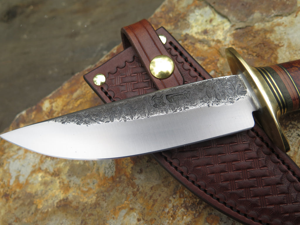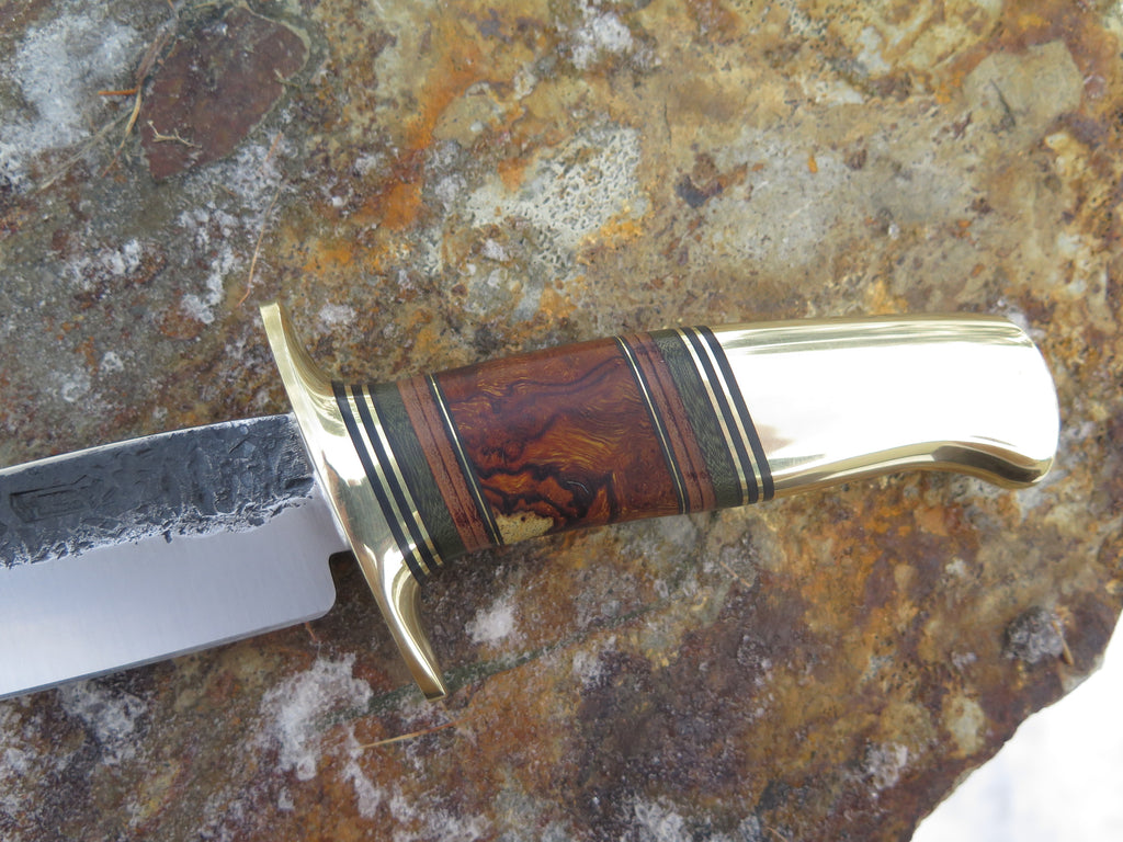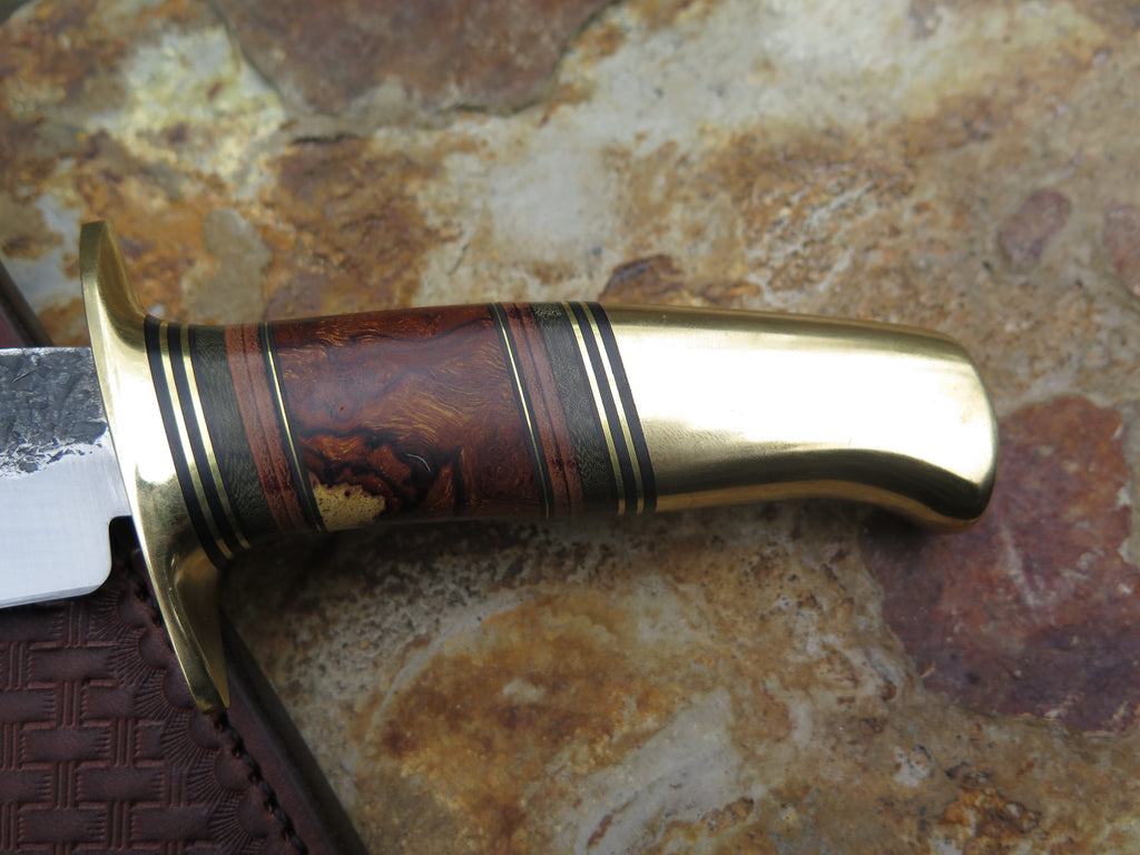 This incredible new Fighter from Behring Made© is hand forged from 3/16" thick high carbon 01 tool steel and it measures 6" from tip to guard with a razor sharp hollow grind and our hammermark finish. The tall brass guard is soldered in place above black fiber, brass horsehide, green micarta spacers and a gorgeous ironwood burl core that's butted with brass, which is also pinned through the tang with brass. The overall length measures 10 1/2" and it comes in a custom sheath from Warlander Leather.