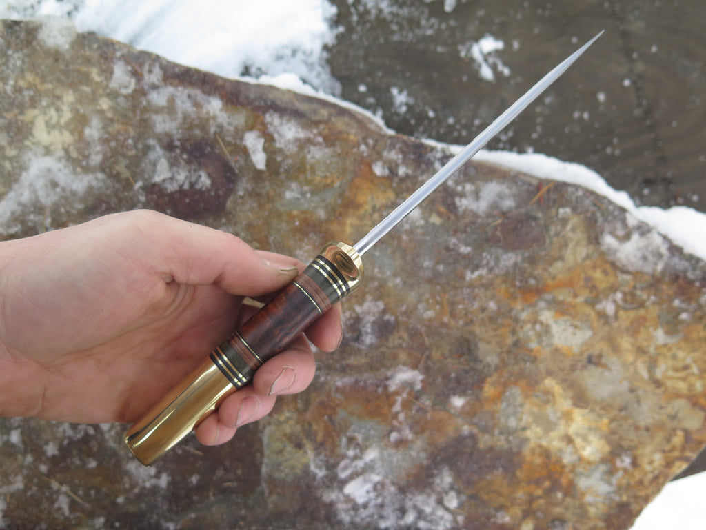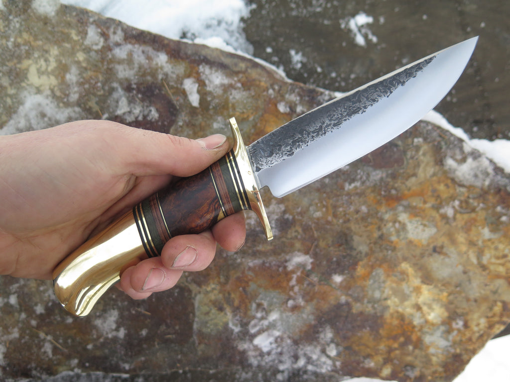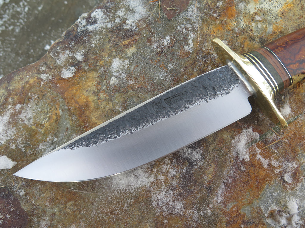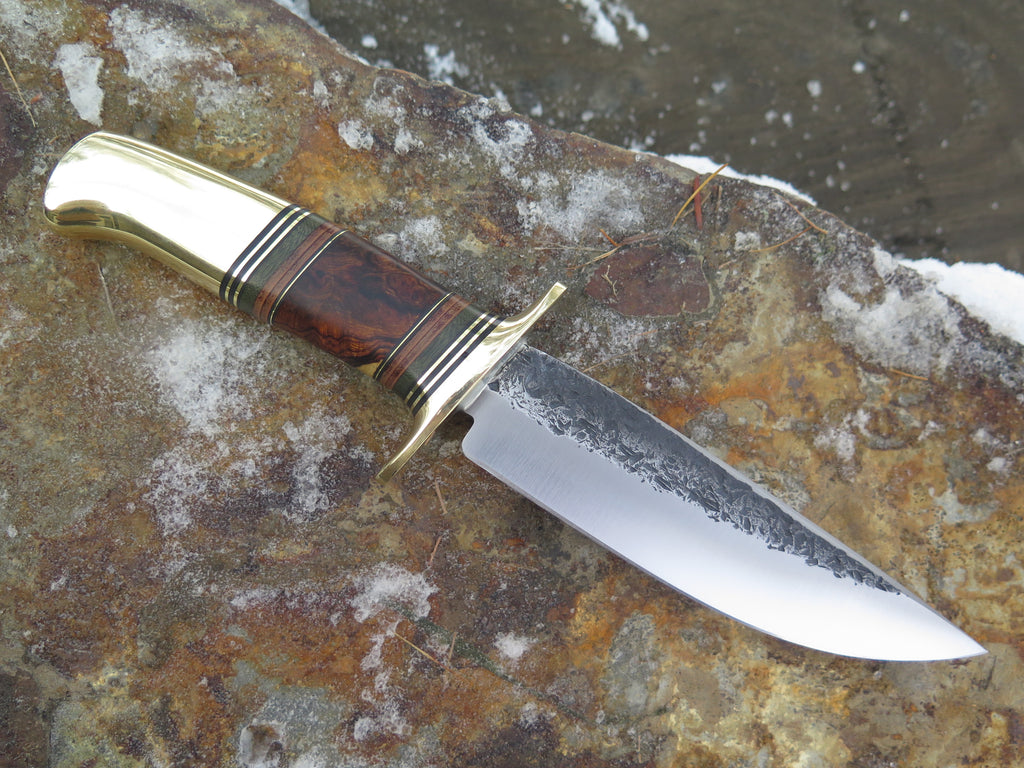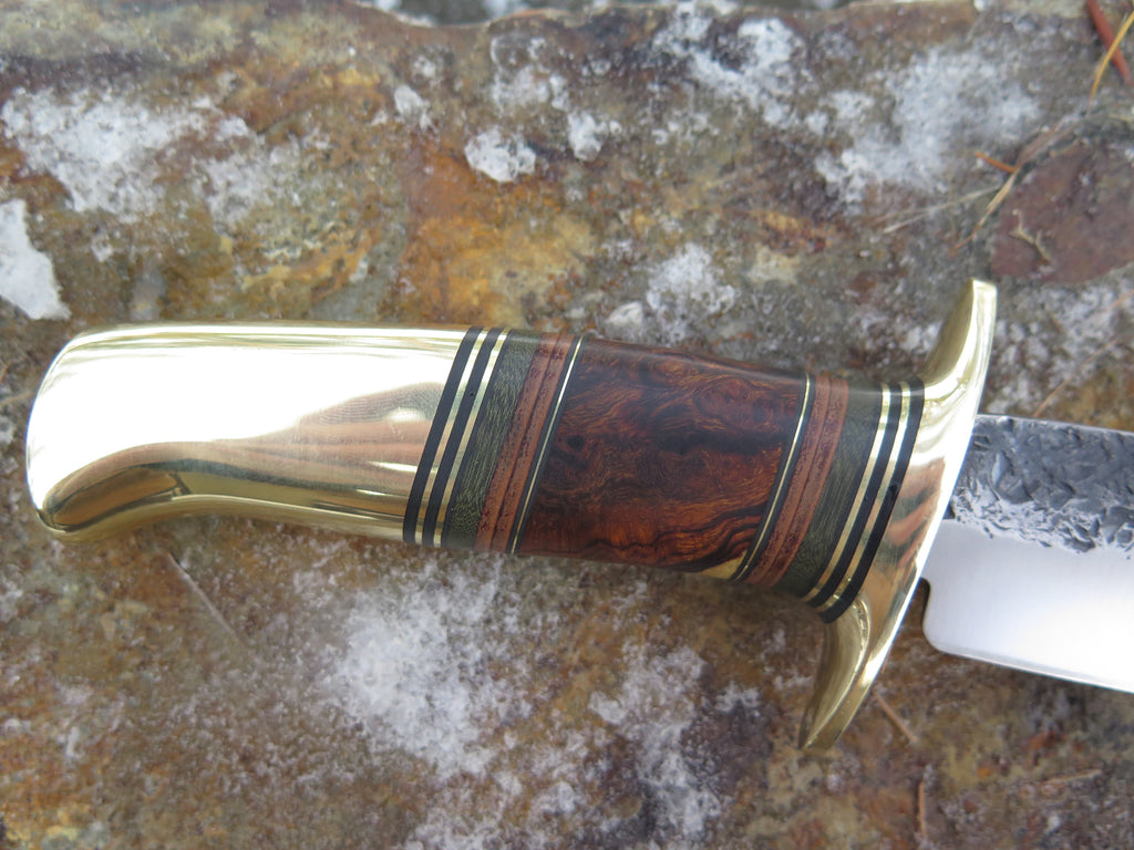 This incredible new Fighter from Behring Made© is hand forged from 3/16" thick high carbon 01 tool steel and it measures 6" from tip to guard with a razor sharp hollow grind and our hammermark finish. The tall brass guard is soldered in place above black fiber, brass horsehide, green micarta spacers and a gorgeous ironwood burl core that's butted with brass, which is also pinned through the tang with brass. The overall length measures 10 1/2" and it comes in a custom sheath from Warlander Leather.