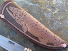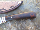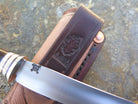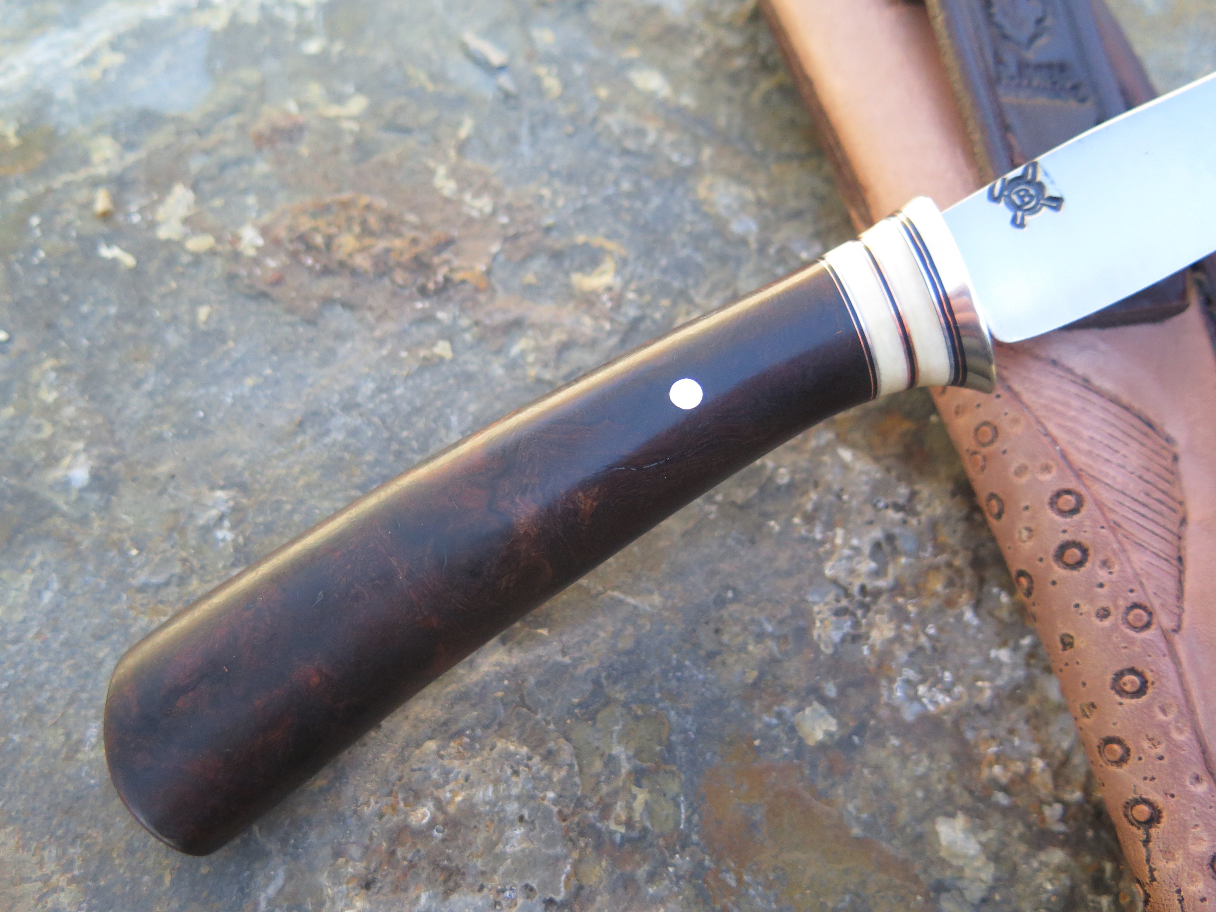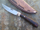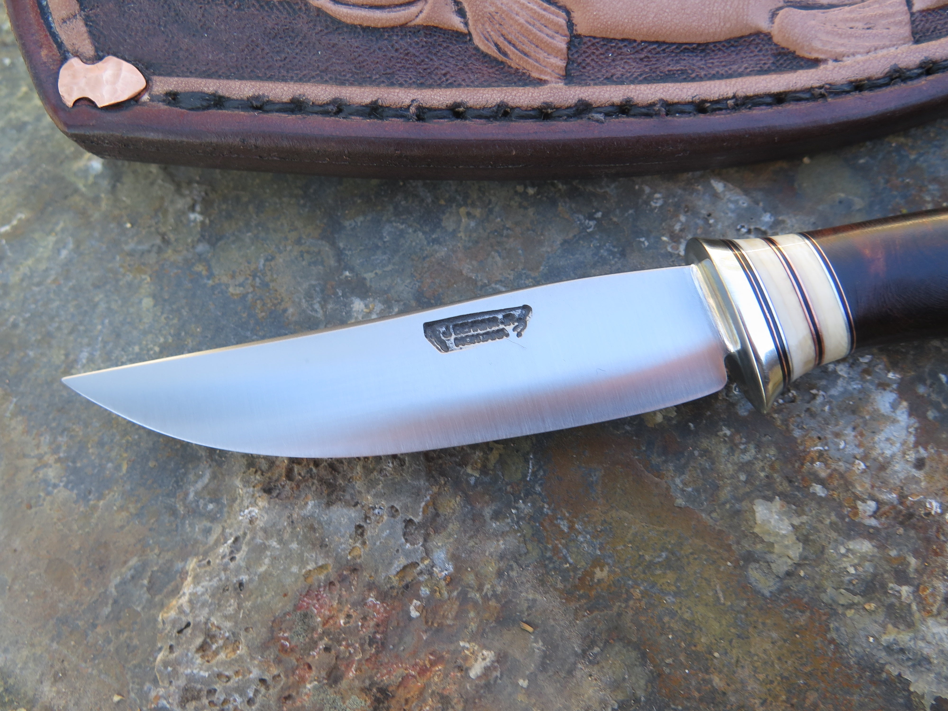 Just in time for the spring fishing season comes this incredible new Pintail from Behring Made©! It's hand forged from 1/8" thick high carbon 01 tool steel and measures 3 1/2" from tip to guard with a razor sharp convex grind. The nickel silver guard is soldered in place above black fiber, copper, aluminum and two beautiful mammoth ivory spacers which yield a remarkable contrast against the premium desert ironwood burl handle that's pinned through the tang with aluminum. We sent this one to Mudbone for one of his custom trout pouches and the combo is truly next level.