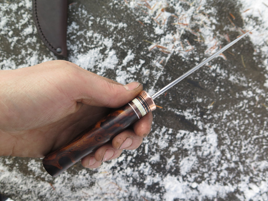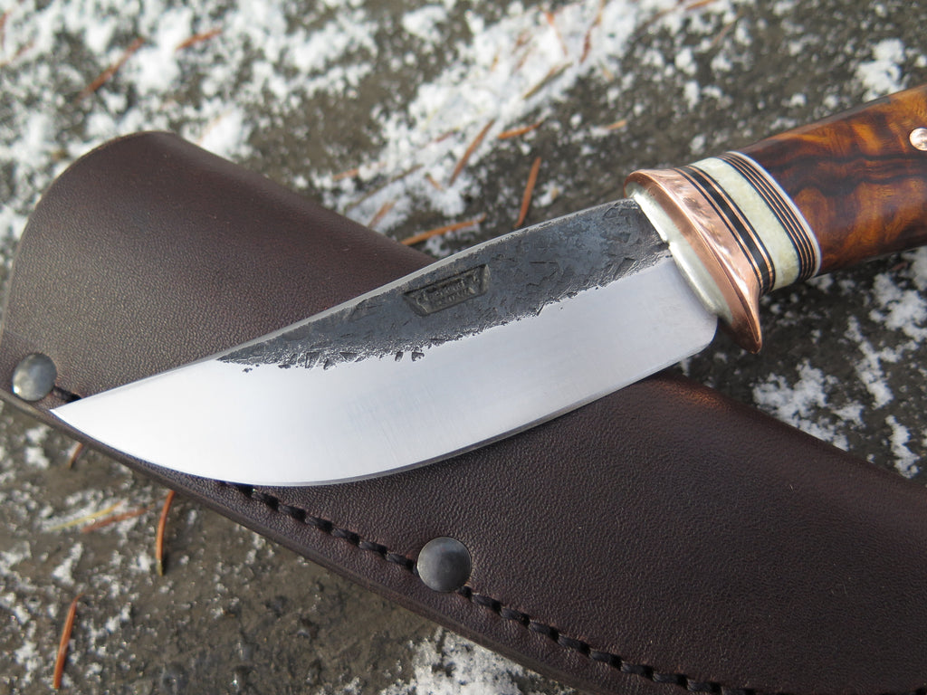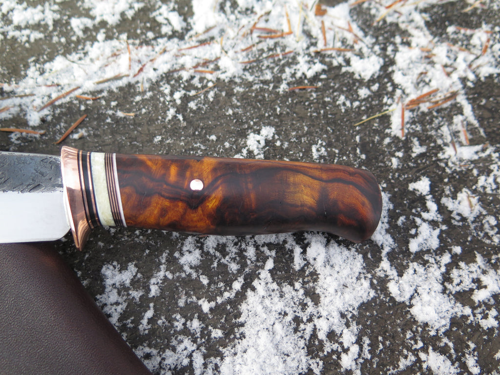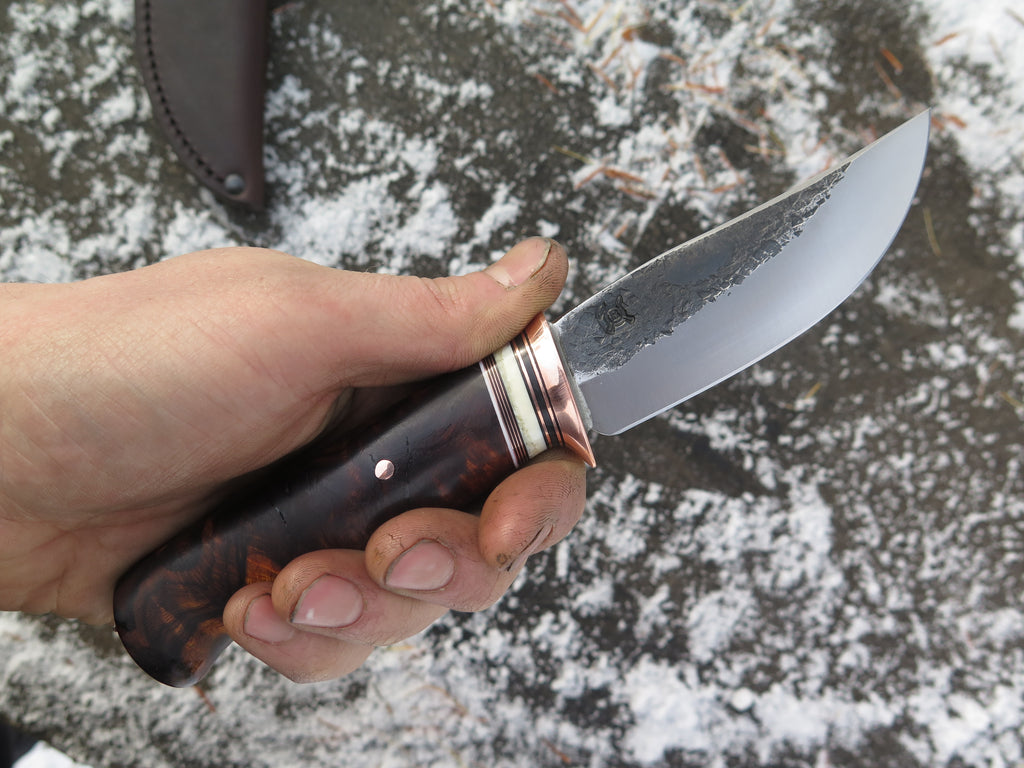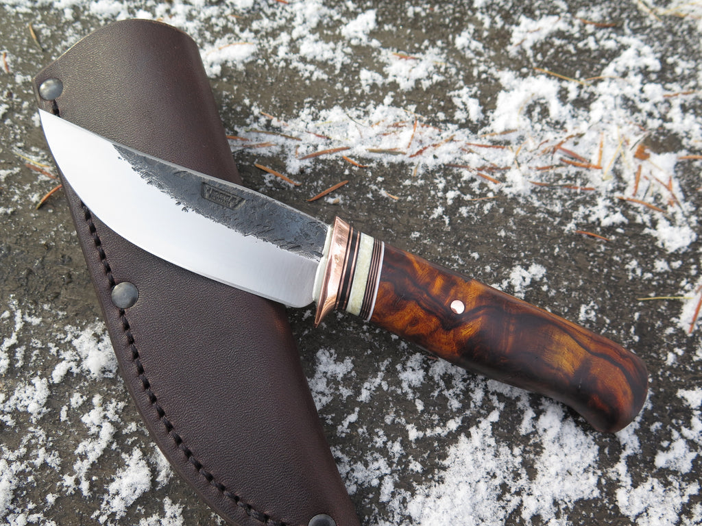 This Ironwood Hunter from Behring Made© is hand forged from 1/8" thick high carbon 01 tool steel and it measures 4" from tip to guard with razor sharp hollow grind and our hammermark finish. The copper guard is soldered in place above black and white fiber, copper, and beautiful fossil walrus ivory spacers in addition to an outstanding desert ironwood burl handle that's pinned through the tang with copper. The overall length measures 8" and it comes in a classic belt pouch sheath. Lead time is 6-8 weeks.