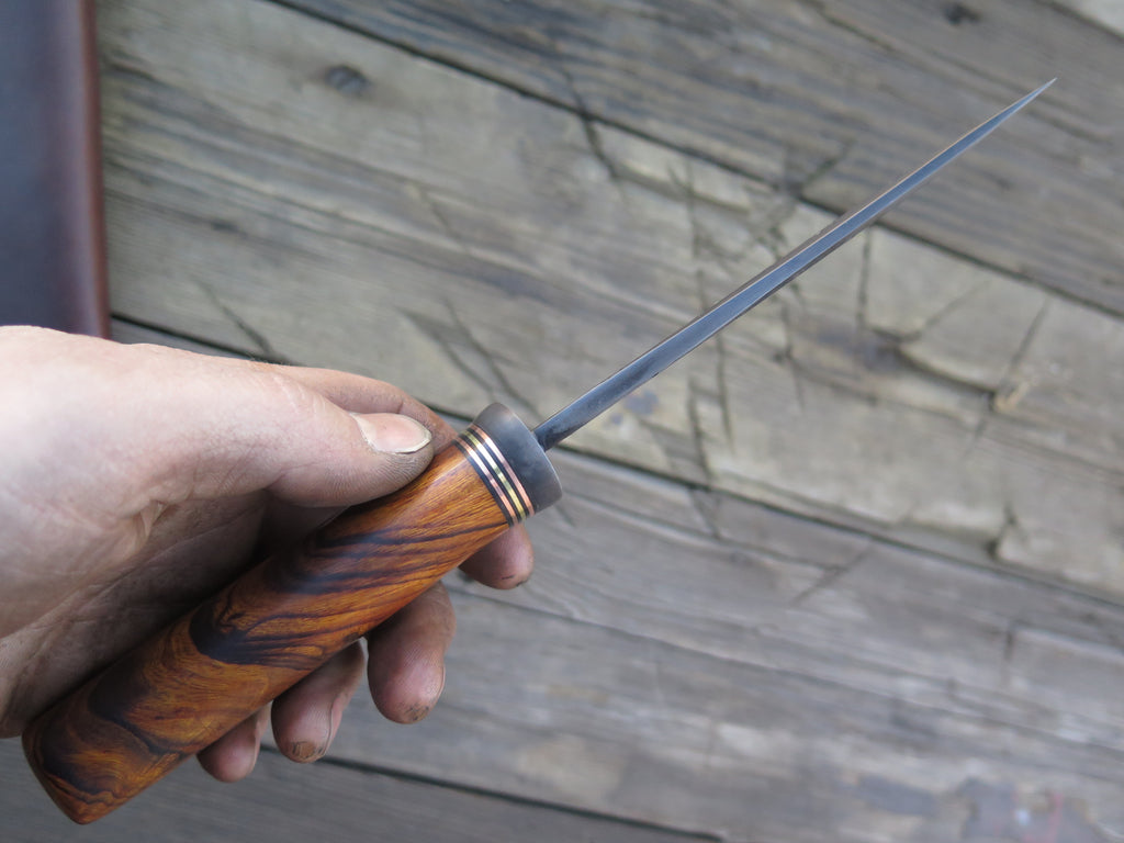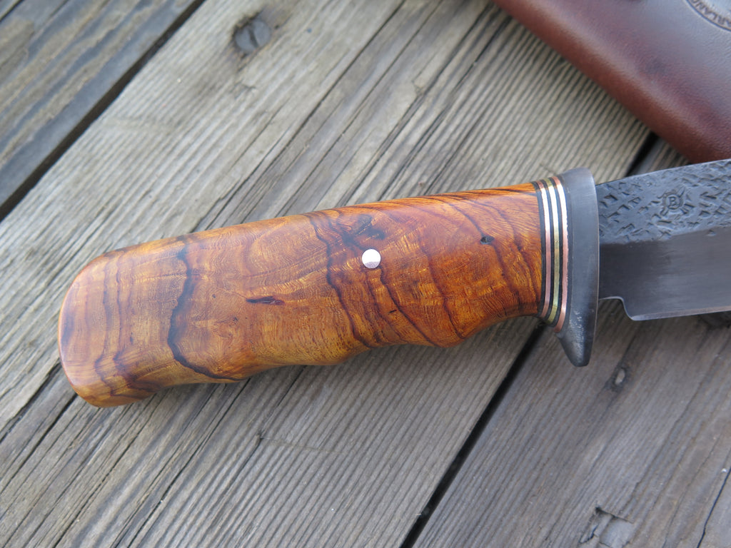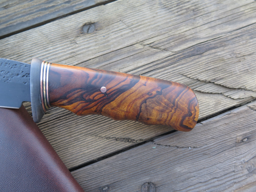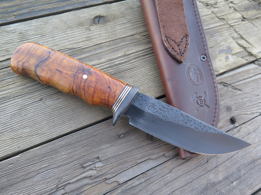 This beautiful new Hunter from Behring Made© is hand forged from 3/16" thick high carbon 01 tool steel and it measures 5" from tip to guard with a razor sharp hollow grind with our hammermark finish. The blued steel guard is soldered in place above black fiber, copper and brass spacers as well as a beautiful desert ironwood burl handle that's pinned through the tang with copper. The overall length measures 9 3/8" and it comes in the shown classic belt pouch sheath.