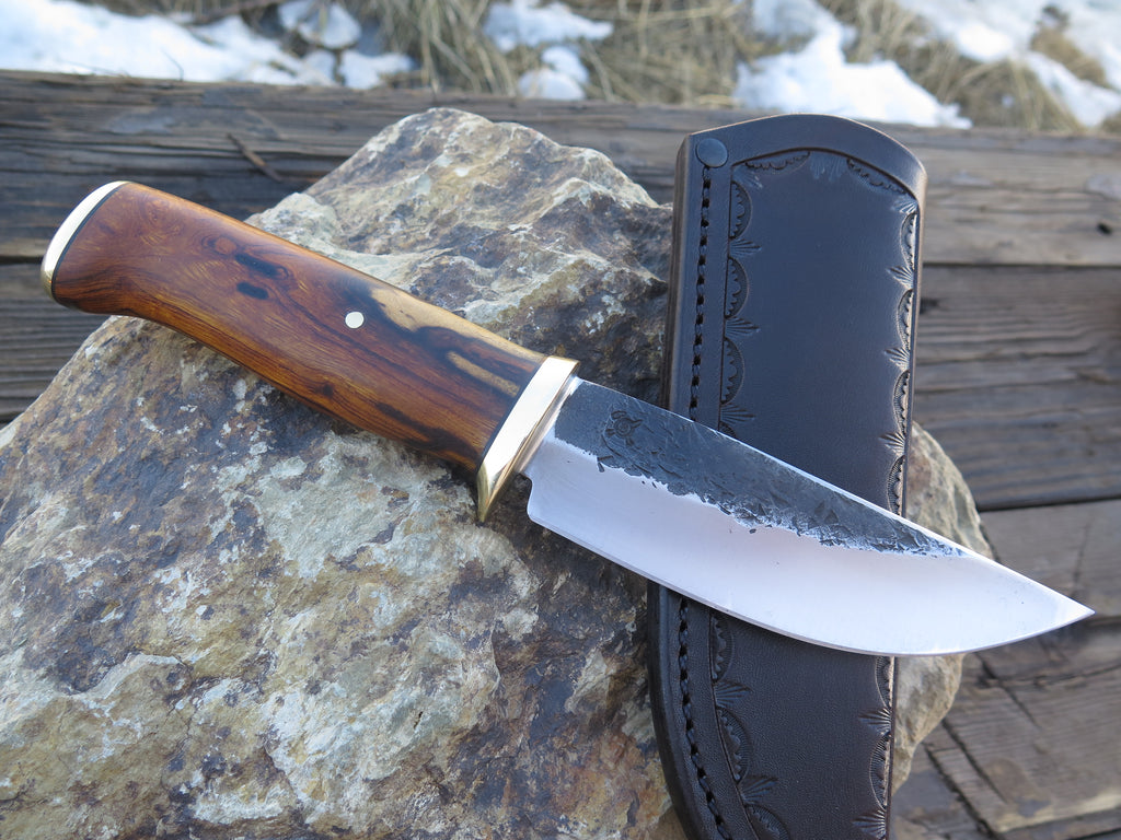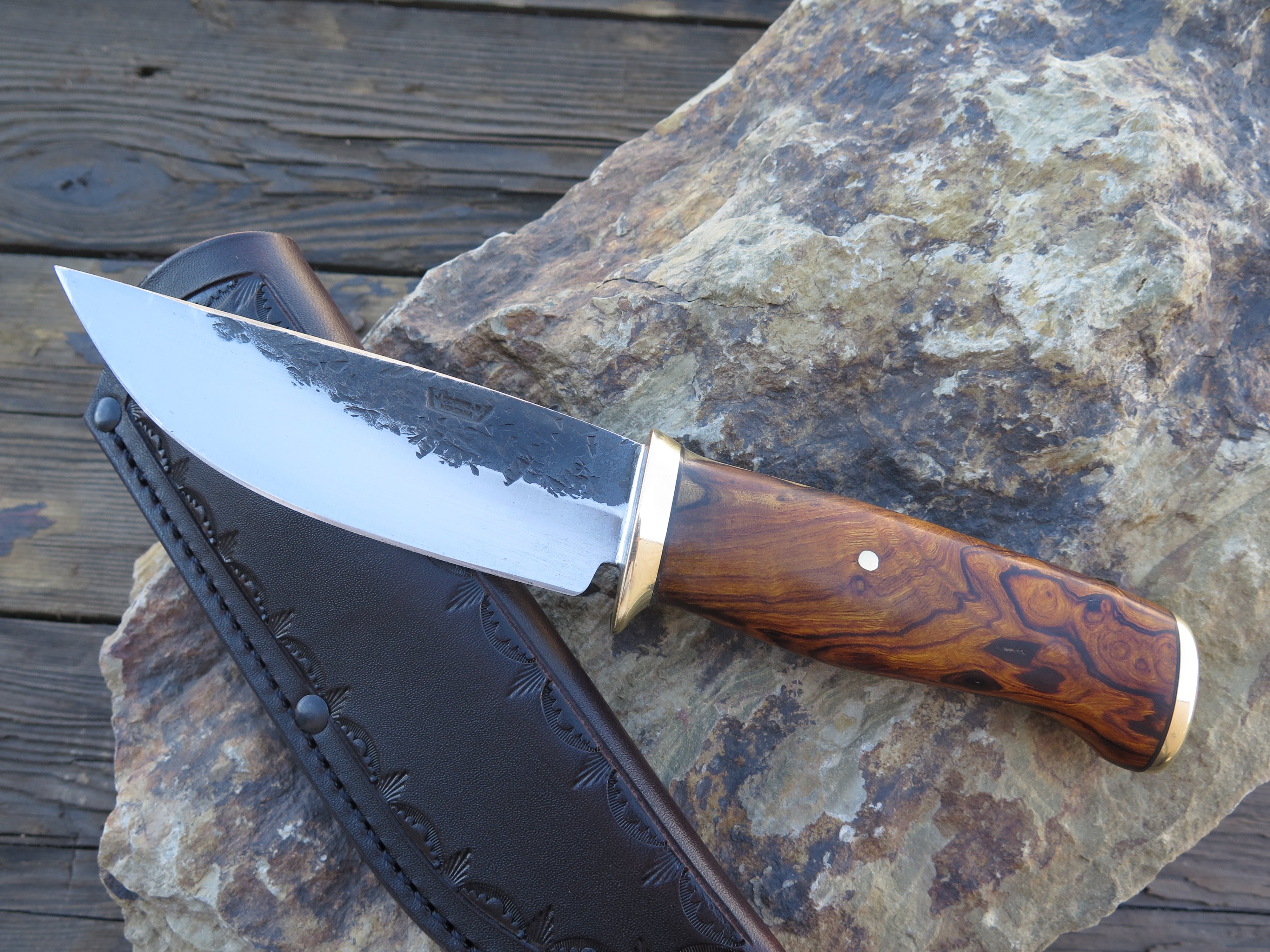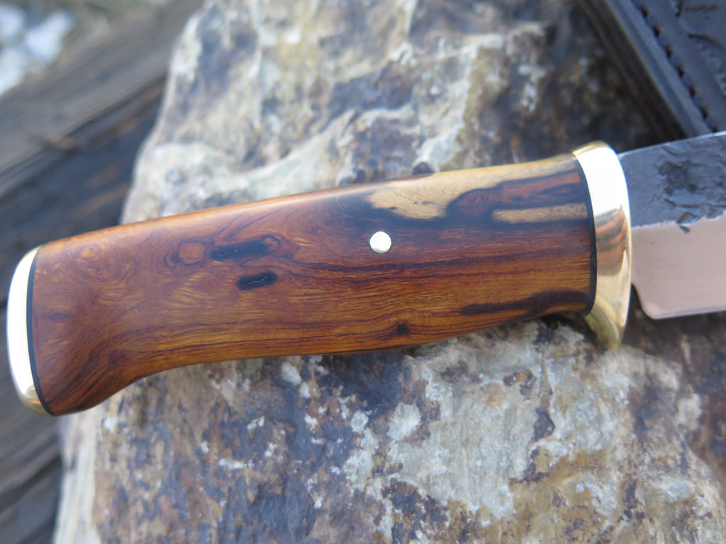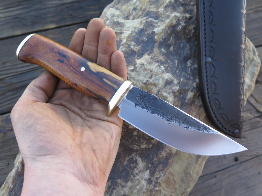 This incredible new Hunter from Behring Made© is hand forged from 3/16" thick high carbon 01 tool steel and it measures 5" from tip to guard with a razor sharp hollow grind and our hammermark finish. The brass guard is soldered in place above black fiber spacers and a truly outstanding piece of premium desert ironwood burl that's pinned through the tang and capped with brass as well. The overall length measures 9 1/2" and it comes in the border tooled pouch sheath from Warlander Leather.