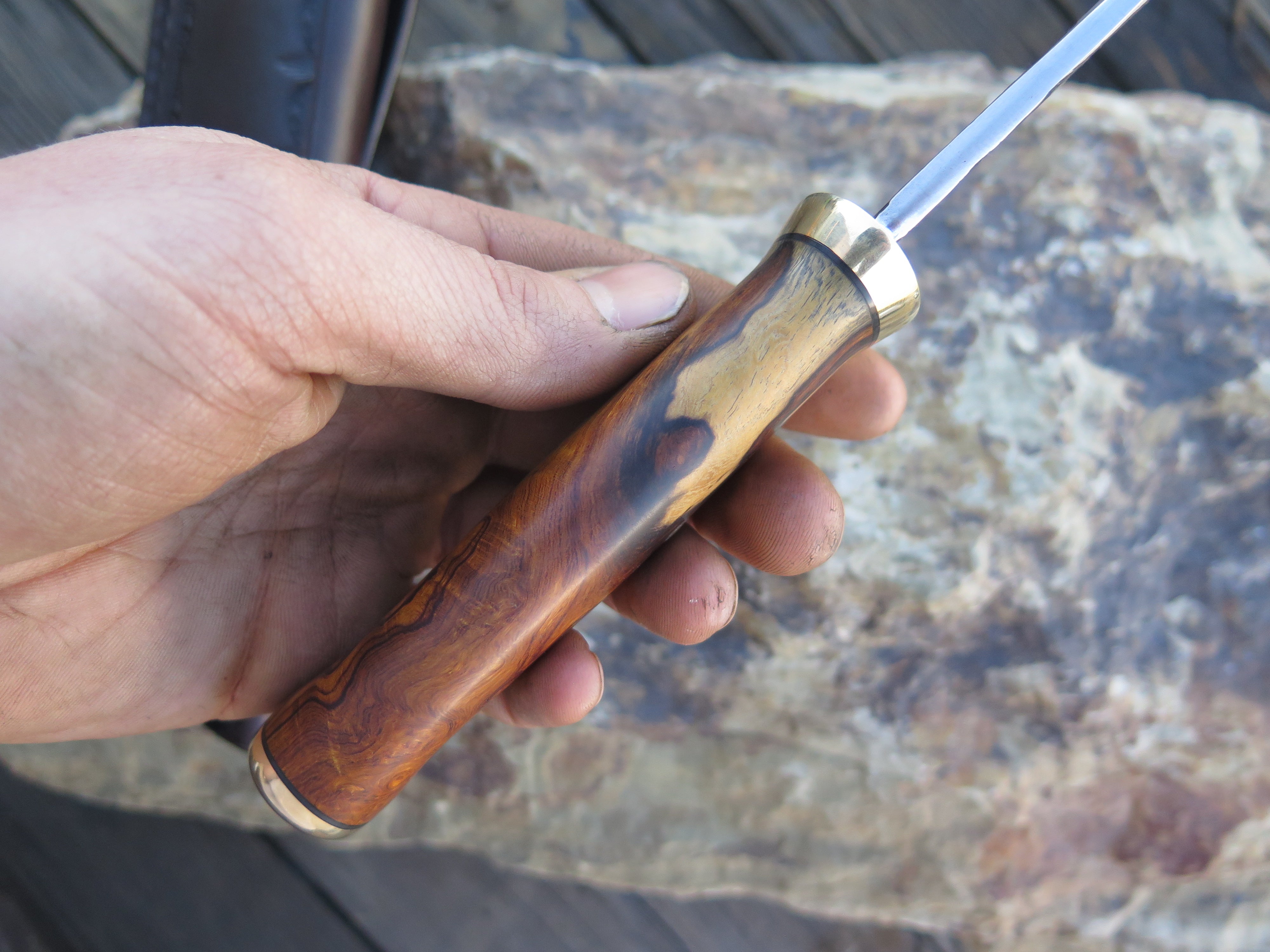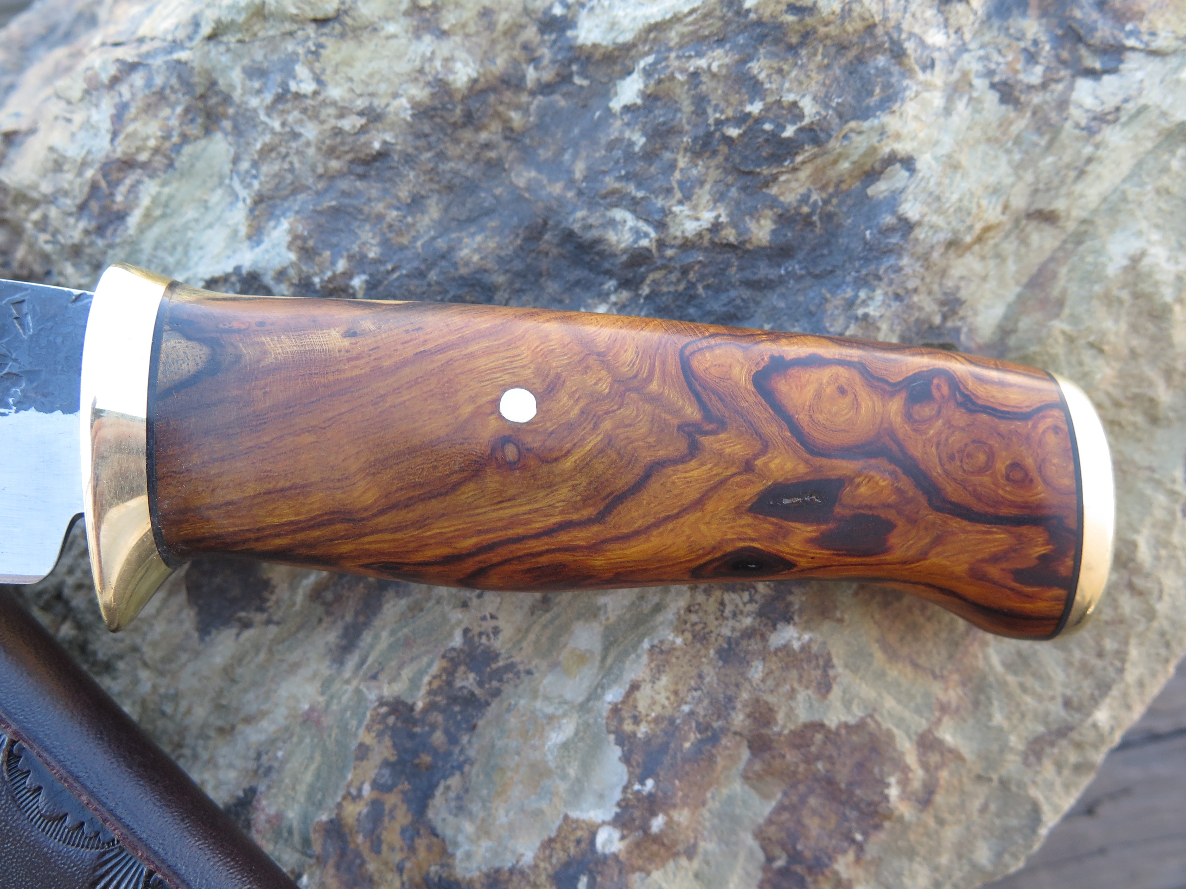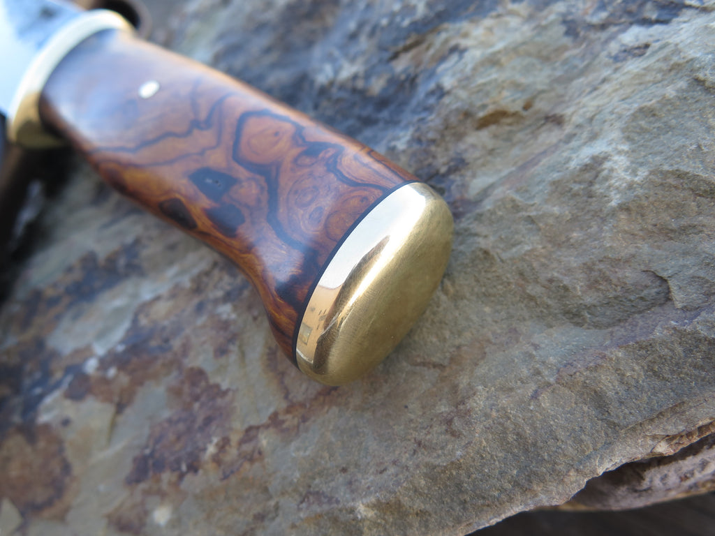 This incredible new Hunter from Behring Made© is hand forged from 3/16" thick high carbon 01 tool steel and it measures 5" from tip to guard with a razor sharp hollow grind and our hammermark finish. The brass guard is soldered in place above black fiber spacers and a truly outstanding piece of premium desert ironwood burl that's pinned through the tang and capped with brass as well. The overall length measures 9 1/2" and it comes in the border tooled pouch sheath from Warlander Leather.