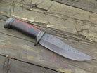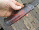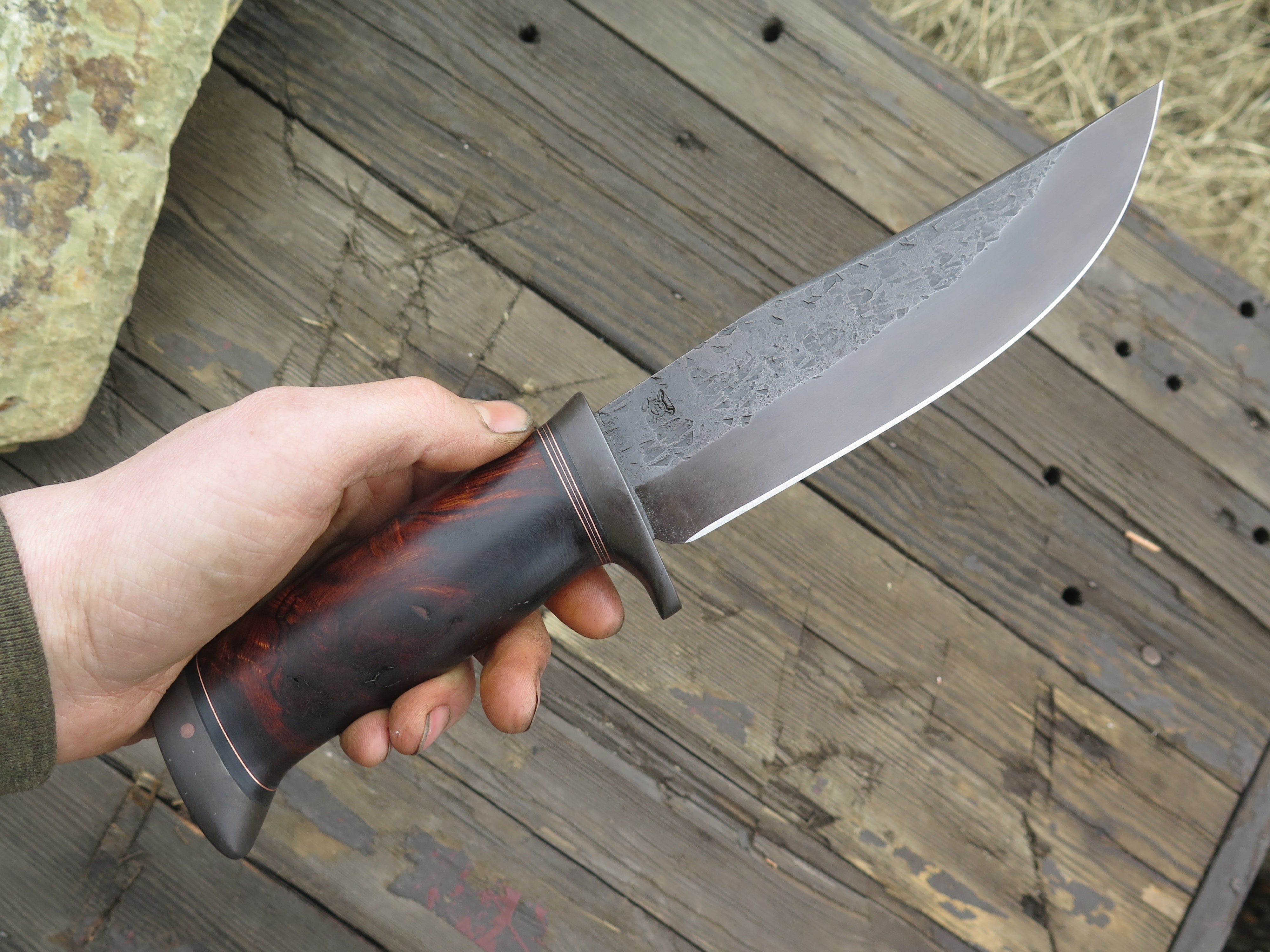 This incredible new Camp Knife from Behring Made© is one beast of a tool. The blade is hand forged from 1/4" thick 5160 spring steel and it measures 7" from tip to guard with a razor sharp hollow grind, hammermarks and our forced patina blued finish. The blued steel guard is soldered in place above black fiber and copper spacers, dual stacked around a beautiful desert ironwood handle that also features a blued steel butt cap that is pinned through the tang with copper. Overall length measures 12" and it comes in a custom sheath from Warlander Leather.