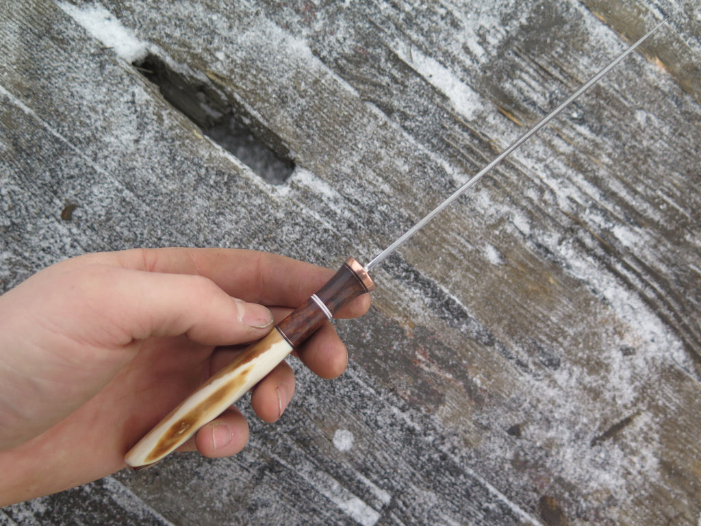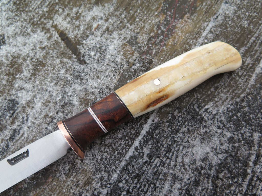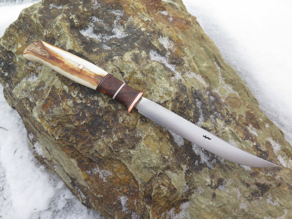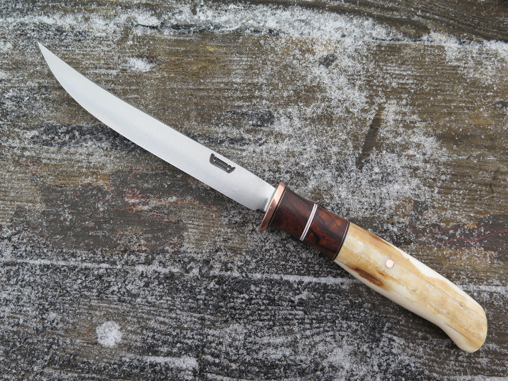 This beautiful new Blackfoot Fillet from Behring Made™ was named after one of Missoula's hidden gems, the Blackfoot River, which yields some of the prettiest (and tastiest) trout you can imagine. The blade is hand forged from 5160 spring steel and is convex ground with a nice flex, plus it measures 5 7/8" from tip to guard for those bigger hauls. The copper guard is silver soldered in place above black and white fiber, copper, and two high figure desert ironwood burl spacers that lend a nice contrast to the premium fossil walrus handle. The handle is pinned through the tang with copper and the overall length measures 10 3/8". Lastly, this one will come in a custom pouch sheath from Warlander Leather and we guarantee the set up for life.