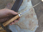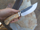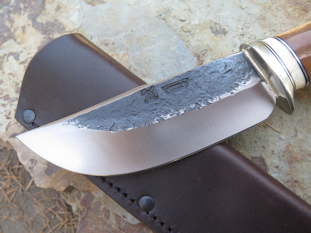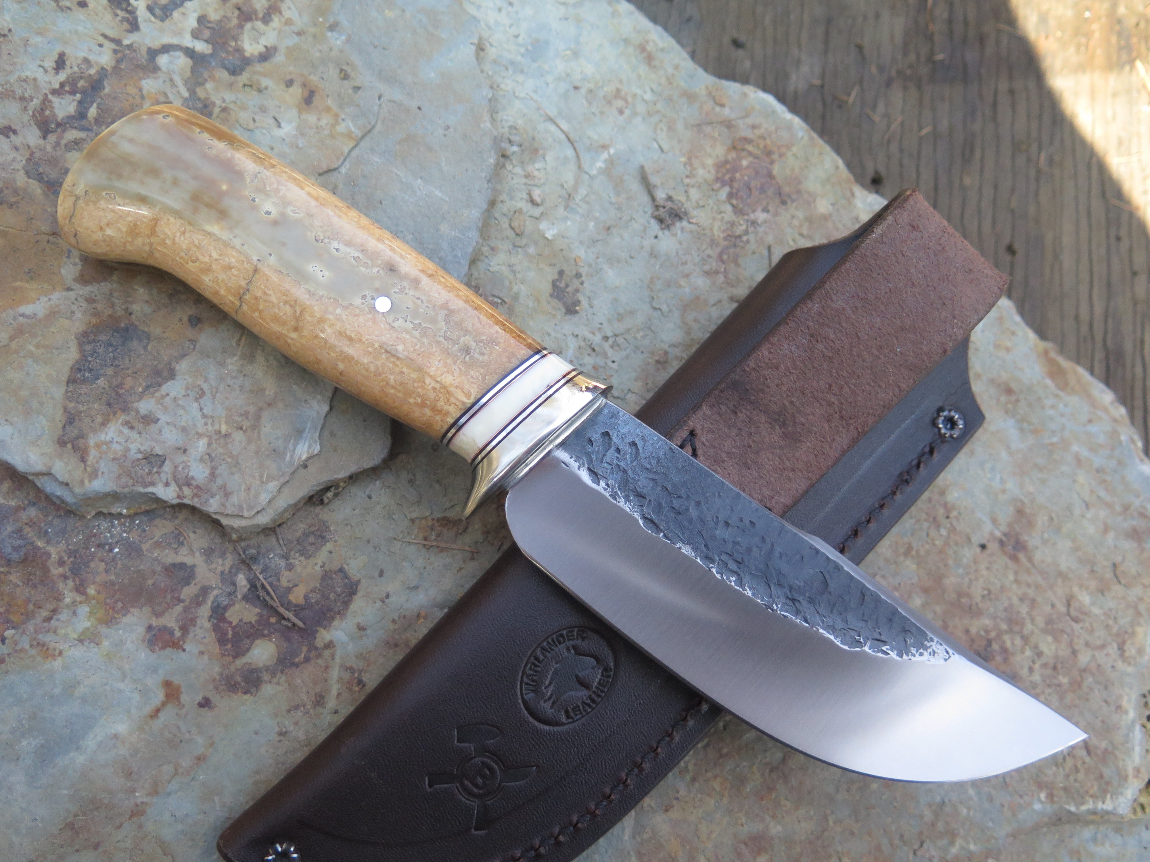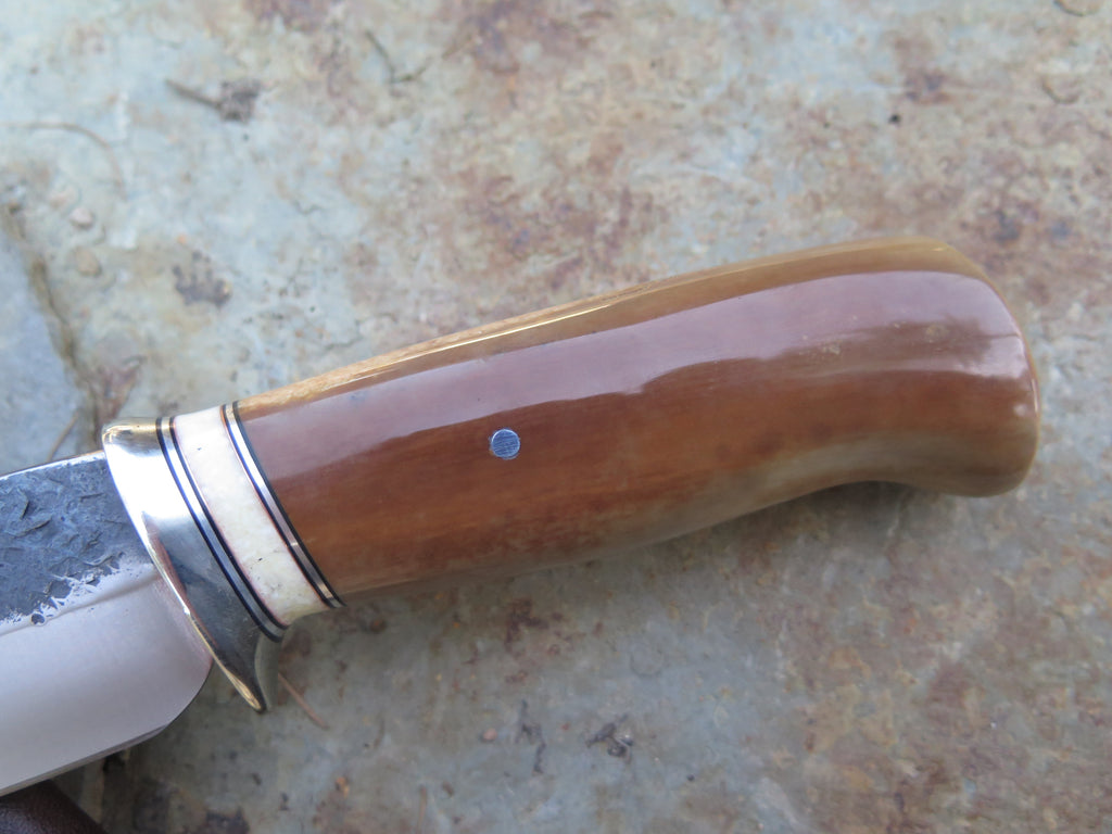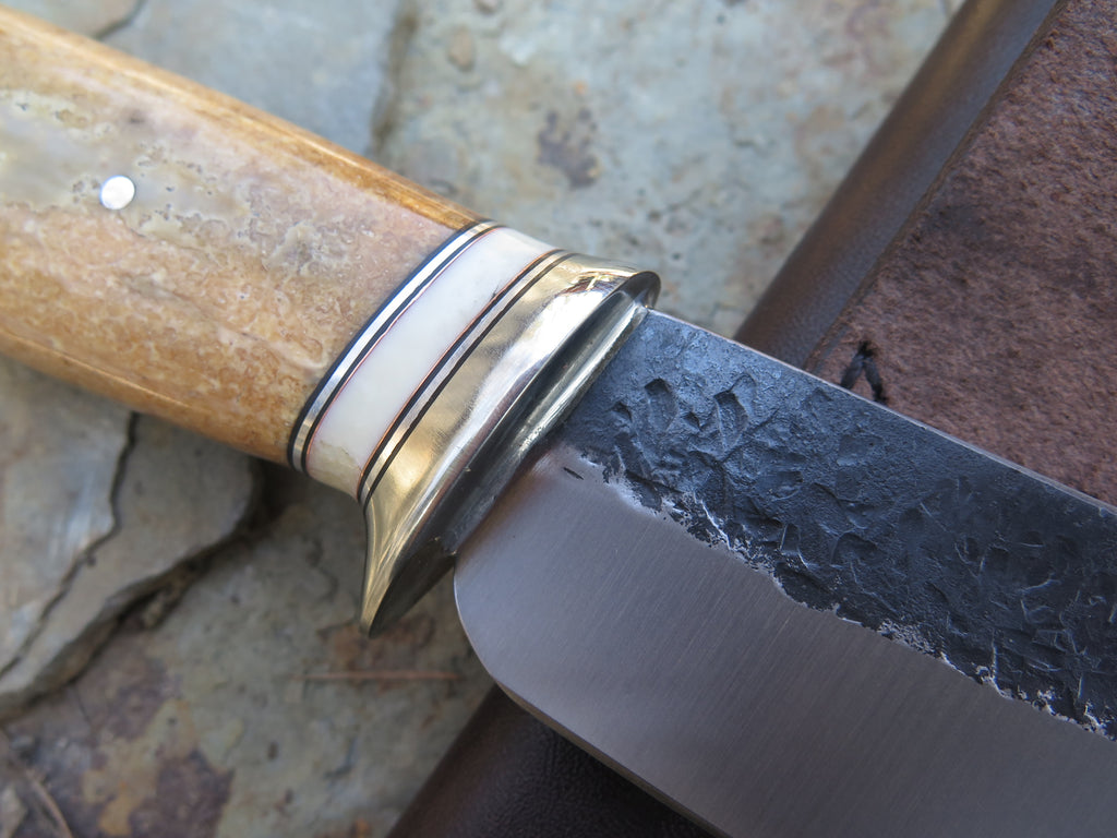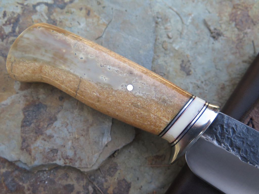 This incredible new Woodcraft from Behring Made© is hand forged from 3/16" thick high carbon 01 tool steel and it measures 5" from tip to guard with a razor sharp hollow grind and our hammermark finish. The nickel silver guard is soldered in place above black fiber, copper, aluminum and fossil walrus ivory spacers as well as a premium fossil walrus ivory handle with a gorgeous range of whiskey tones. The handle is pinned through the tang with aluminum and overall it measures 9 3/4" plus this one comes in a leather belt pouch sheath, ready for the field.