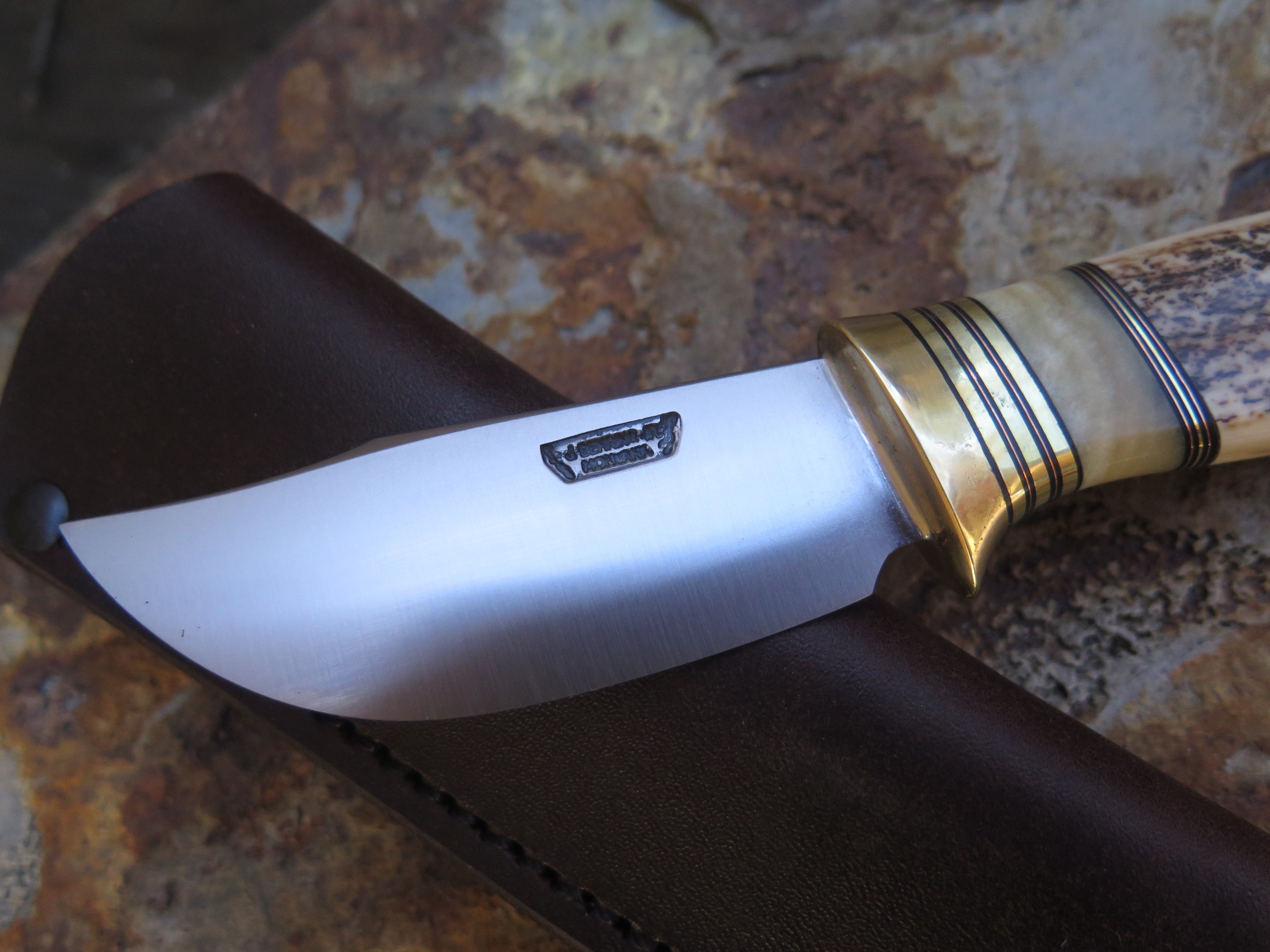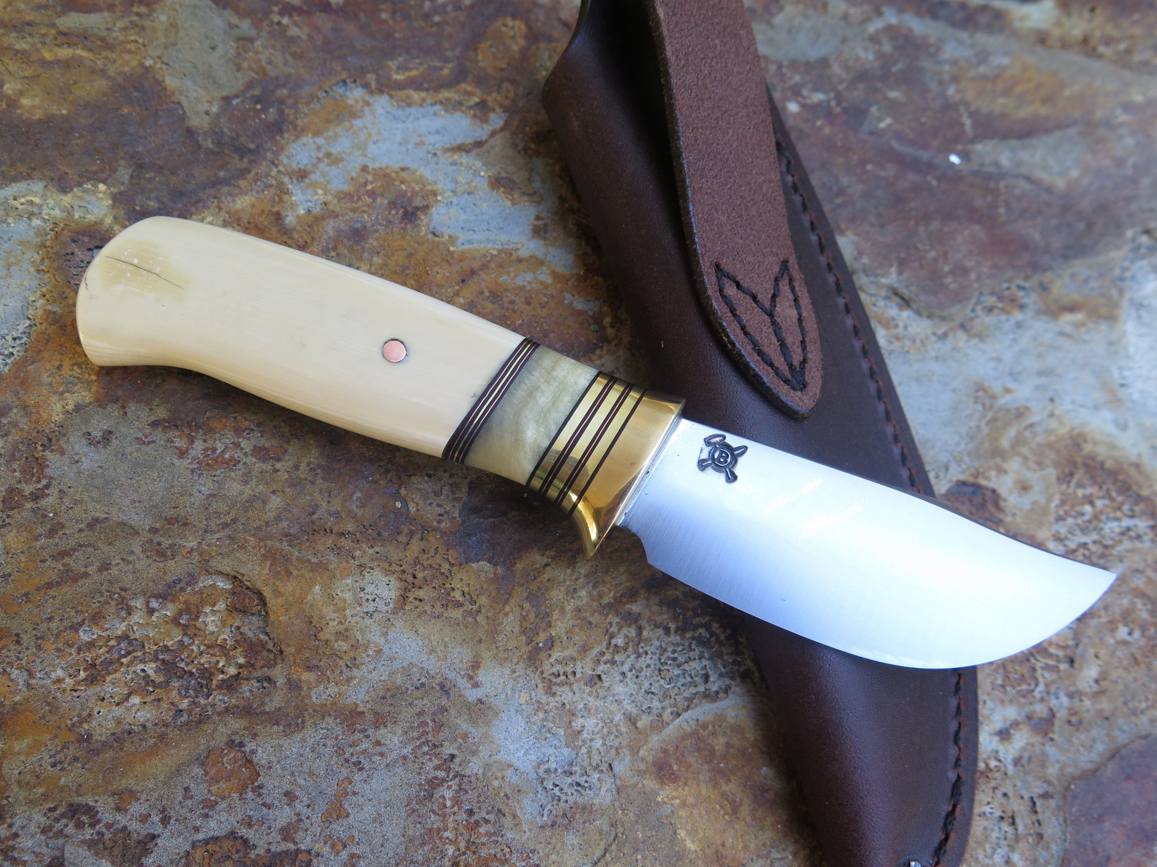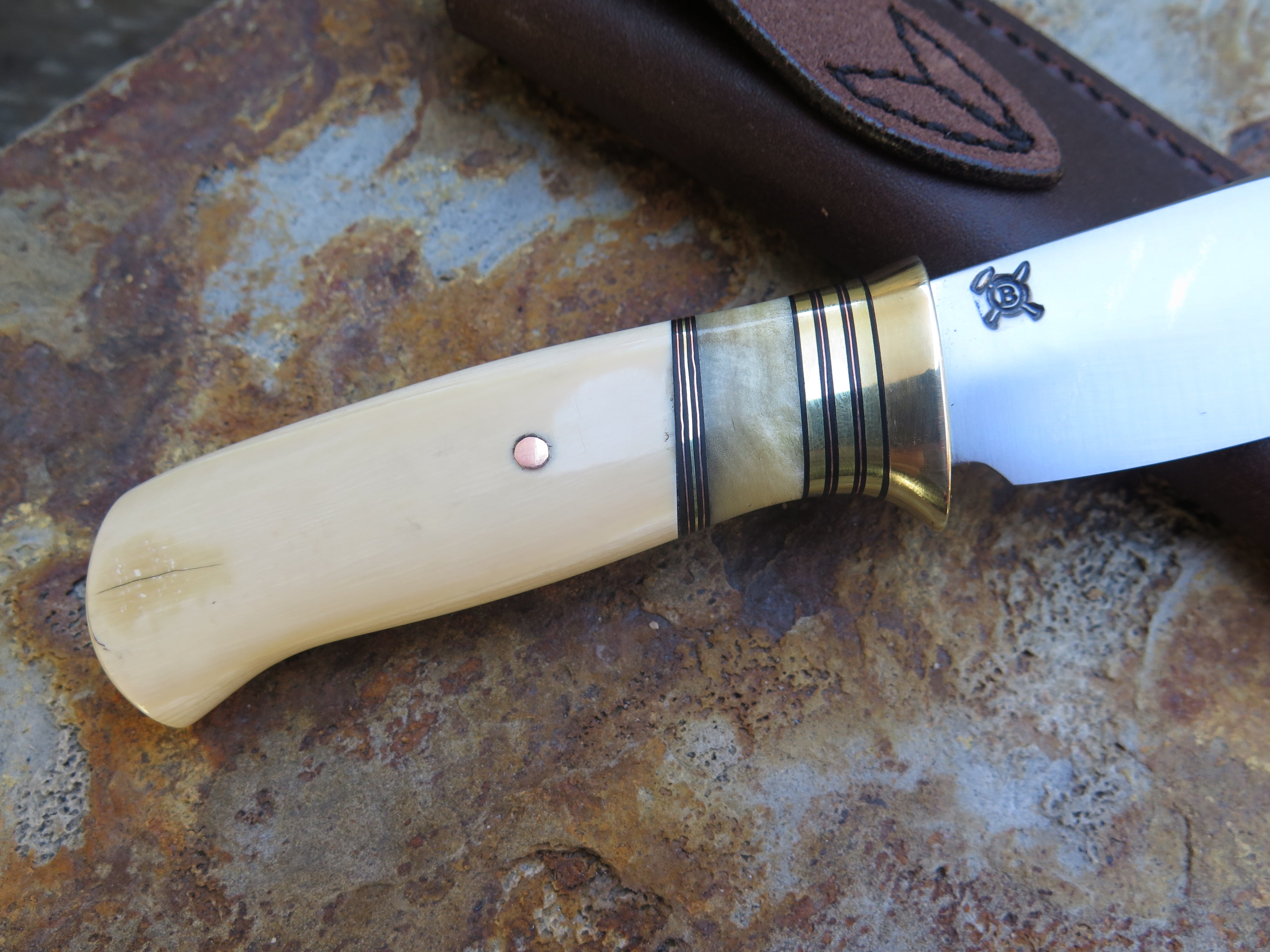 This new Hunter from Behring Made© is hand forged from 1/8" thick high carbon 01 tool steel and it measures 3 1/4" from tip to guard with a razor sharp convex grind. The brass guard is soldered in place above black fiber, brass, copper and sheep horn spacers which top a remarkable handle of ancient mammoth ivory that is pinned through the tang with copper. The overall length measures 6 7/8" and it comes in a classic leather belt pouch sheath.