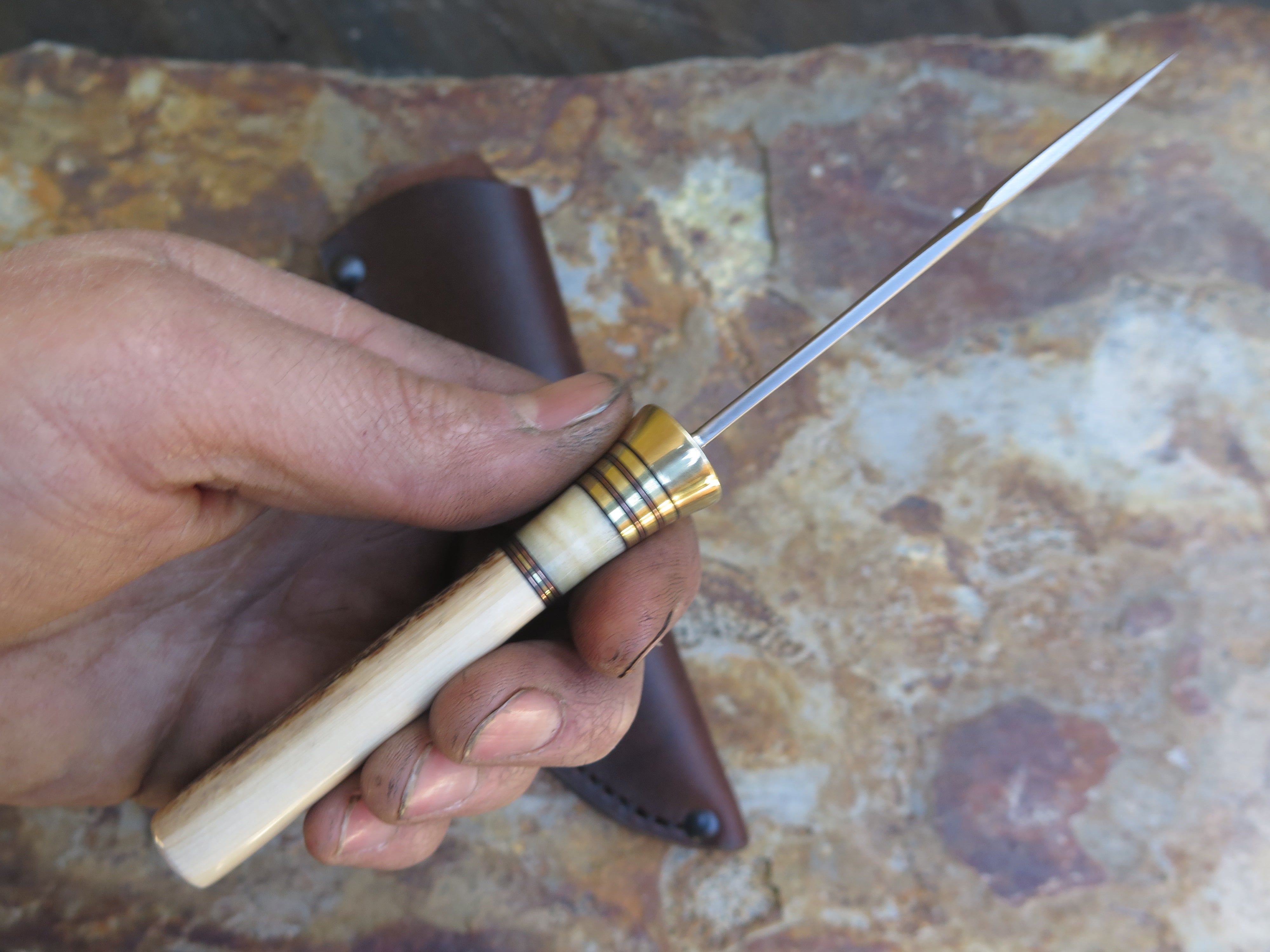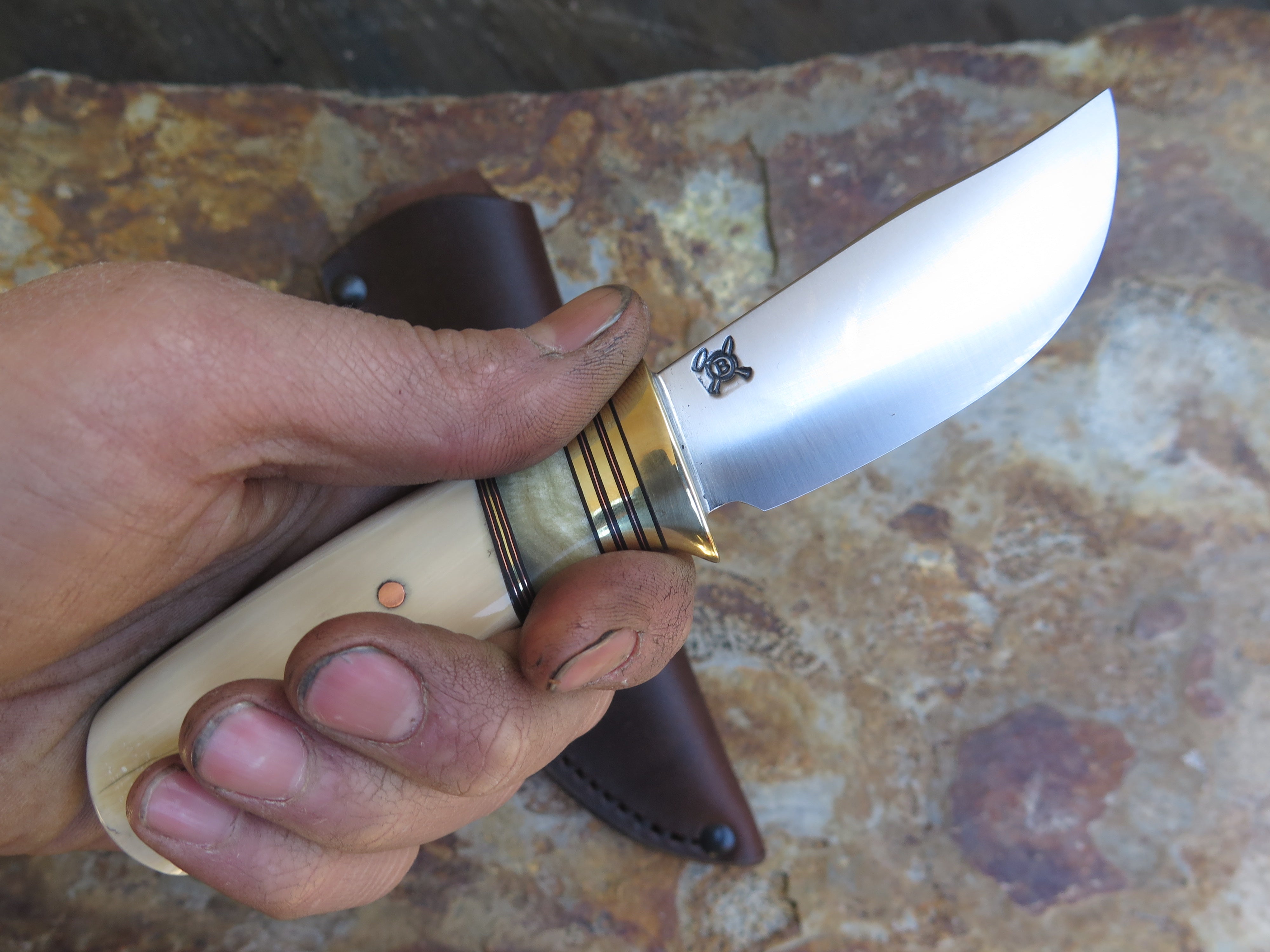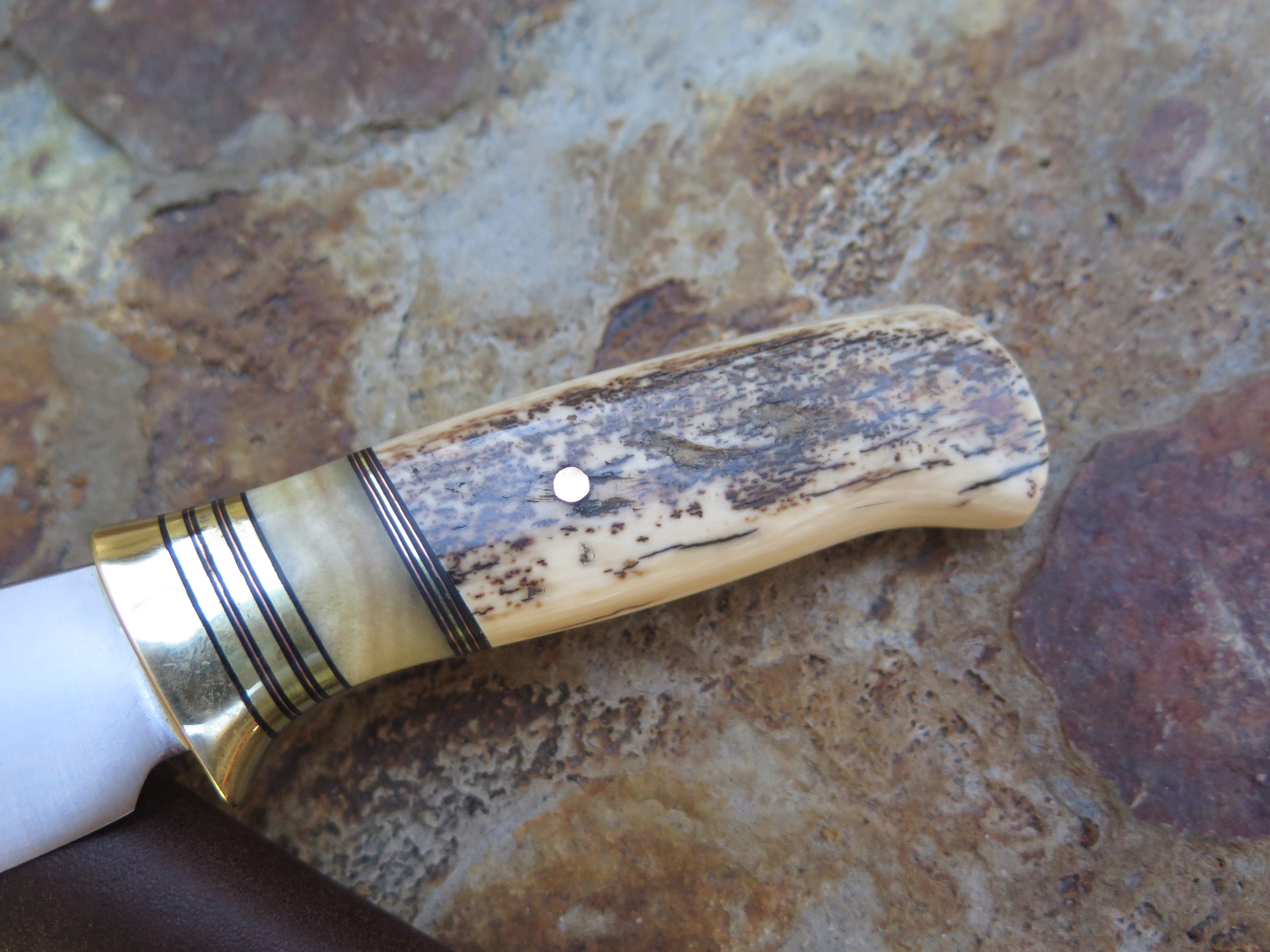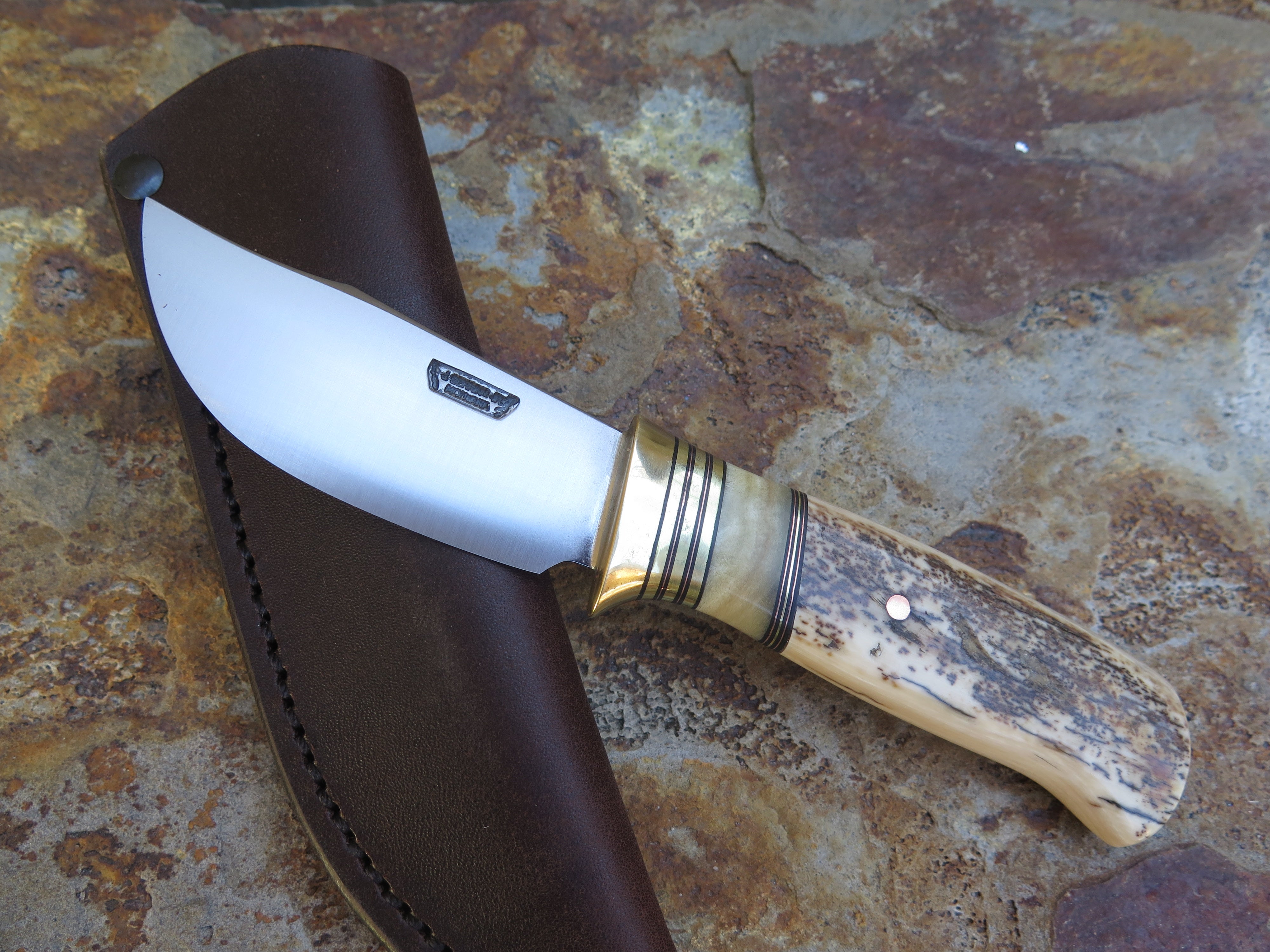 This new Hunter from Behring Made© is hand forged from 1/8" thick high carbon 01 tool steel and it measures 3 1/4" from tip to guard with a razor sharp convex grind. The brass guard is soldered in place above black fiber, brass, copper and sheep horn spacers which top a remarkable handle of ancient mammoth ivory that is pinned through the tang with copper. The overall length measures 6 7/8" and it comes in a classic leather belt pouch sheath.