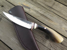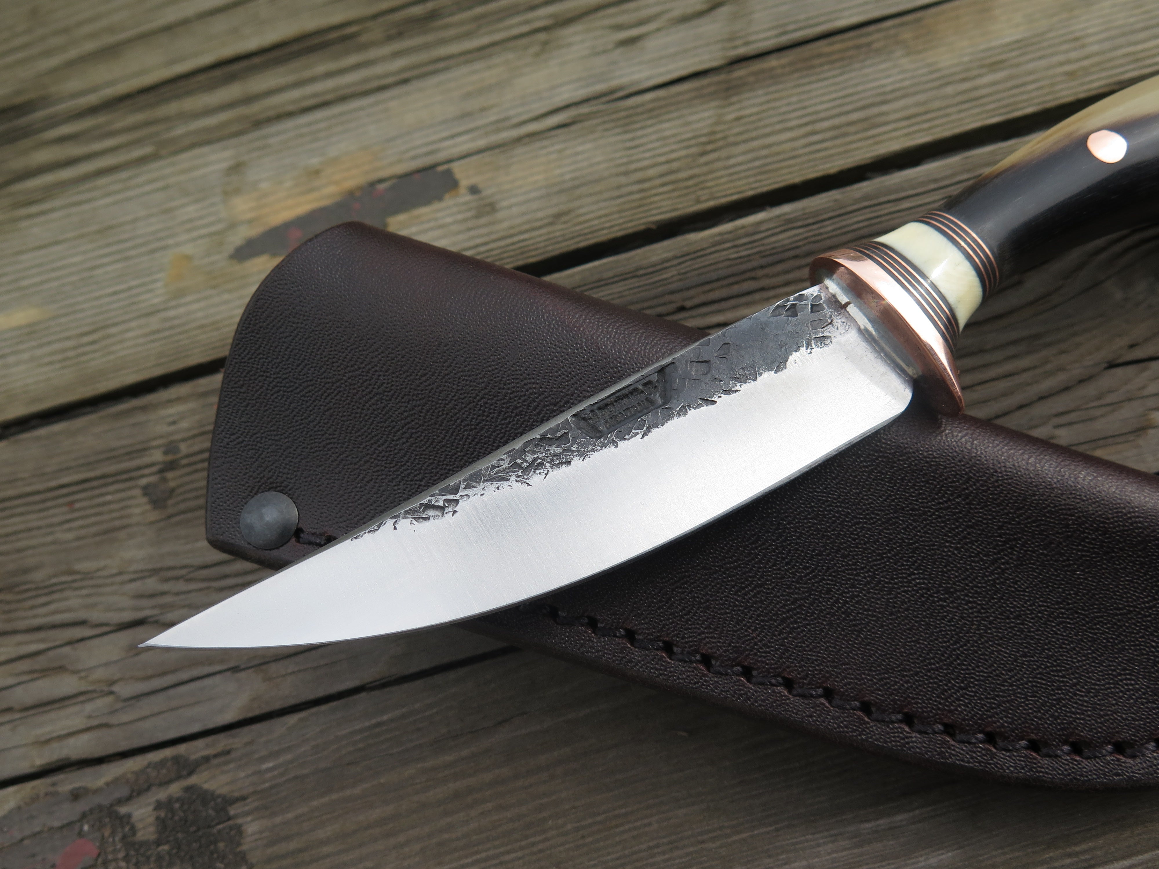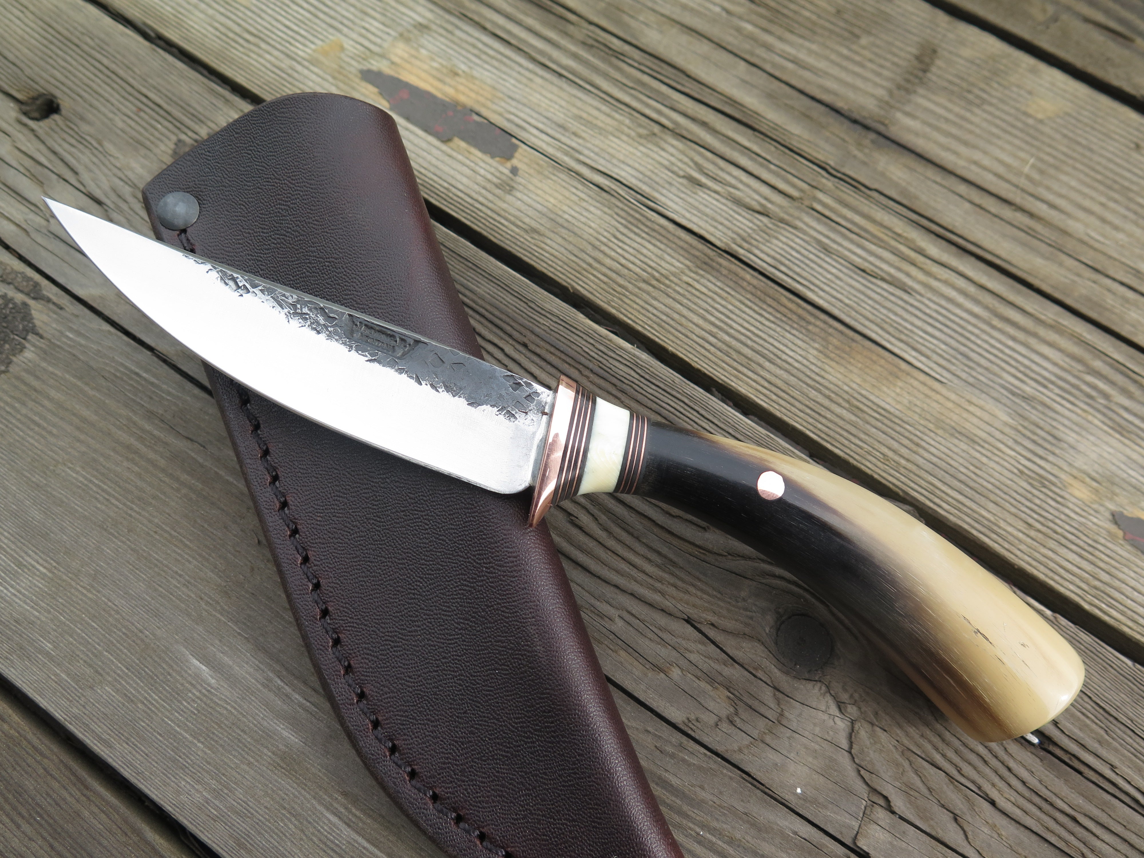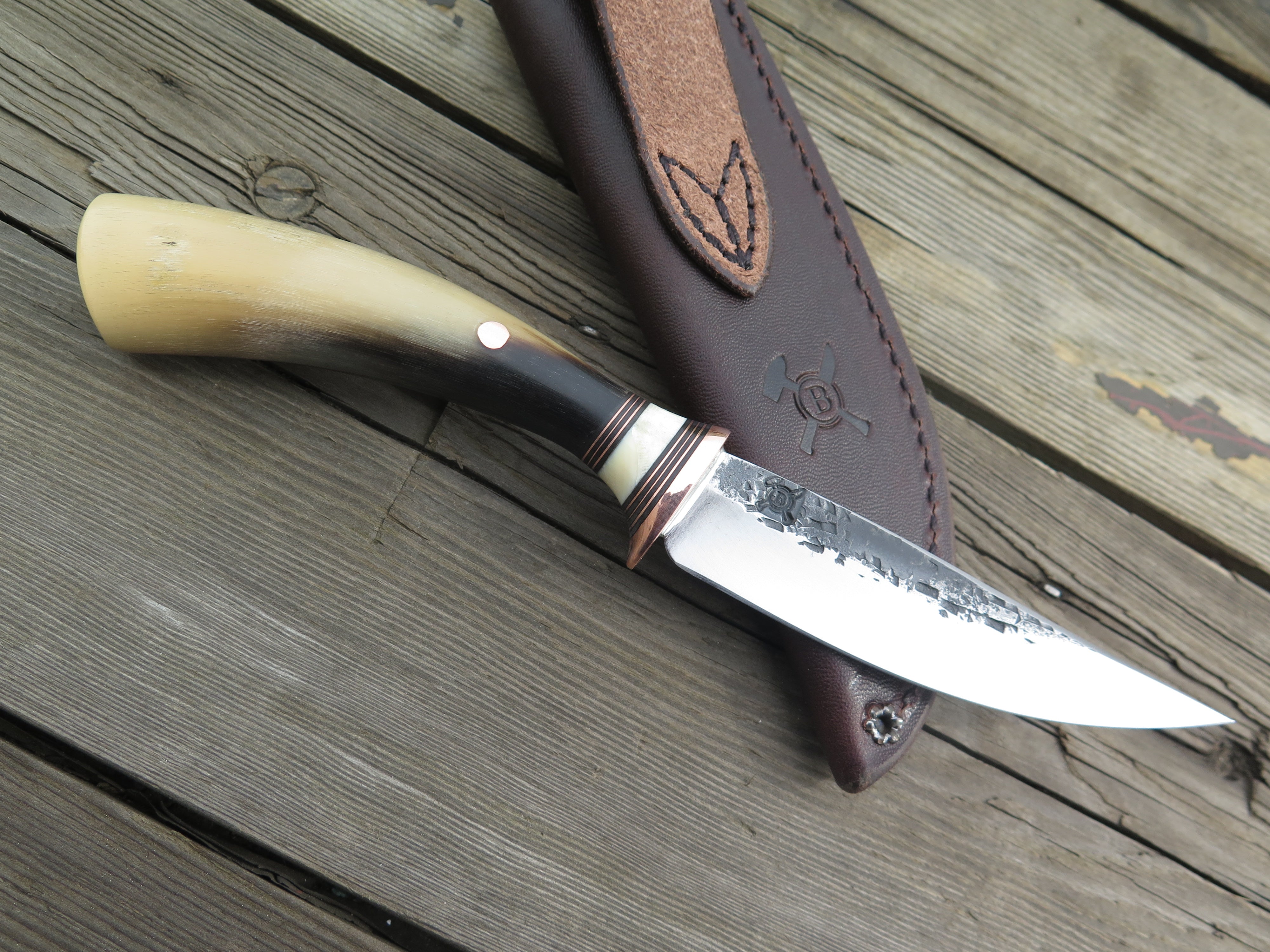 This beautiful new Pintail from Behring Made© is hand forged from 1/8" thick high carbon 01 tool steel and it measures just shy of 4 1/4" from tip to guard with a razor sharp hollow grind and a hammermark finish. The copper guard is soldered in place above black fiber, copper and fossil walrus ivory spacers. The musk ox carver handle is pinned through the tang with copper and the overall length measures out to 7 3/4". This one comes in a classic belt pouch sheath and is guaranteed field ready!