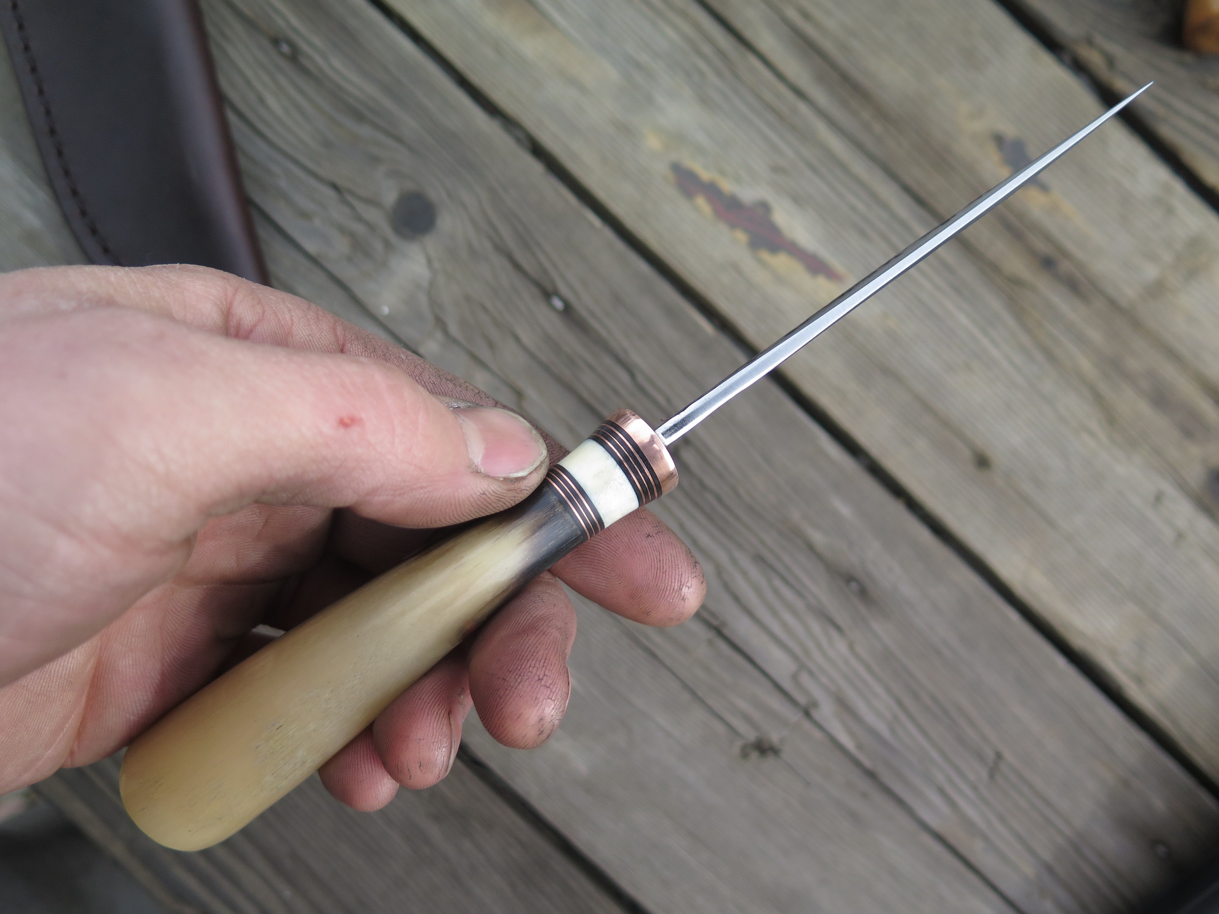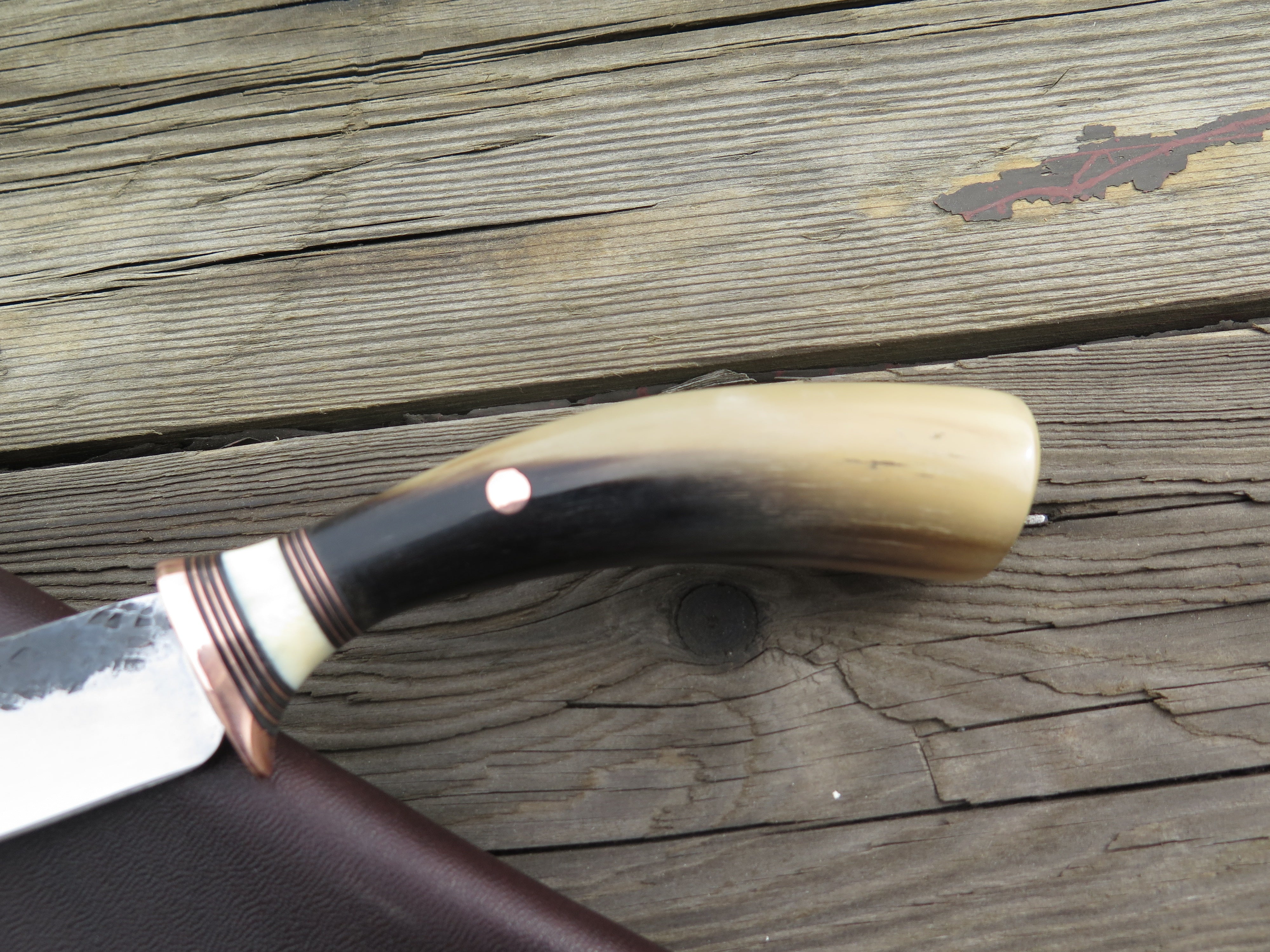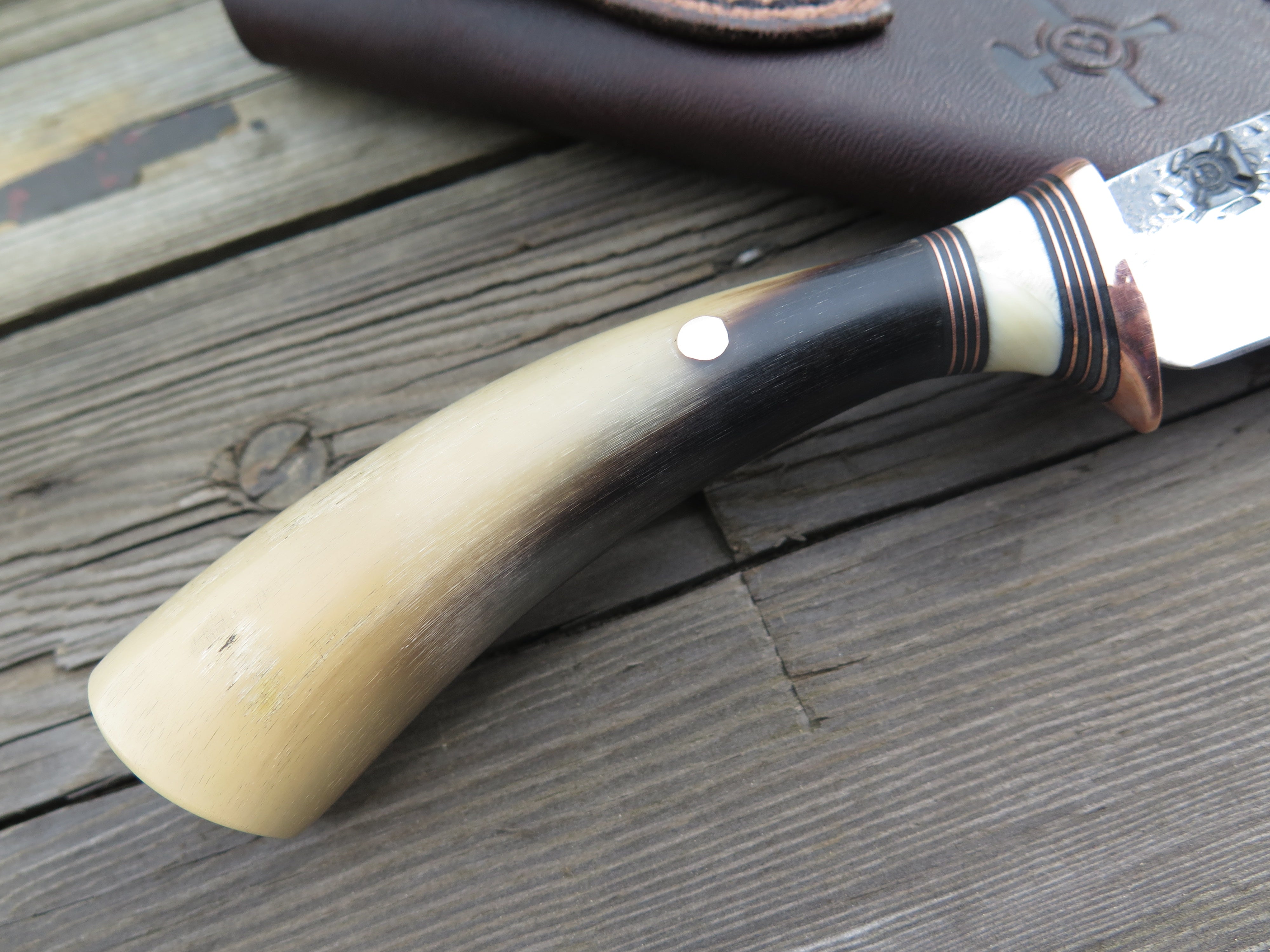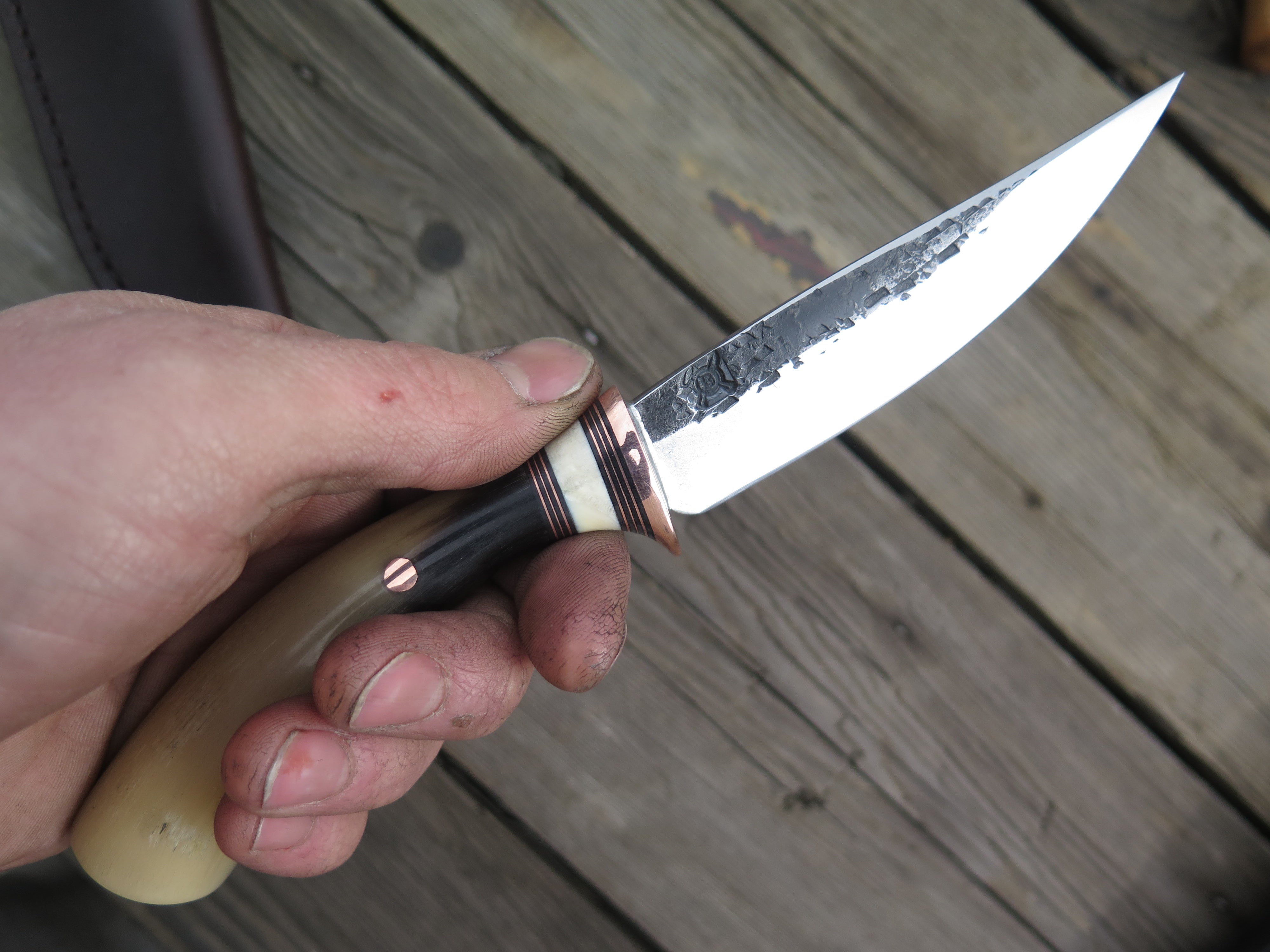 This beautiful new Pintail from Behring Made© is hand forged from 1/8" thick high carbon 01 tool steel and it measures just shy of 4 1/4" from tip to guard with a razor sharp hollow grind and a hammermark finish. The copper guard is soldered in place above black fiber, copper and fossil walrus ivory spacers. The musk ox carver handle is pinned through the tang with copper and the overall length measures out to 7 3/4". This one comes in a classic belt pouch sheath and is guaranteed field ready!