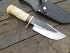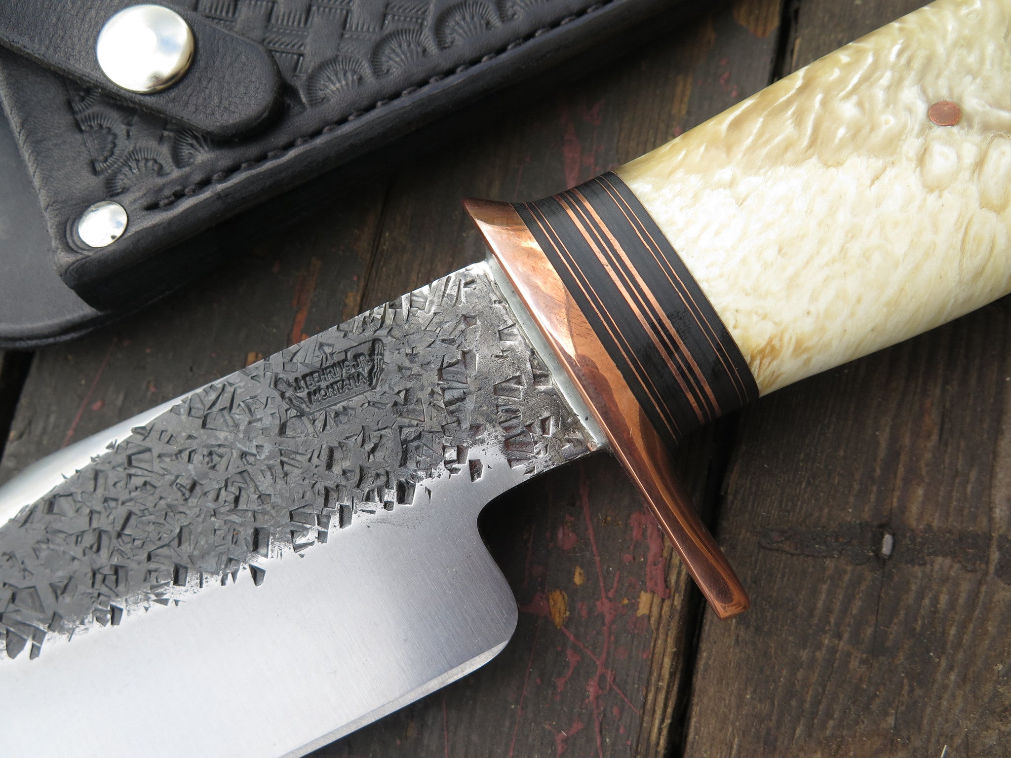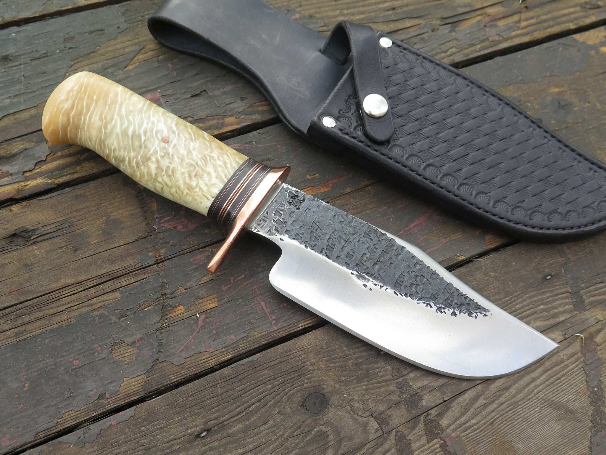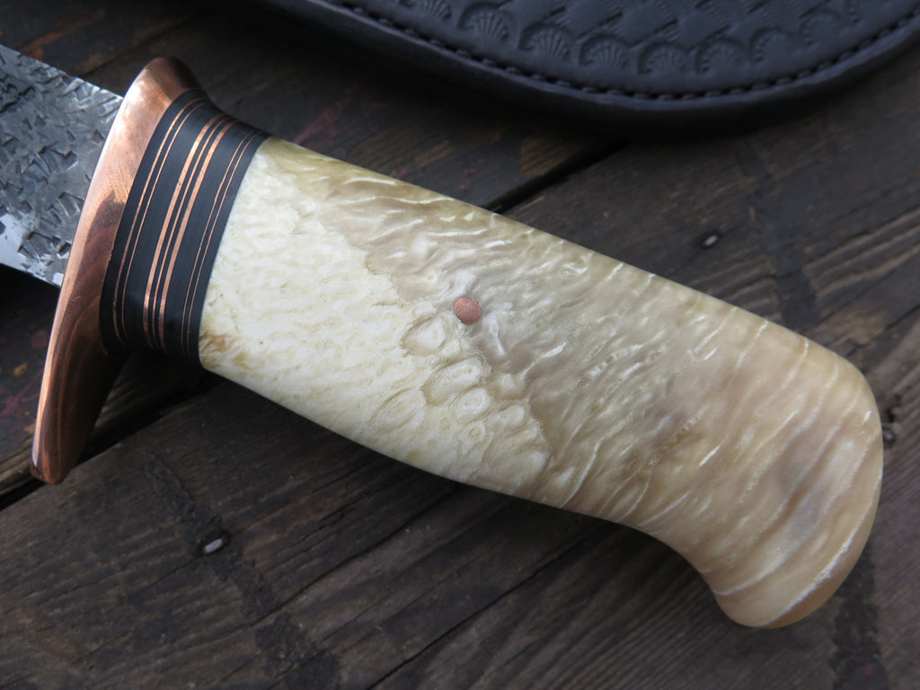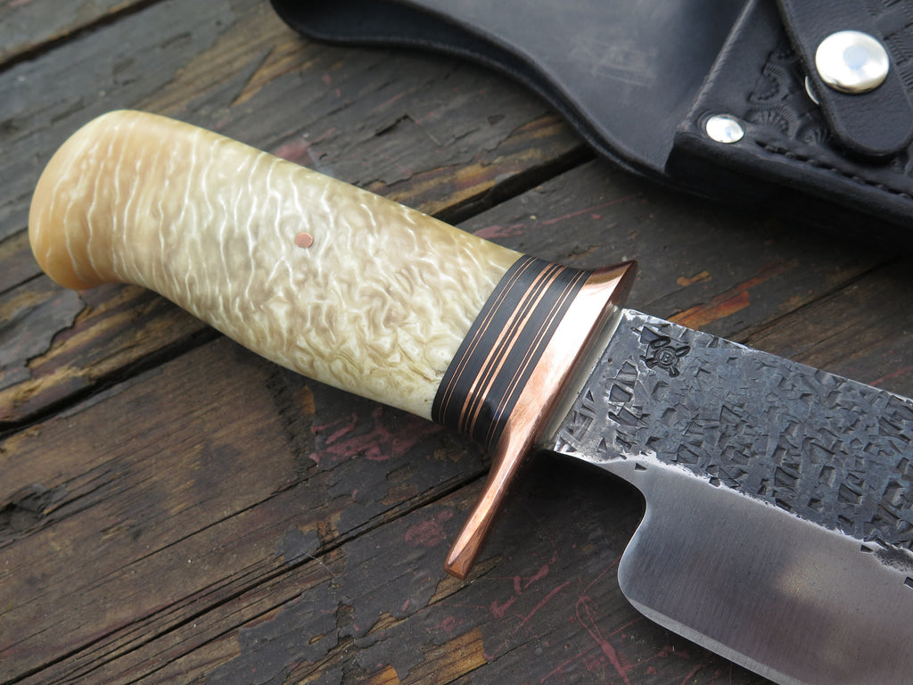 This incredible new Bushmaster from Behring Made is hand forged from 1/4" thick high carbon 01 tool steel and it measures 7" from tip to guard with a razor sharp hollow grind and a hammermark finish. The copper guard is soldered in place above black fiber and copper spacers as well as a premium musk ox boss handle that's pinned through the tang with copper. The overall length of this beast measures 12" and it comes in a custom sheath from Warlander Leather.