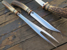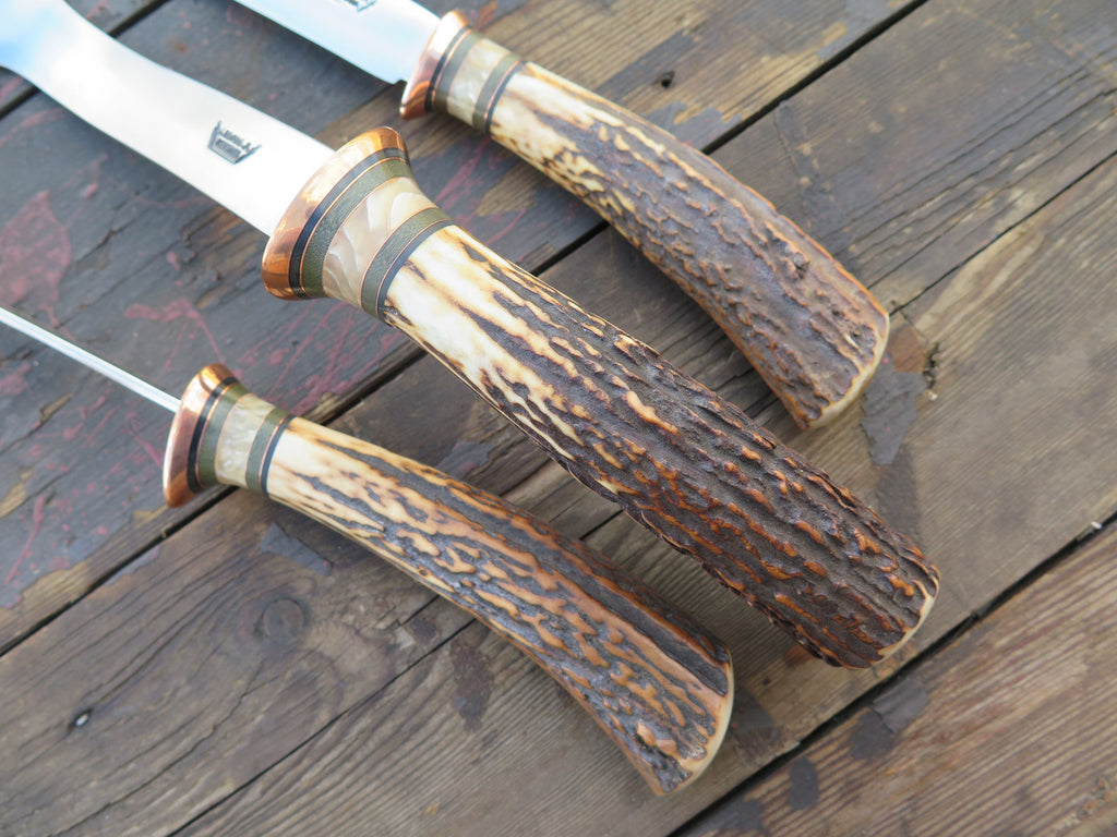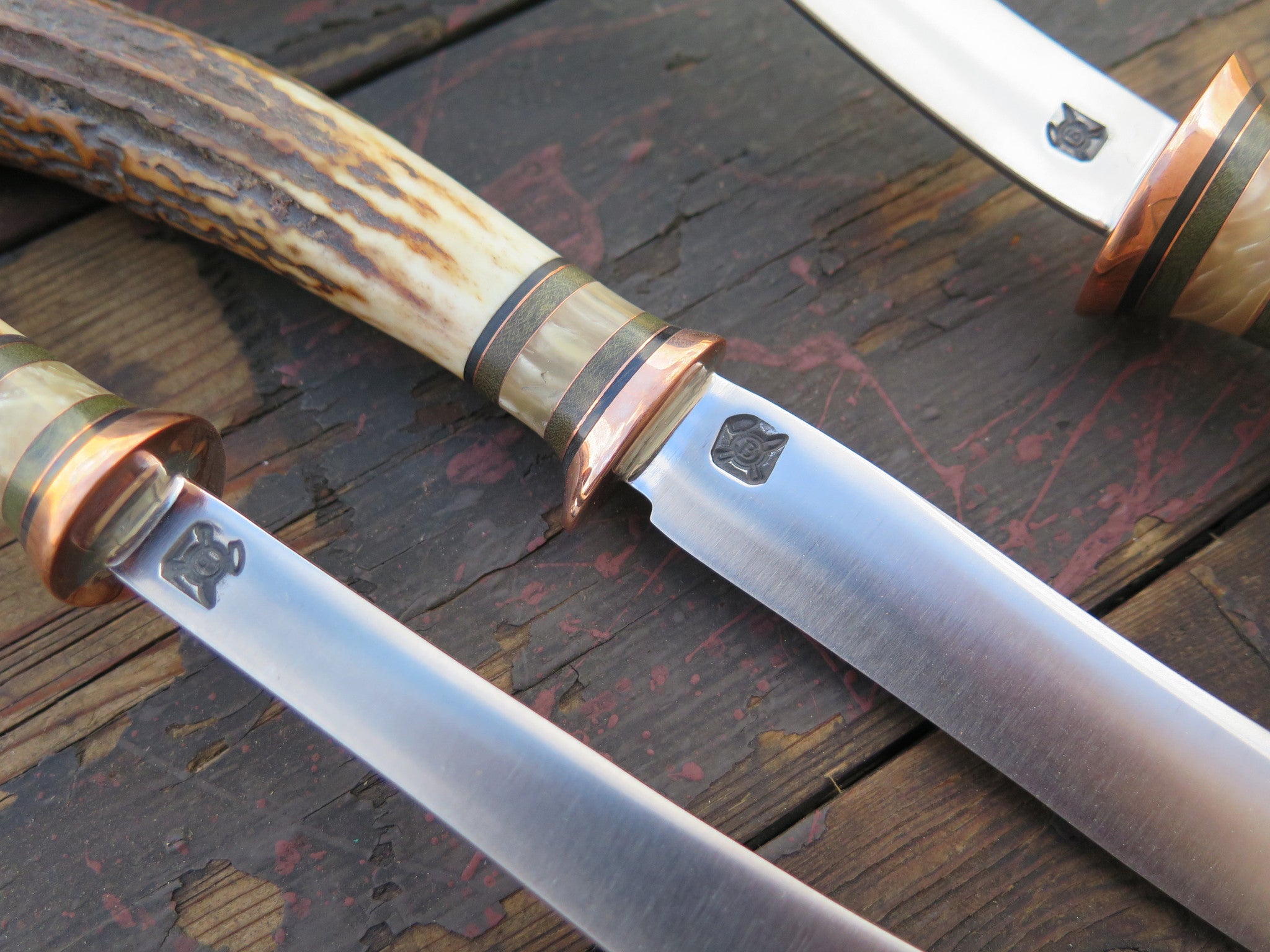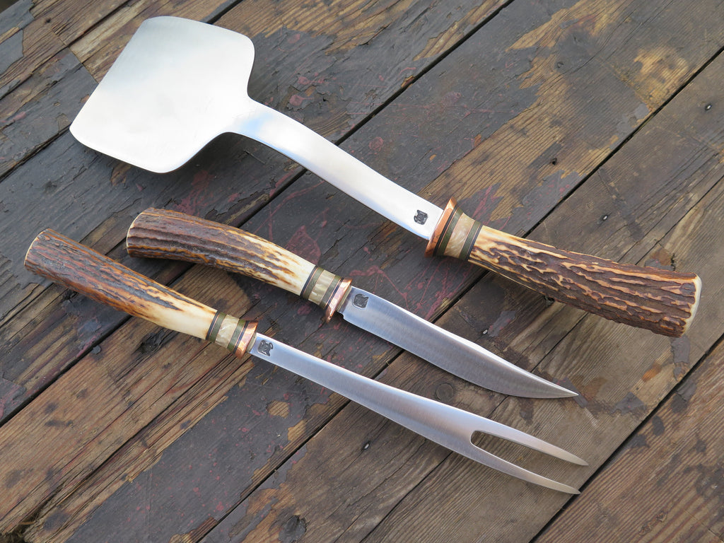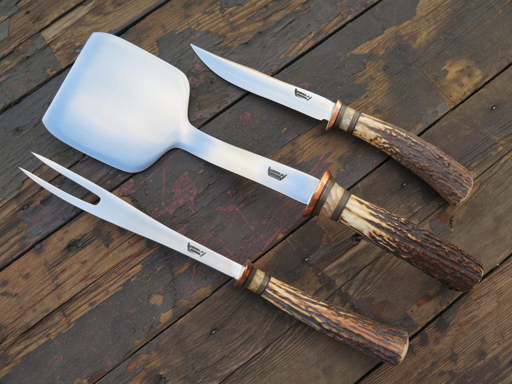 Take your BBQ game to the next level with the 100% handmade Behring Made BBQ set. Featuring forged 440c stainless steel, the fork, knife and spatula measure 8 1/4", 6" and 9 3/4" from tip to guard. The copper guard is soldered in place above black, green, copper and musk ox boss spacers as well as premium red tone sambar stag handles, each with a remarkable bark. The overall lengths measure 13 3/4" (fork), 11 1/4" (knife) and 15 1/4" (spatula). These truly are incredible tools!