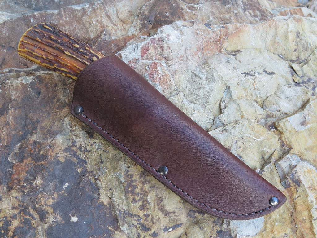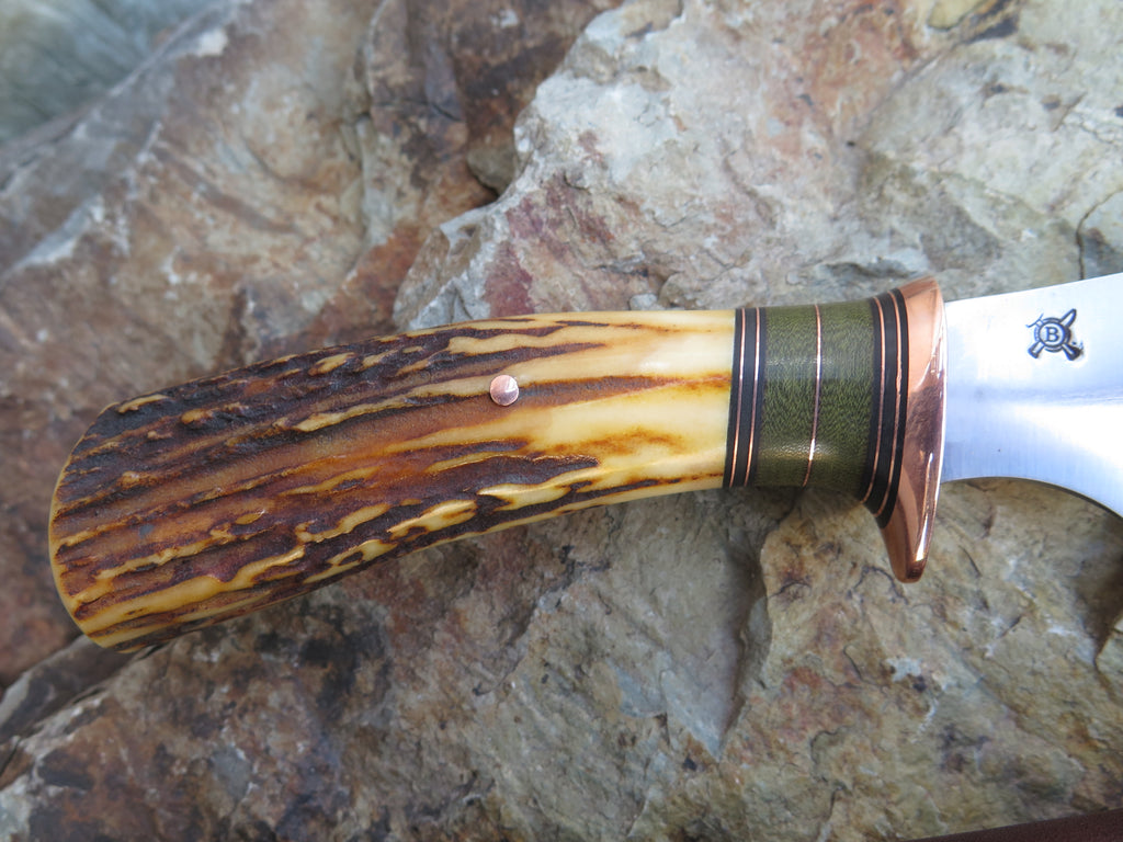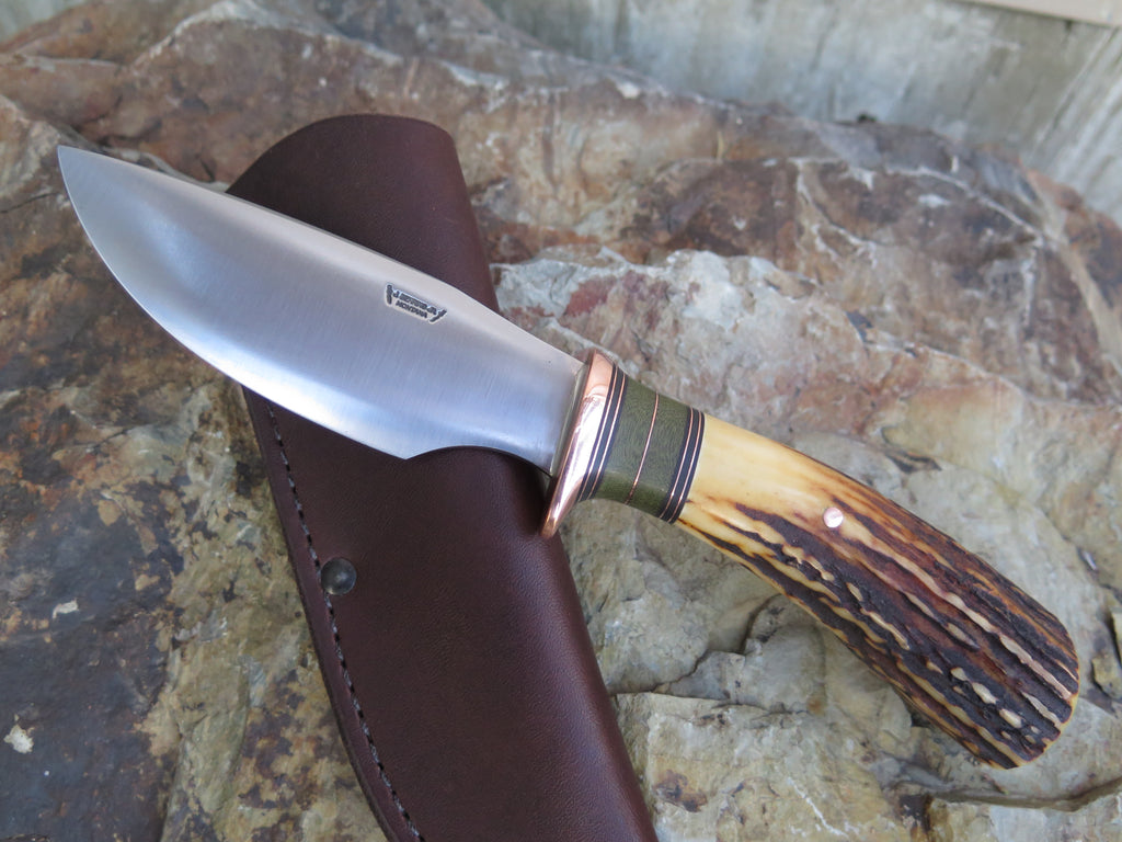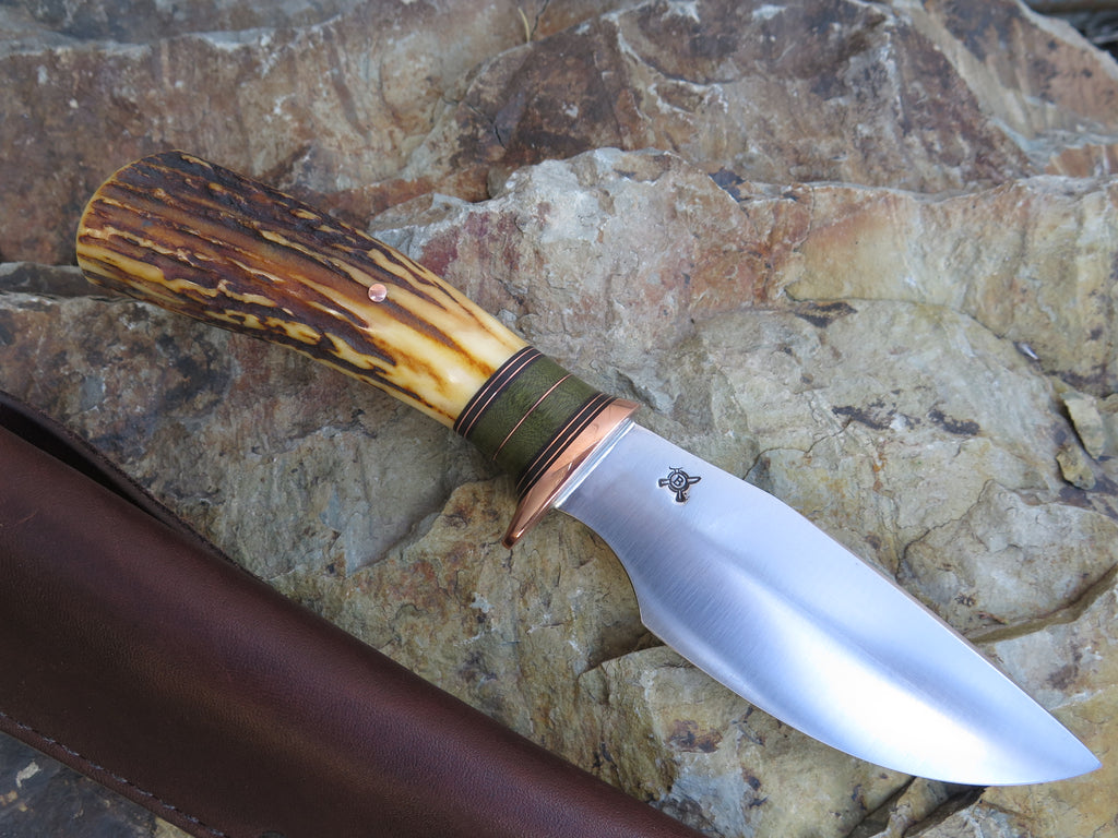 This outstanding new Alaskan from Behring Made™ is hand forged from 3/16” thick high carbon 01 tool steel and it measures 4 3/4” from tip to guard with a razor sharp convex grind that'll make quick work of the biggest game. The copper guard is soldered in place above black fiber, copper and green micarta spacers with a beautiful sambar stag that that we pinned with copper. The overall length measures 9 3/8” and it comes in a classic Warlander Leather pouch sheath.