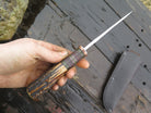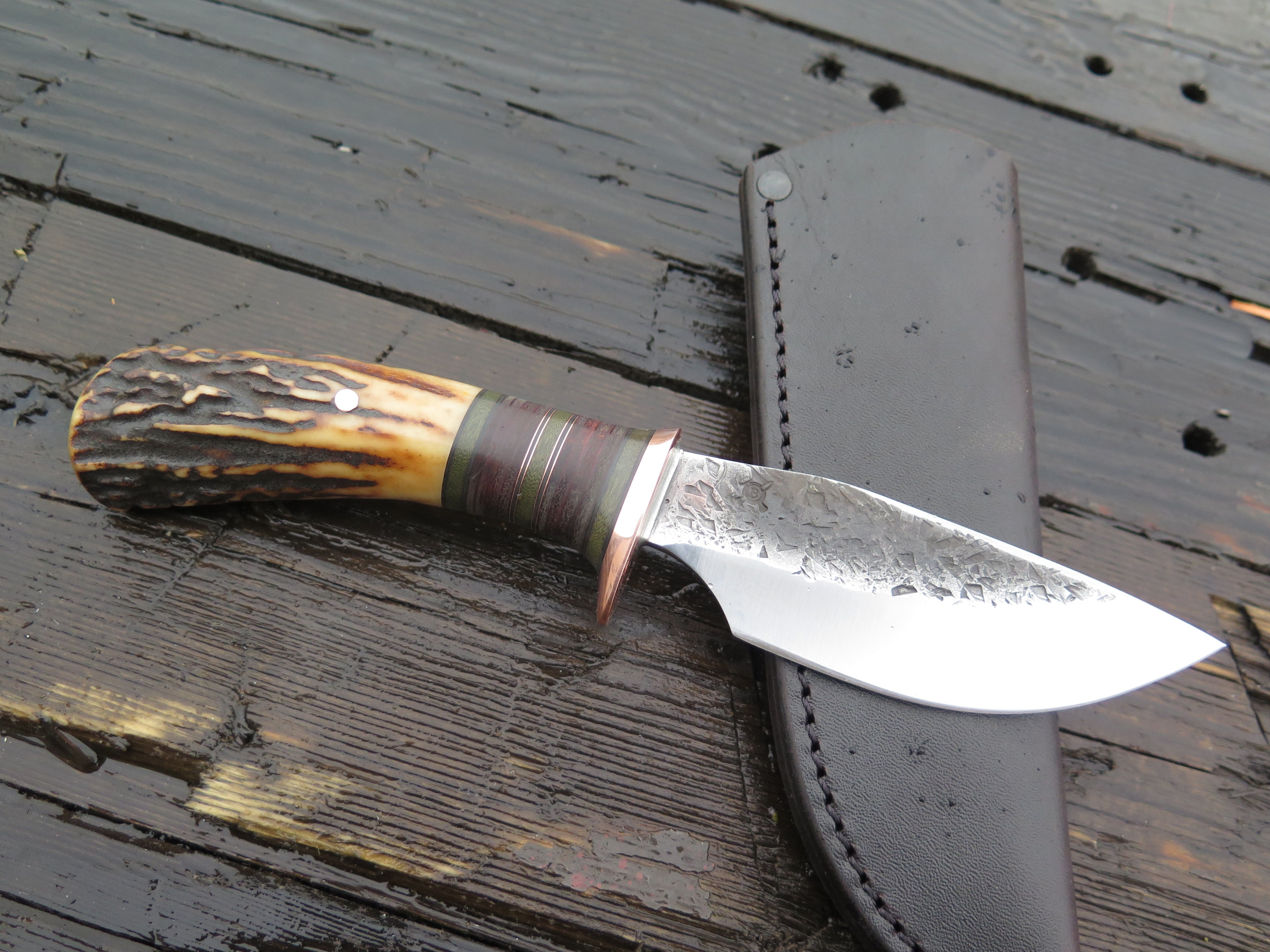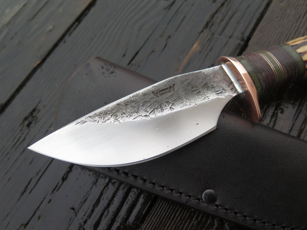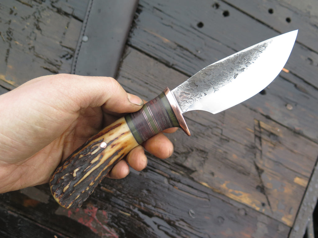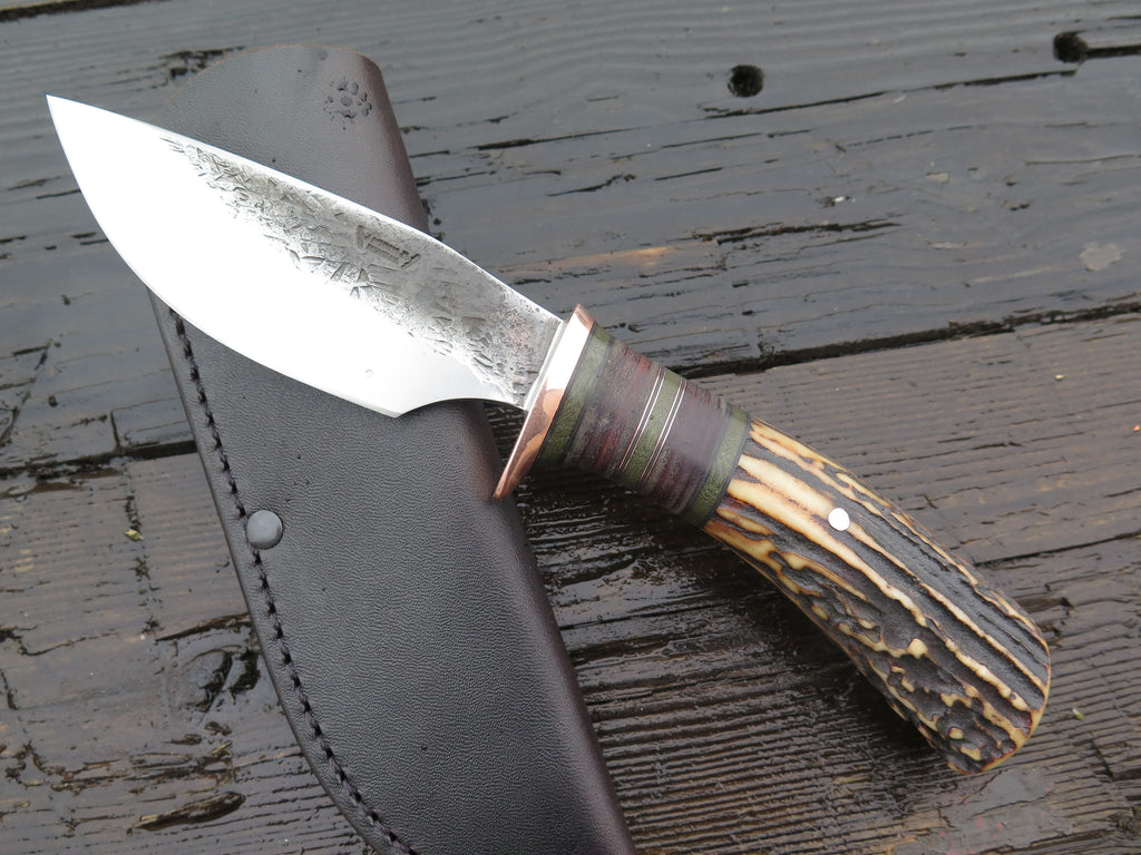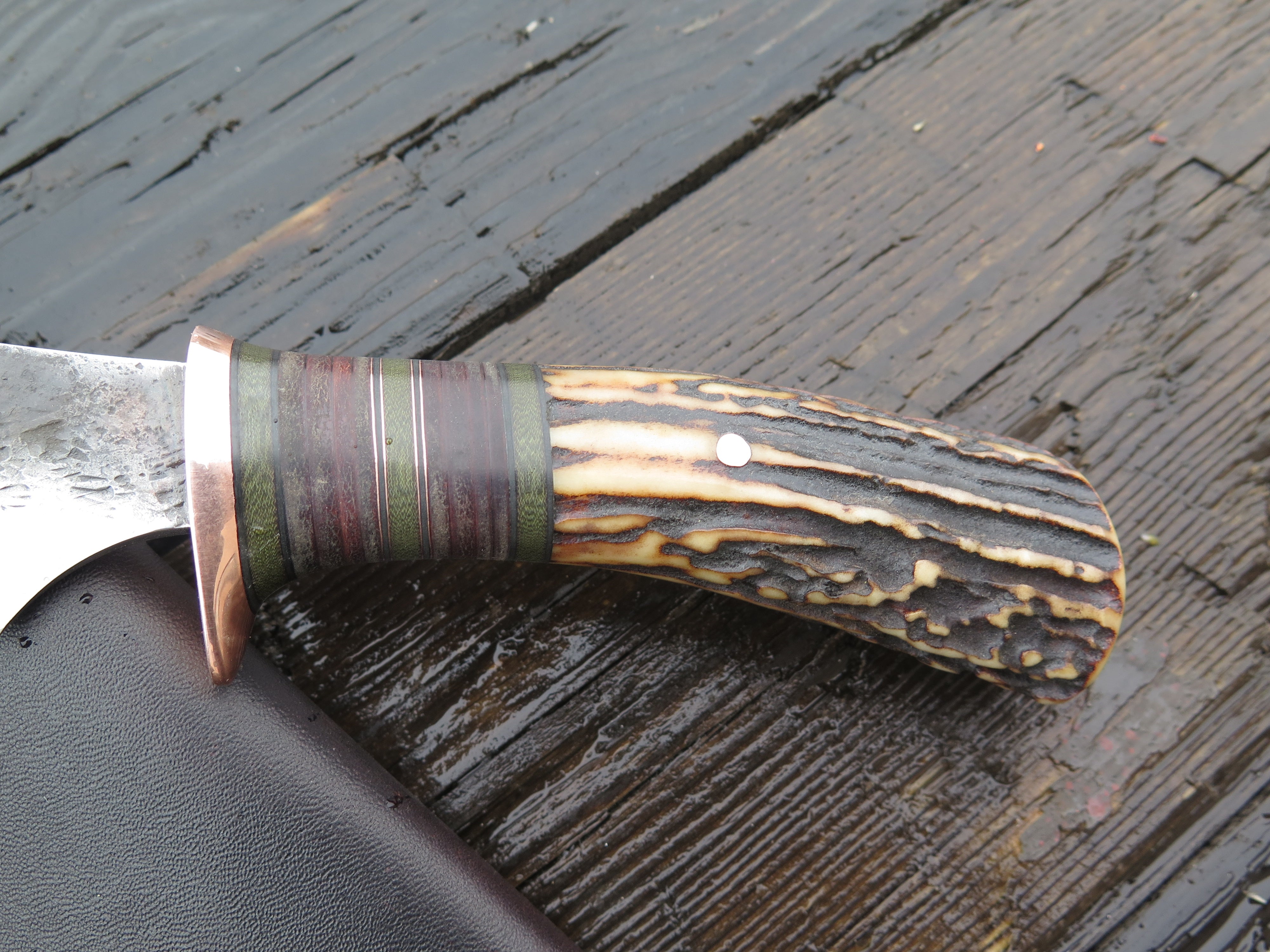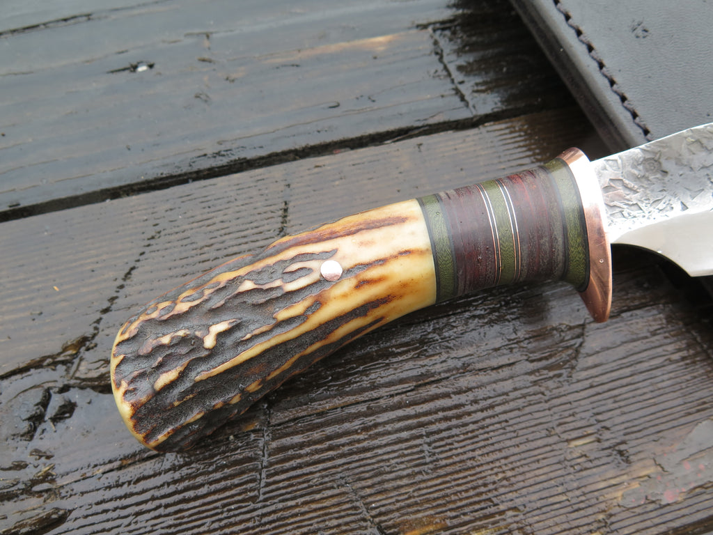 This new Alaskan from Behring Made© is hand forged from 3/16" thick high carbon 01 tool steel and it measures 4 1/2" from tip to guard with a razor sharp hollow grind and a hammermark finish. The copper guard is soldered in place above black and maroon fiber, copper, green micarta and horsehide leather spacers as well as a truly exhibition grade sambar stag handle that we've pinned through the tang with copper. The overall length measures 9" and this one comes in a classic pouch sheath from Warlander Leather.