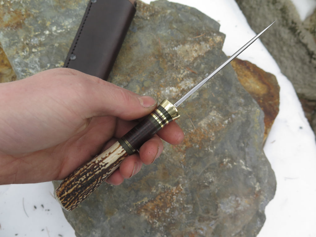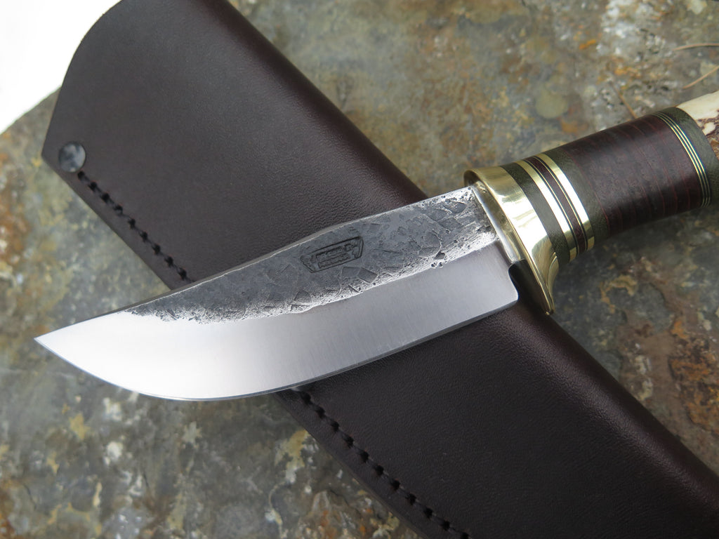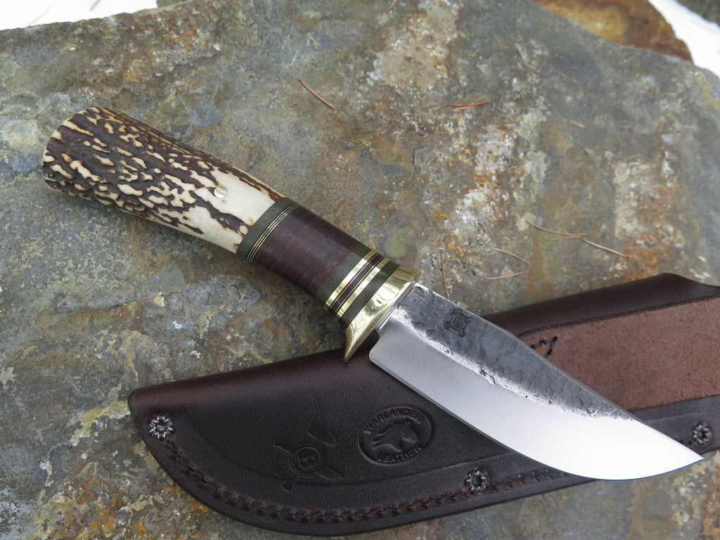 This new Hunter from Behring Made© is hand forged from 1/8" thick high carbon 01 tool steel and it measures 4" from tip to guard with a razor sharp hollow grind and our hammermark finish. The brass guard is soldered in place above black fiber, brass, green and brown micarta and horsehide leather spacers as well as a premium sambar stag handle that pinned with brass. The overall length measures 8 3/4" and it comes in a classic leather brown pouch sheath.
