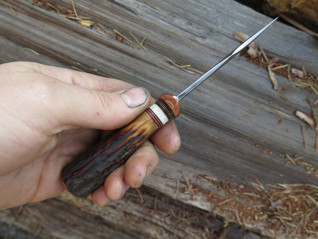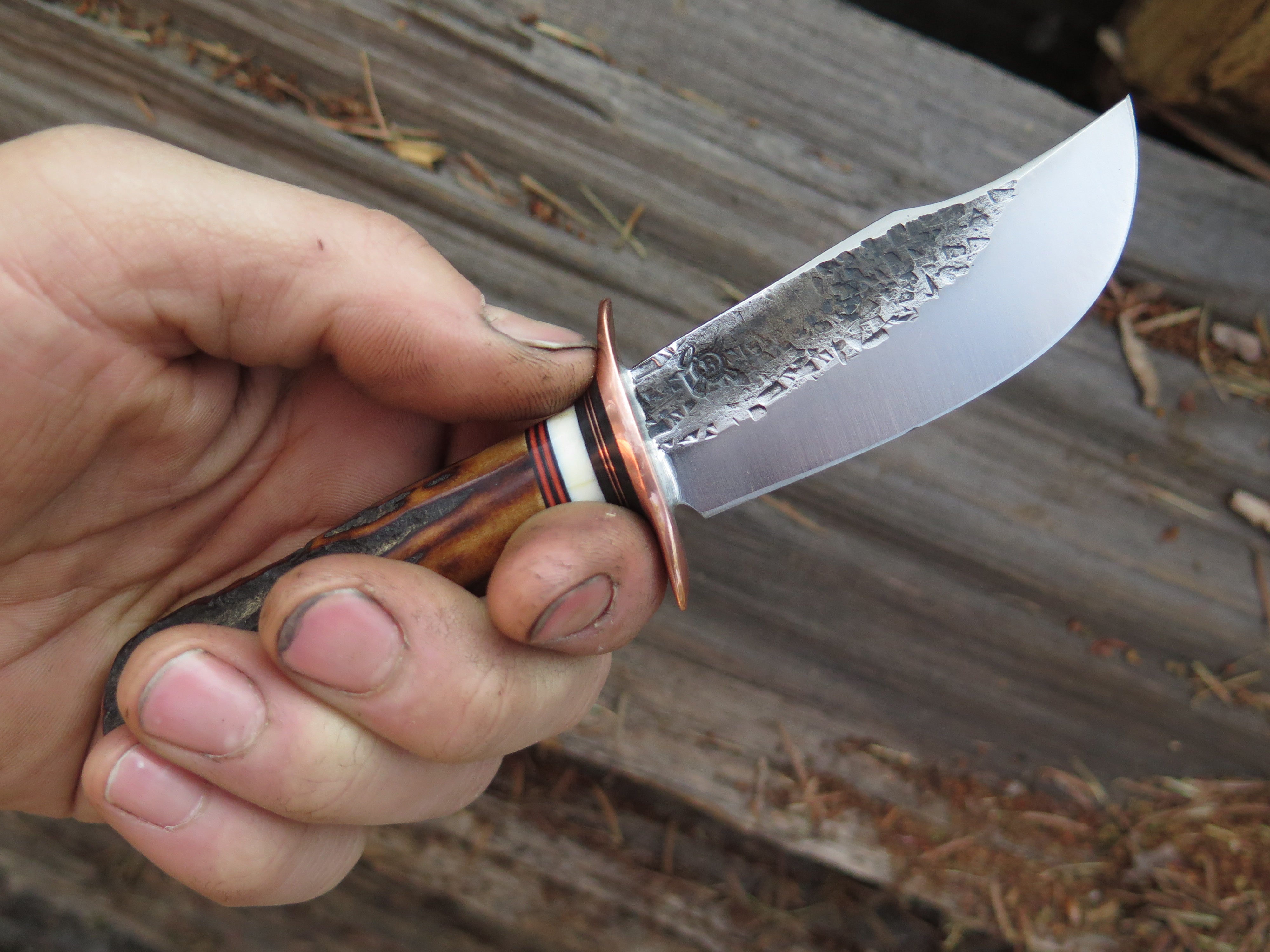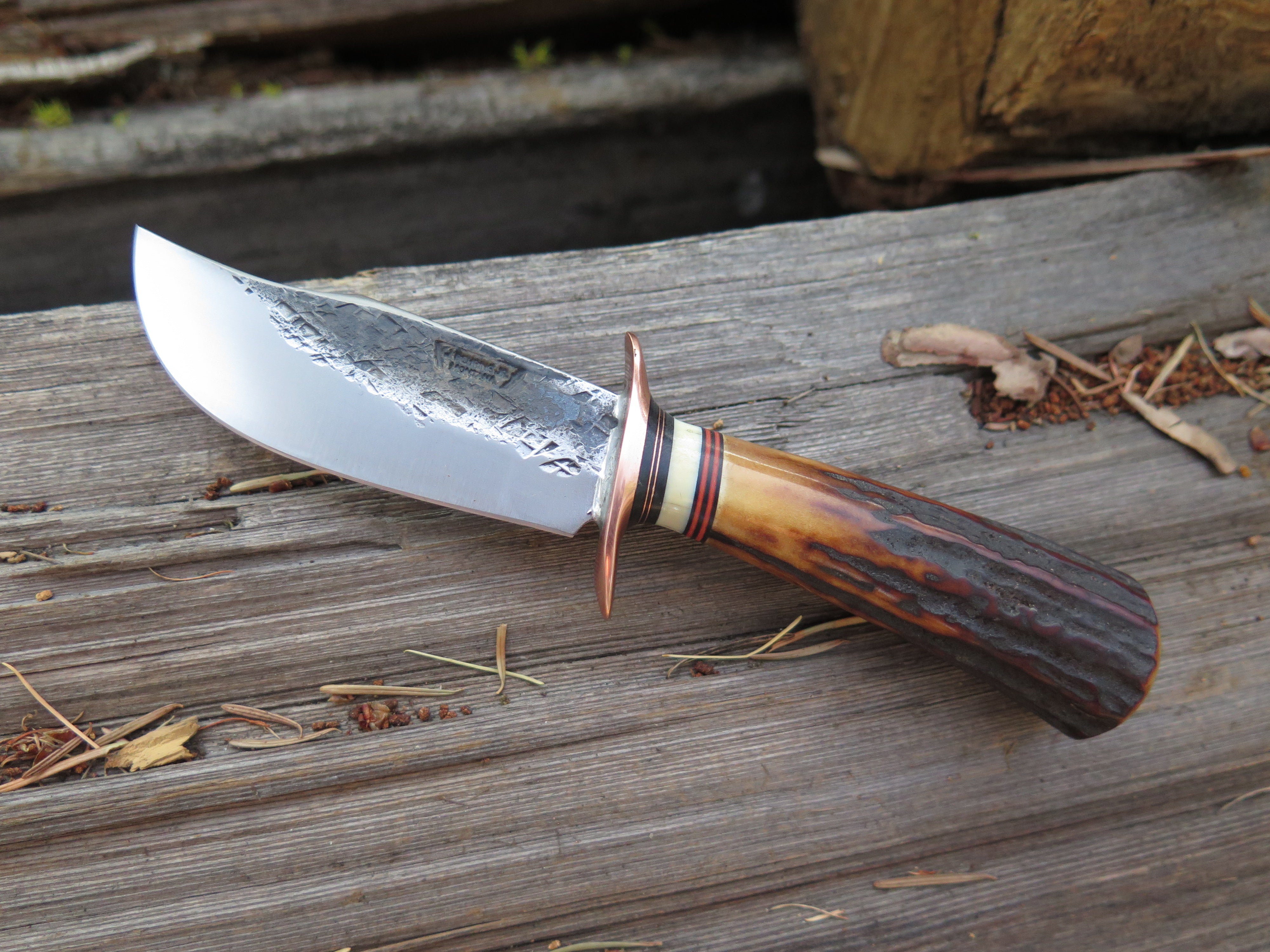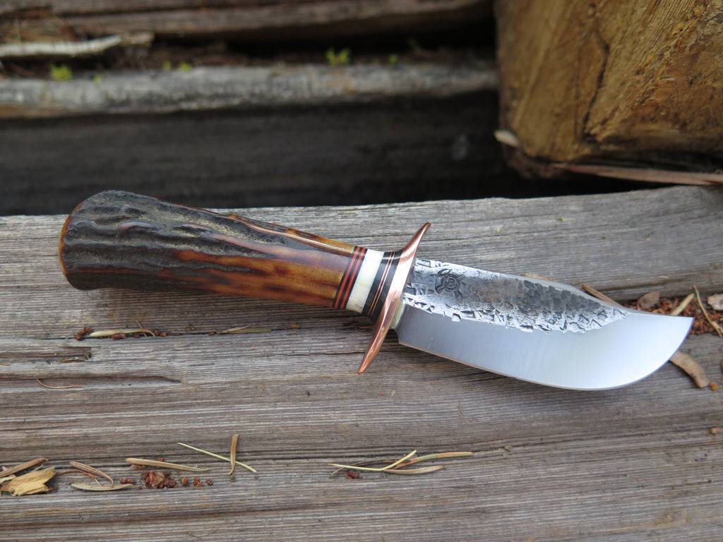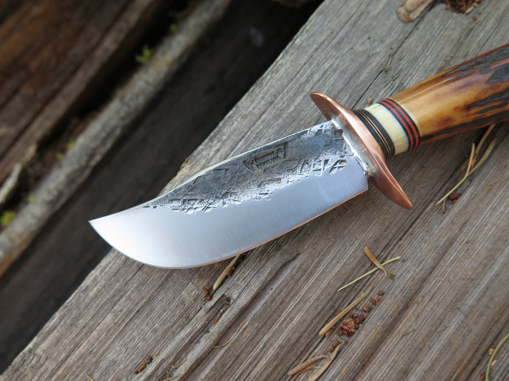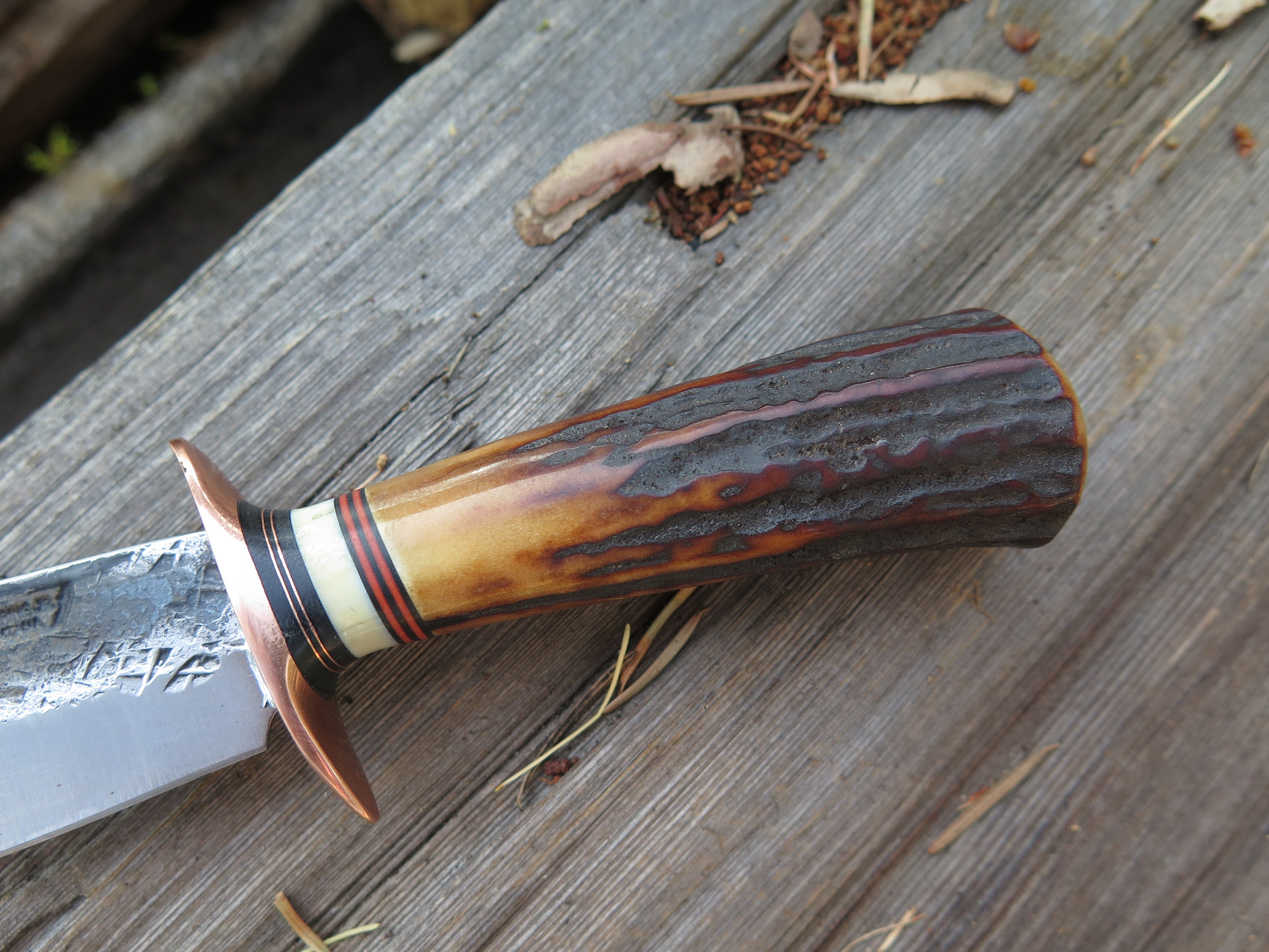 This new one from Behring Made© is the Little Bowie, but the personality is anything but small! The blade is hand forged from 1/8" thick high carbon 01 tool steel and it measures 3" from tip to guard with a razor sharp hollow grind and our hammermark finish. The copper guard is soldered in place above black and maroon fiber, copper and mammoth ivory spacers in addition to a gorgeous piece of sambar stag. The sheath will be custom made by Warlander Leather, and we promise you'll love this one!