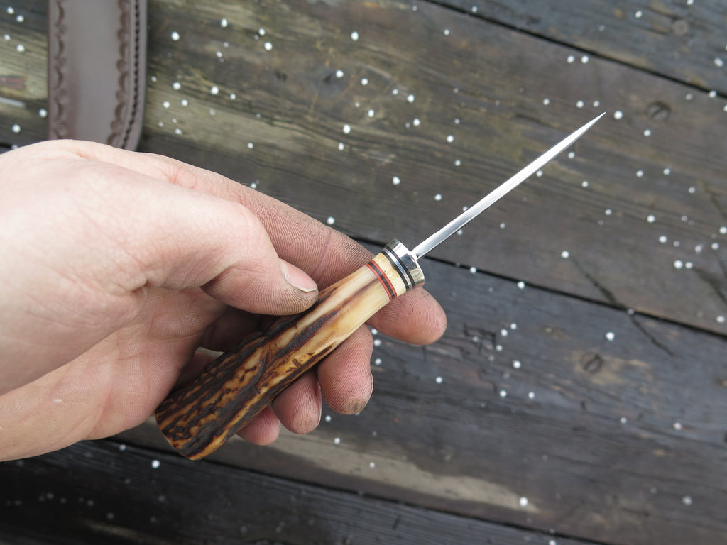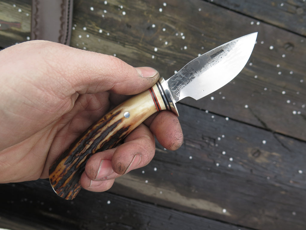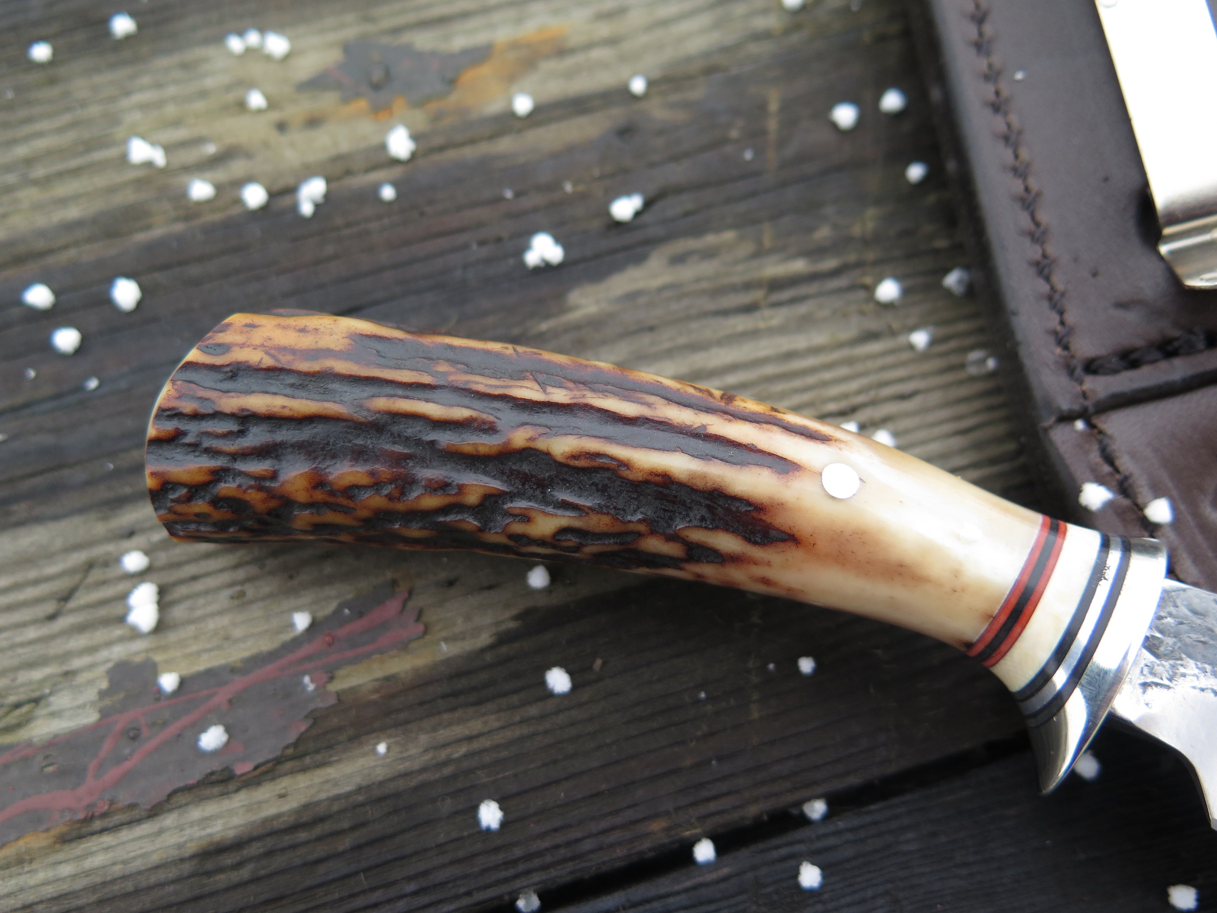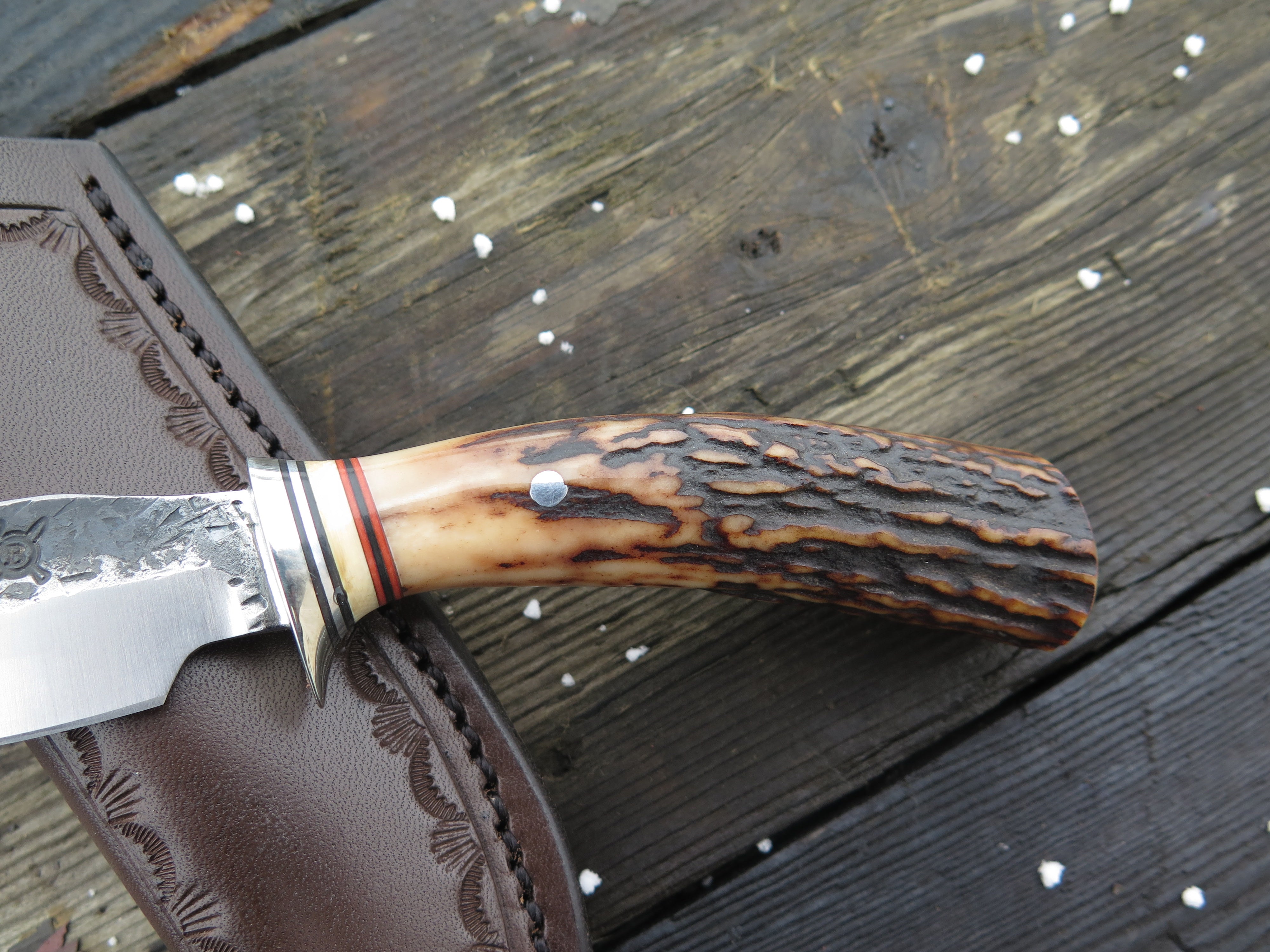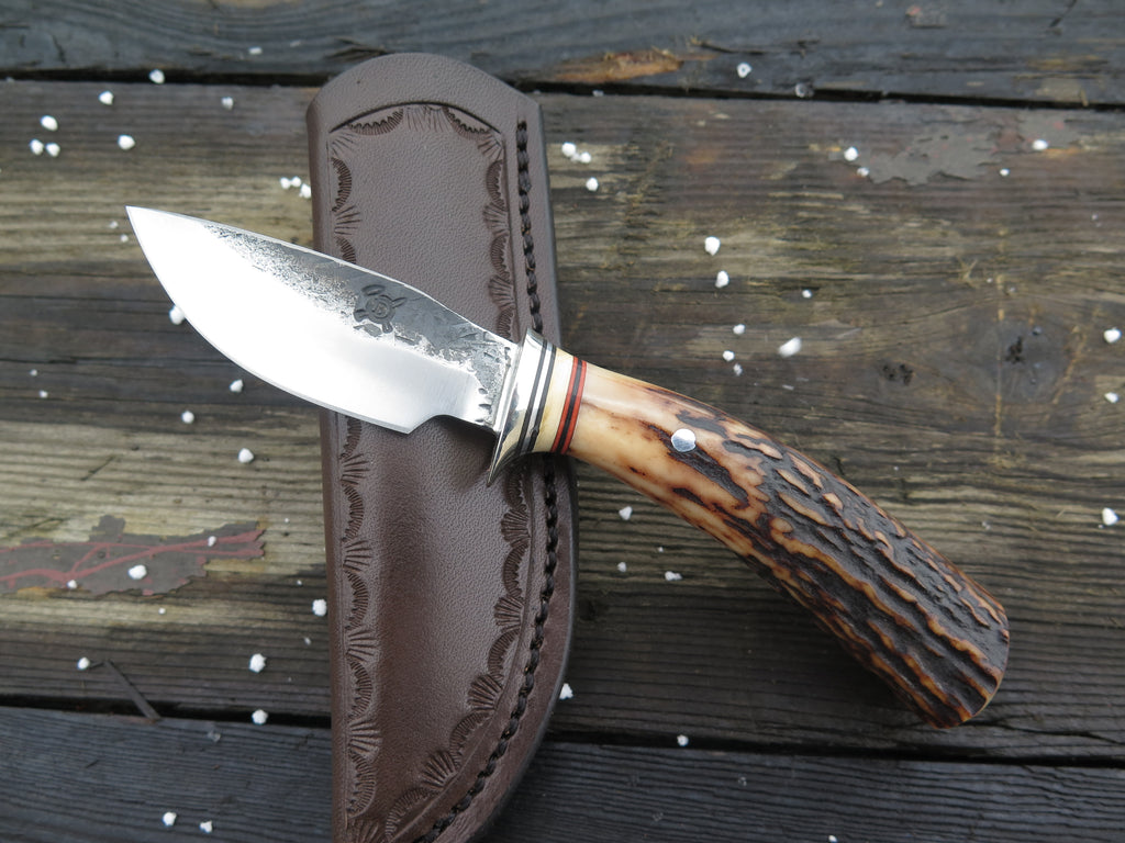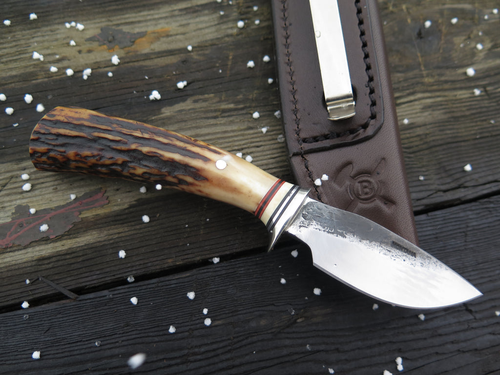 This beautiful new Alaskan pocket knife from Behring Made© would be a true joy to carry on a daily basis. The blade is hand forged from 1/8" thick high carbon 01 tool steel and it measures 2 1/2" from tip to guard with a razor sharp hollow grind and our hammermark finish. The nickel silver guard is soldered in place above black and maroon fiber, aluminum and mammoth ivory spacers in addition to the premium sambar stag handle. Overall length measures just over 6" and it comes in a right hand pocket clip sheath.